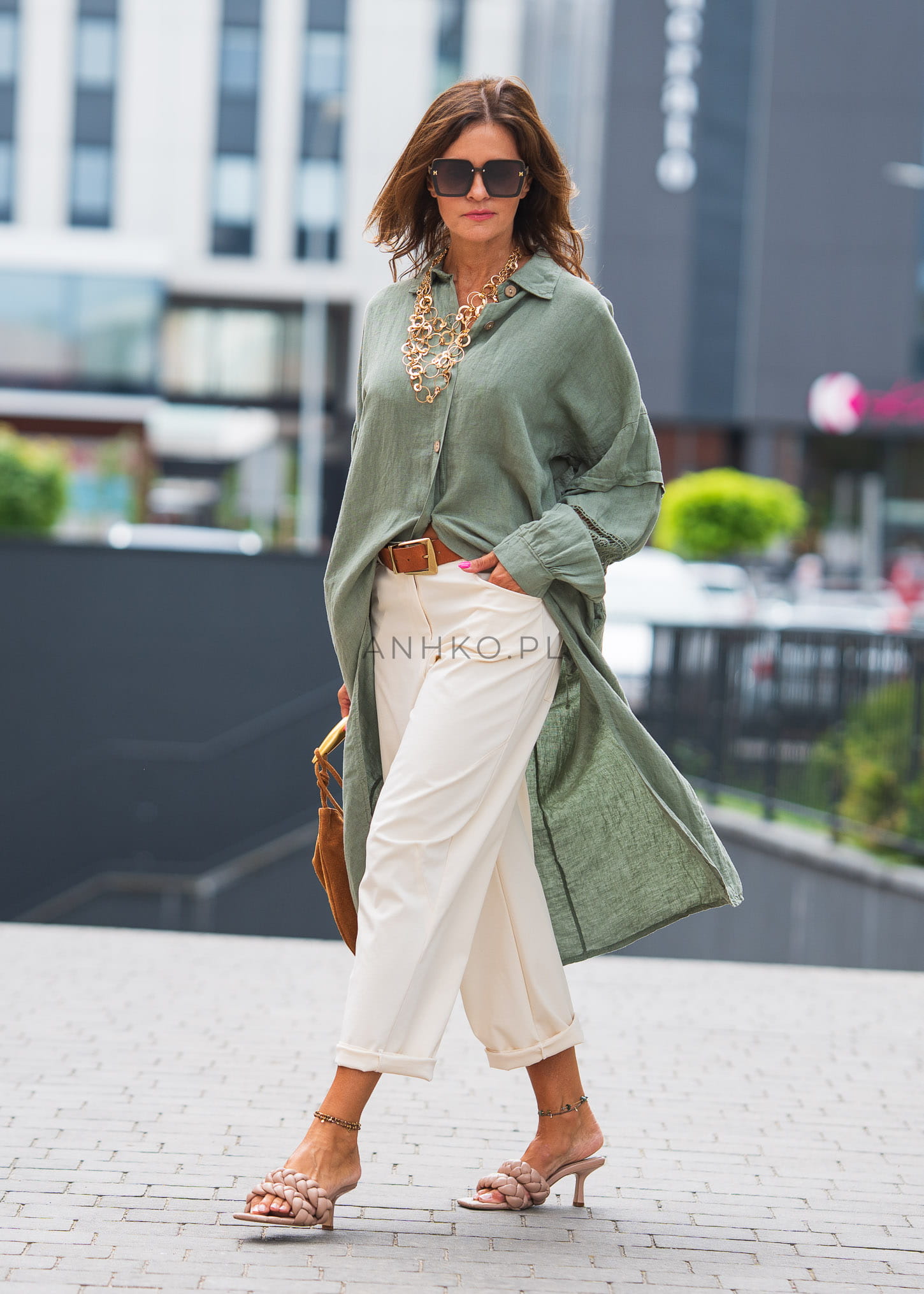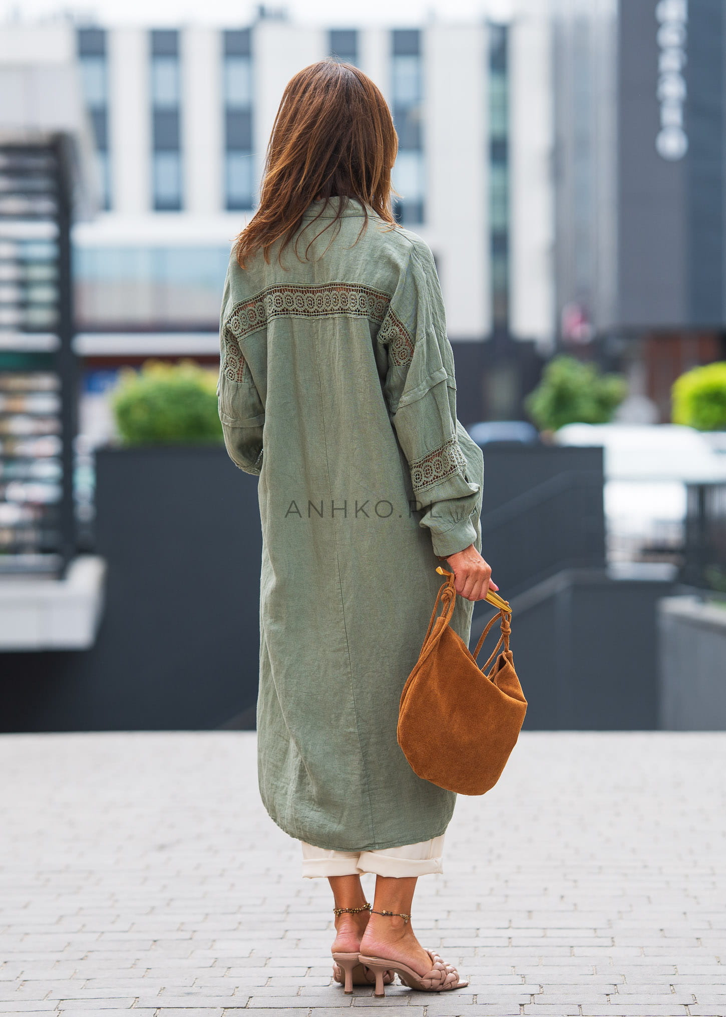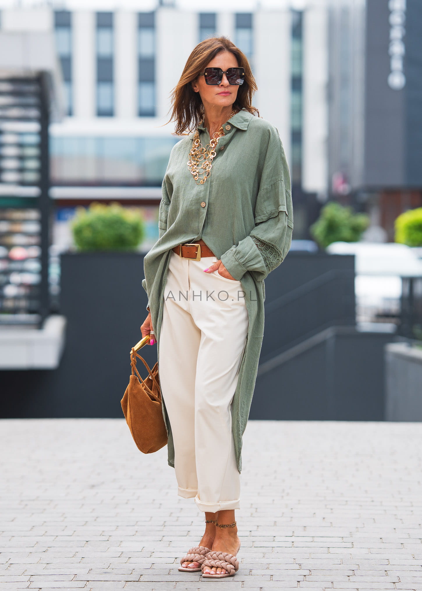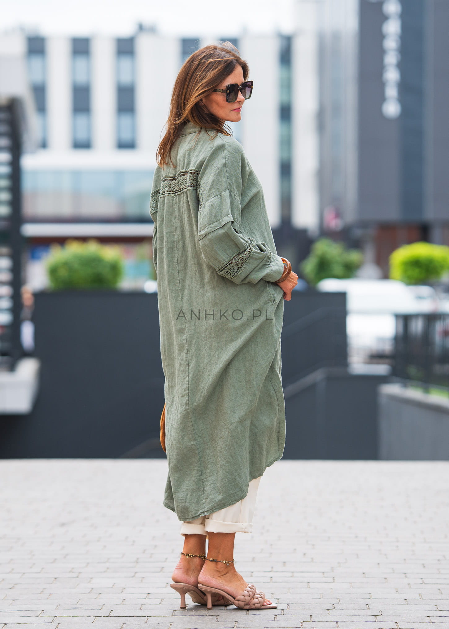 Koszula Estera Zielona - Ta elegancka koszula wykonana z wysokiej jakości lnu i bawełny to idealny wybór dla kobiet ceniących sobie komfort i styl. Dzięki subtelnym detalom z koronki, koszula nabiera wyjątkowego charakteru, który sprawdzi się zarówno w codziennych, jak i bardziej formalnych stylizacjach. Luźny fason zapewnia swobodę ruchów, a naturalne materiały gwarantują komfort noszenia przez cały dzień.