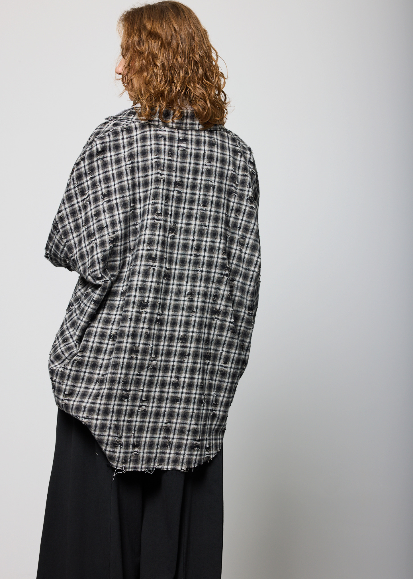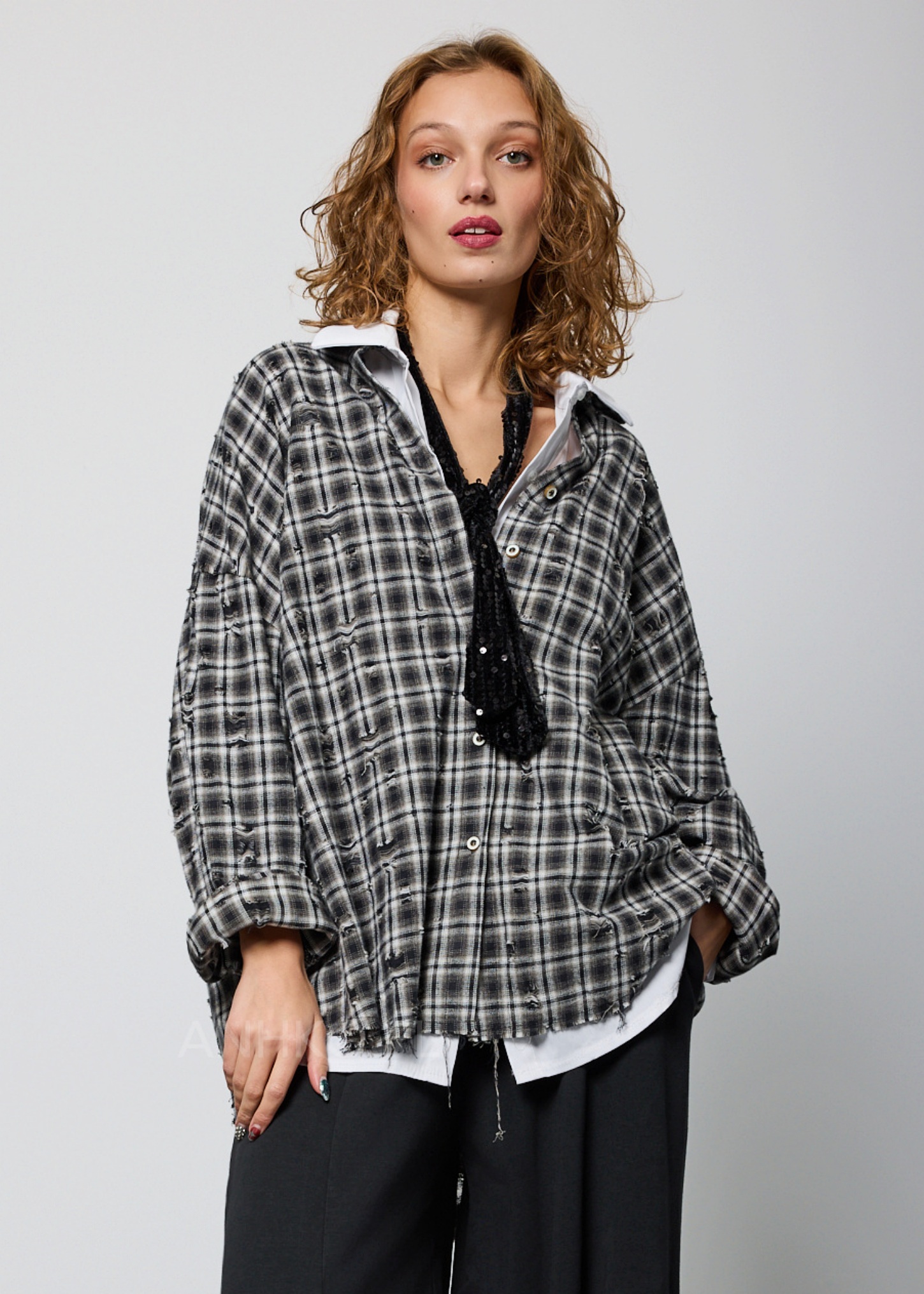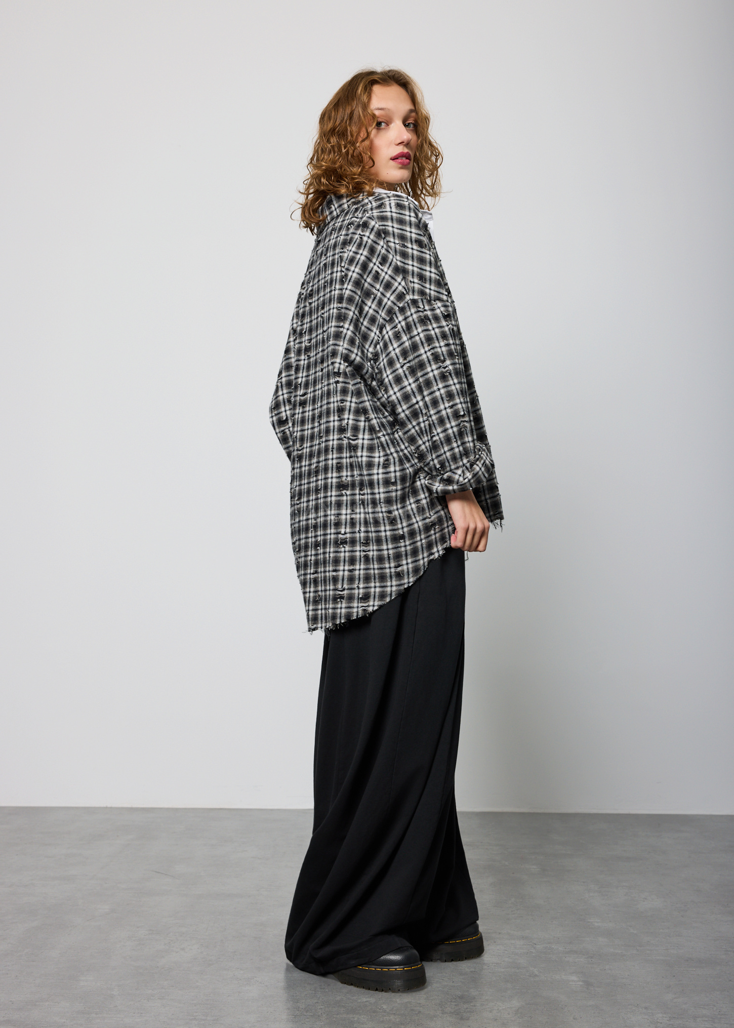 Ta koszula w kratę damska to model, który przyciąga uwagę swoim artystycznym wykończeniem i luźnym, miejskim charakterem. Oversize’owy fason sprawia, że materiał swobodnie układa się na sylwetce, zapewniając wygodę oraz modny, nieformalny look. Delikatnie sprany wzór w czarno-szarej kratce oraz ozdobne przetarcia w stylu vintage nadają całości wyrazistego charakteru.