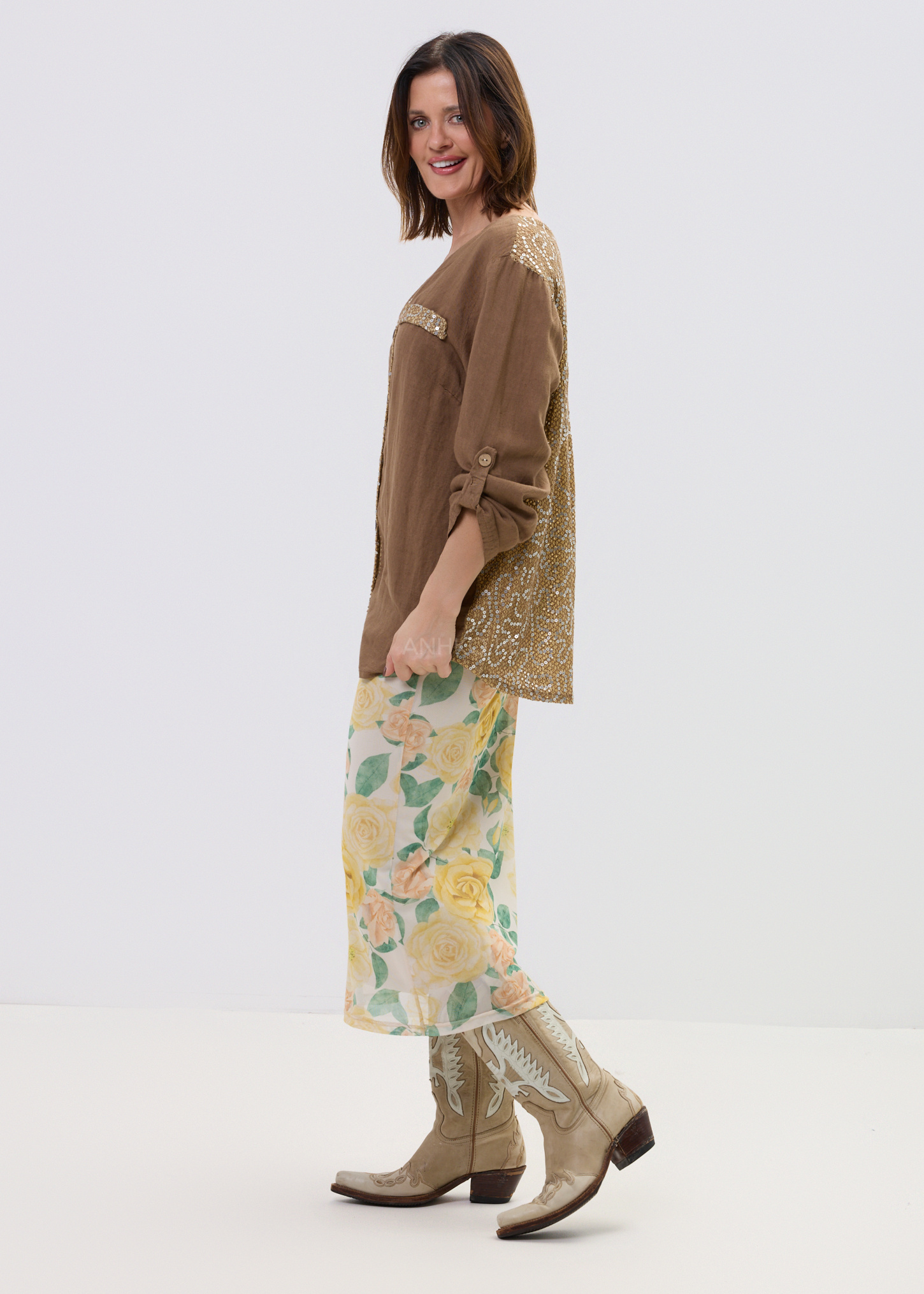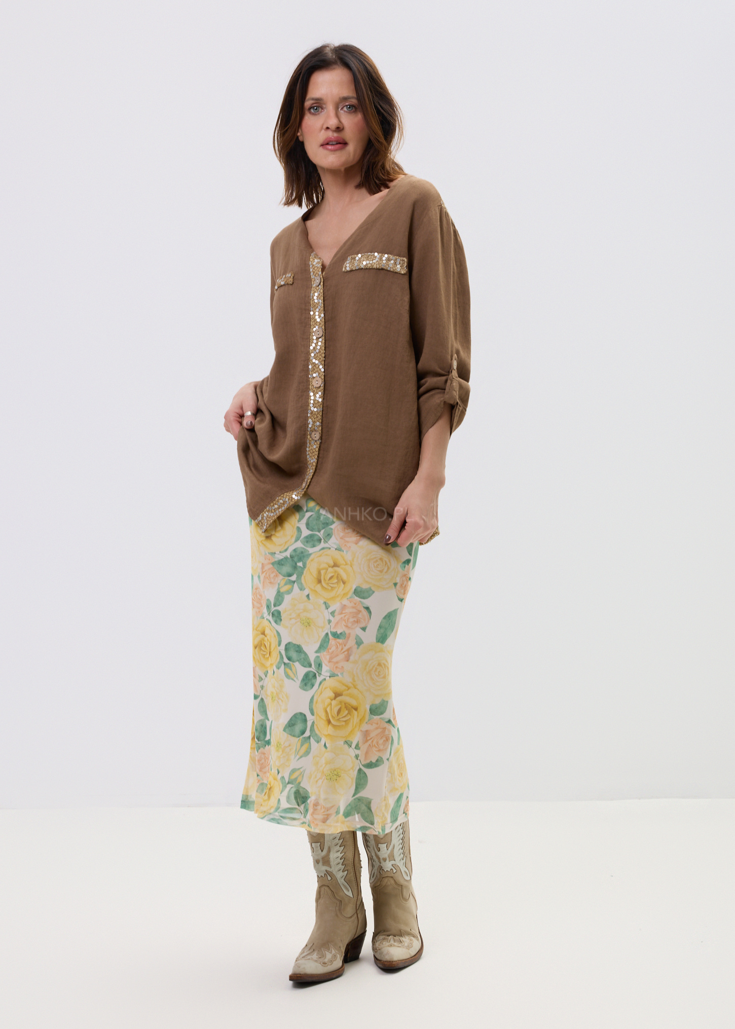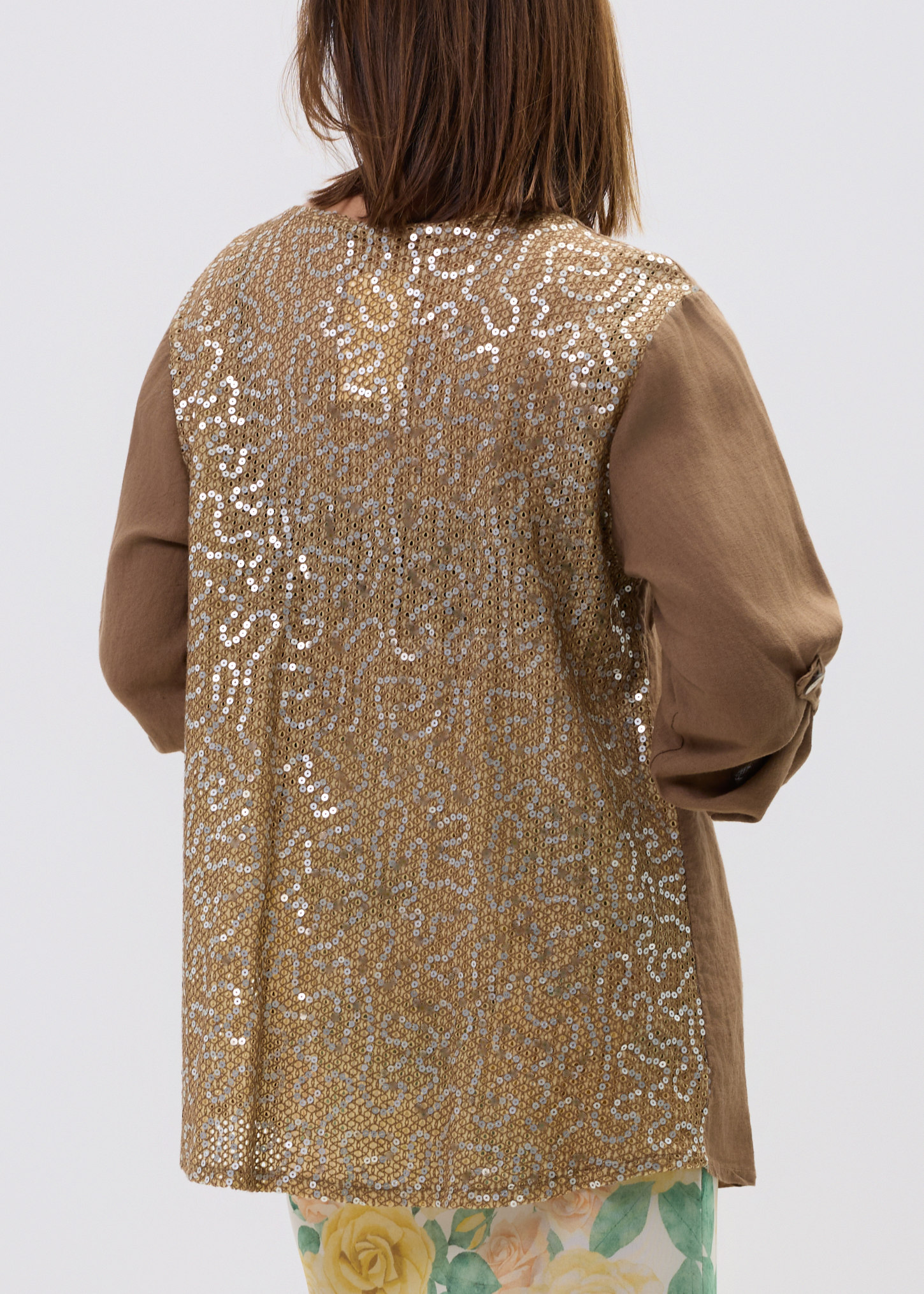 Z przodu subtelne kieszonki zdobione cekinami dodają charakteru, natomiast efektowny, cekinowy panel na plecach przyciąga spojrzenia i nadaje całości unikalnego stylu. Podwijane rękawy z możliwością podpięcia zwiększają funkcjonalność i pozwalają dopasować look do okazji – od codziennych stylizacji po bardziej wyraziste zestawy.
