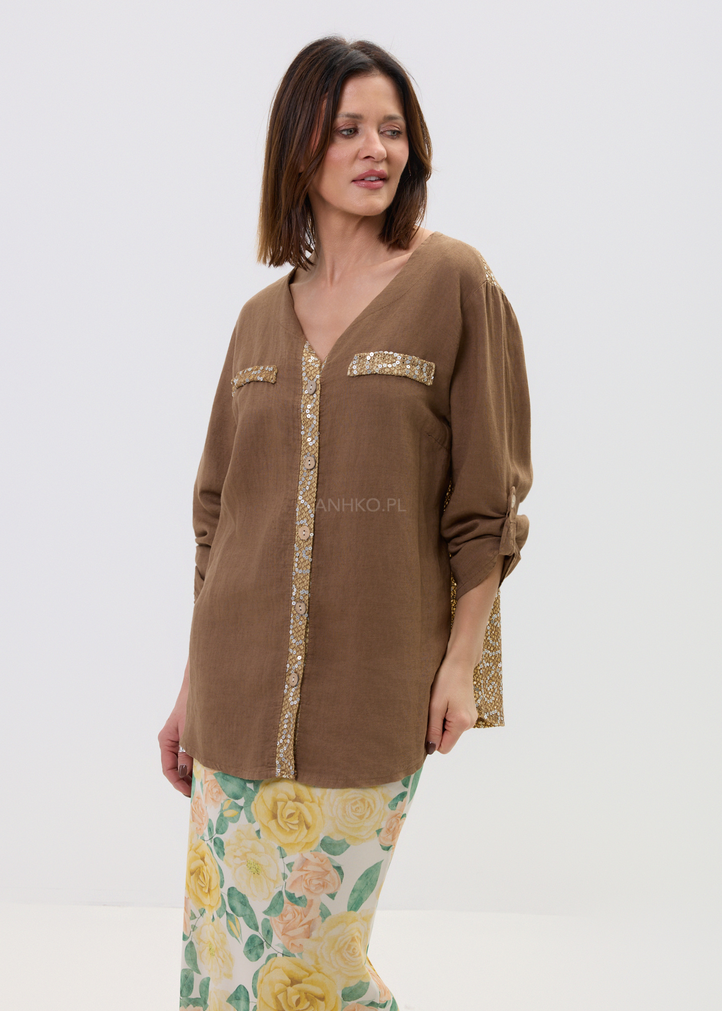 - Dekolt: V-neck z ozdobną listwą guzików, optycznie wysmuklający szyję.