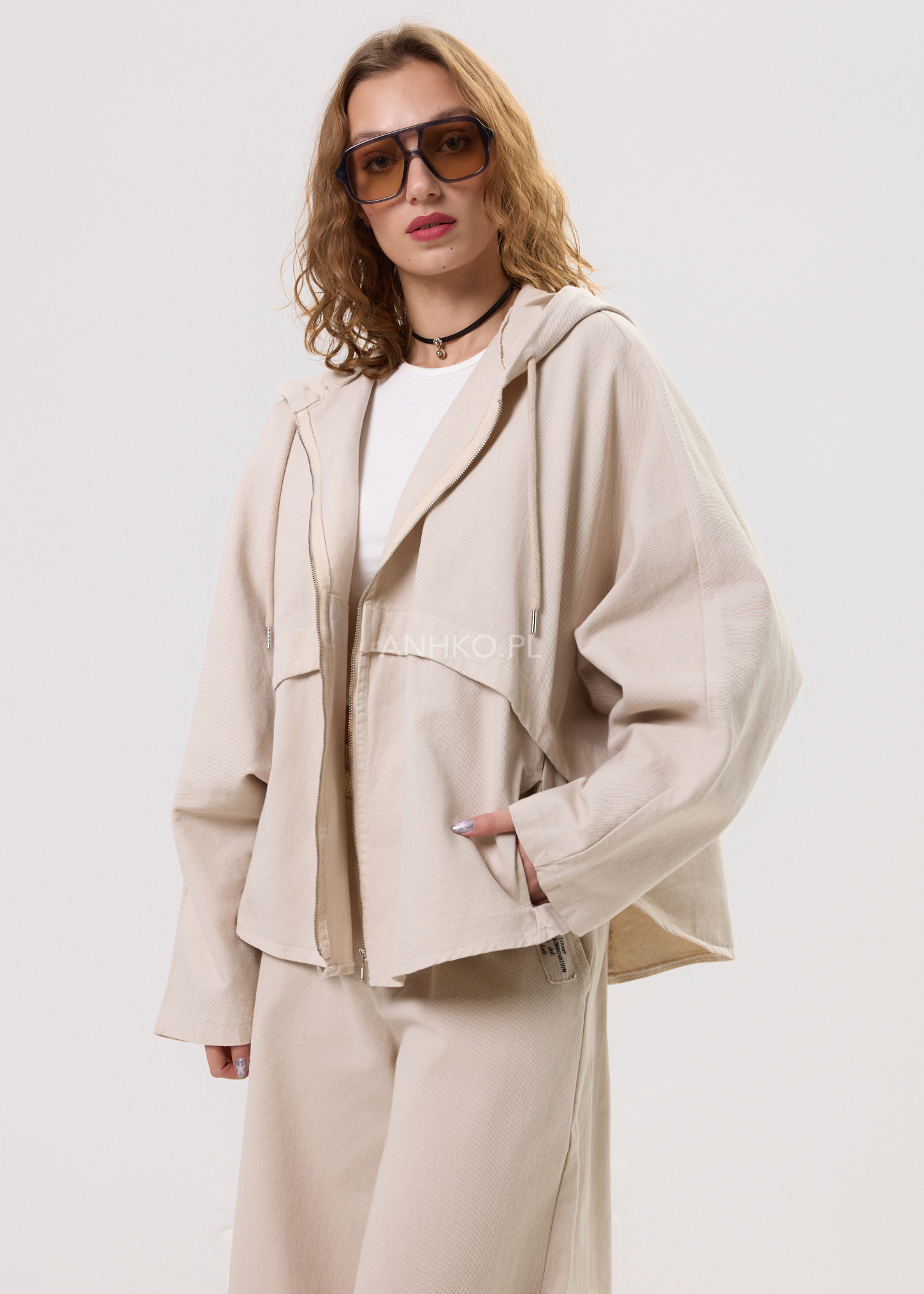 Ta kurtka damska o swobodnym, oversize’owym fasonie miękko układa się na sylwetce, tworząc nowoczesną, lekko architektoniczną linię. Obniżona linia ramion i szerokie rękawy nadają jej wyrazistego charakteru, a długość do bioder zapewnia proporcjonalne wykończenie całości. Model zapinany na suwak z kapturem to funkcjonalna baza w duchu miejskiego minimalizmu.
