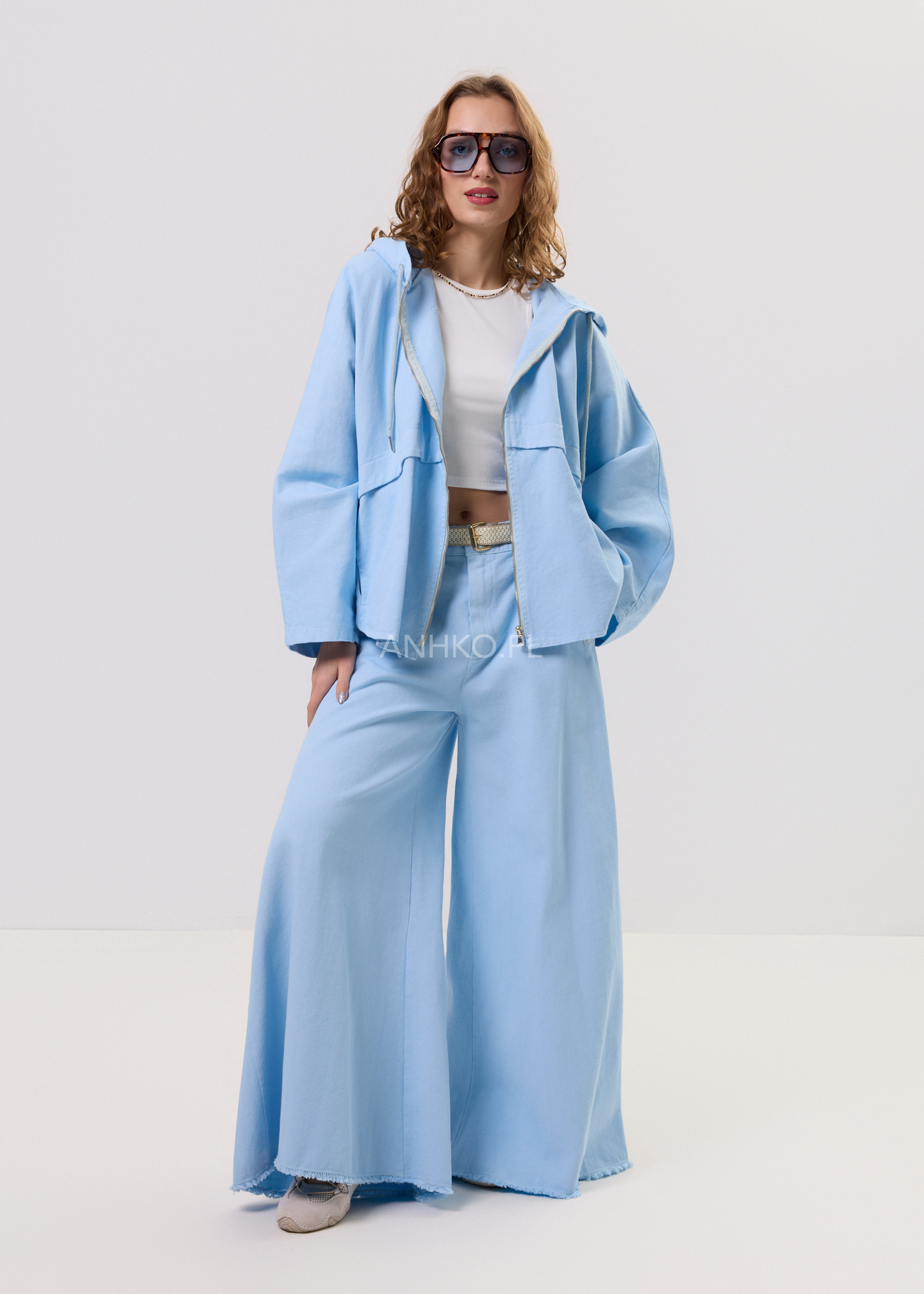 Spodnie Deseret Flow Błękitne - Błękitne spodnie o luźnym, oversize’owym kroju z szeroką nogawką i paskiem w komplecie. Komfortowy fason z gumką z tyłu i klasycznym zapięciem z przodu. Idealne na co dzień i do bardziej dopracowanych stylizacji.