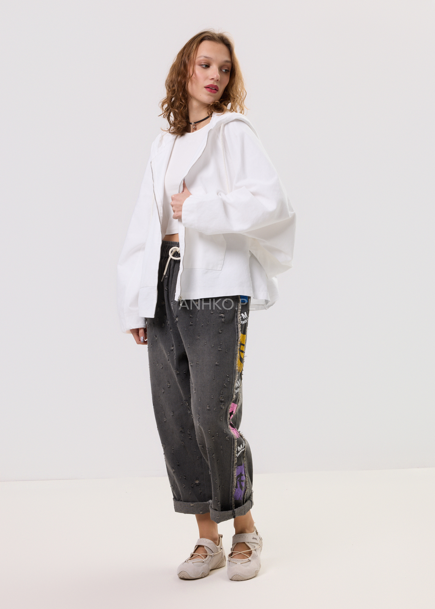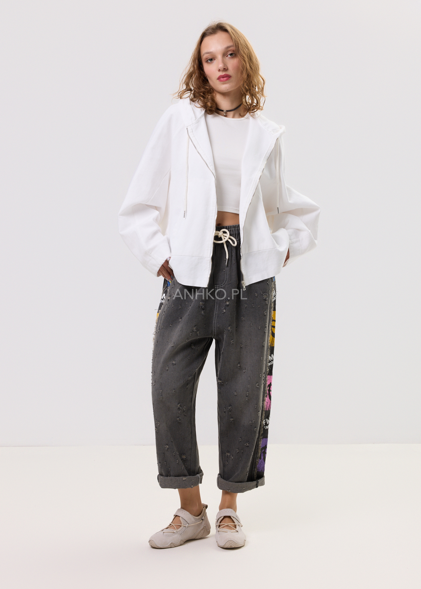 Jeansy Distressed Joggers - Stylowe i wygodne jeansowe joggery z efektem przetarcia i designerskimi nadrukami po bokach. Połączenie miejskiego stylu z luzem sprawia, że to doskonały wybór na co dzień. Wygodny elastyczny pas i troczki zapewniają idealne dopasowanie.