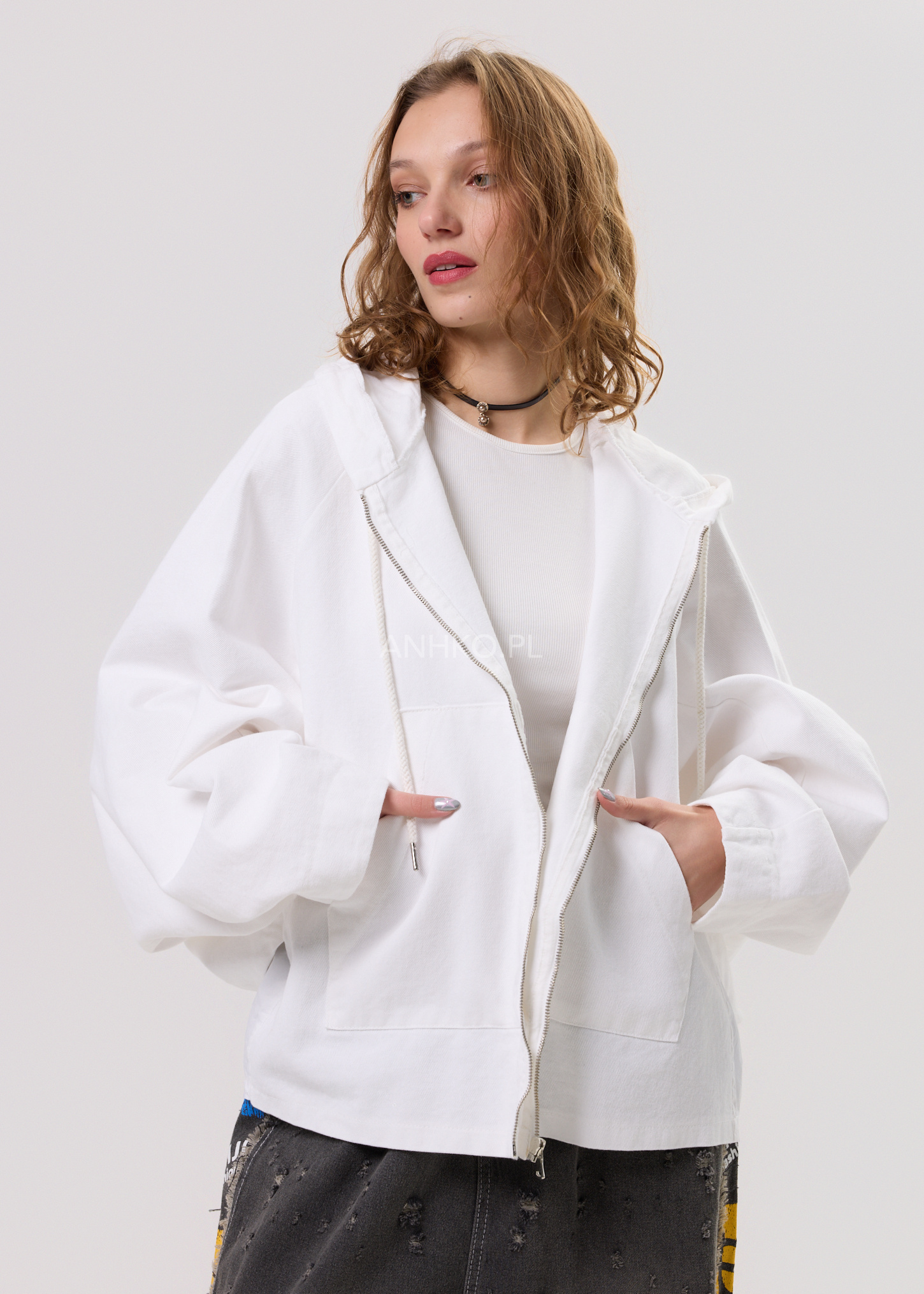 Ta kurtka damska o luźnym kroju oversize swobodnie układa się na sylwetce, tworząc wyrazistą, nowoczesną linię. Szerokie rękawy nadają jej charakteru, a krótka długość do bioder świetnie współgra z wysokim stanem spodni lub spódnicą. Biała kolorystyka podkreśla minimalistyczny styl i pozwala budować mocne, kontrastowe zestawy.