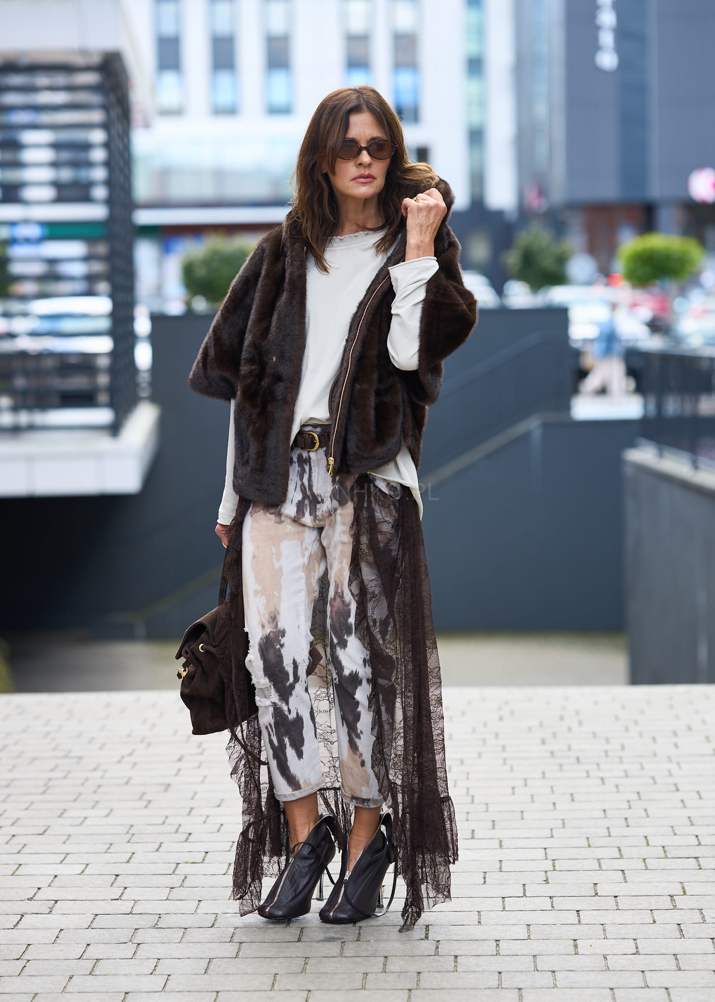 Spodnie Veloren Brązowo-Beżowe - Denimowe spodnie tie-dye z brązową koronkową warstwą zewnętrzną. Połączenie surowego charakteru jeansu z romantycznym detalem sprawia, że każda stylizacja nabiera wyjątkowego stylu. Z praktycznymi kieszeniami, idealne dla odważnych i niebanalnych zestawień.