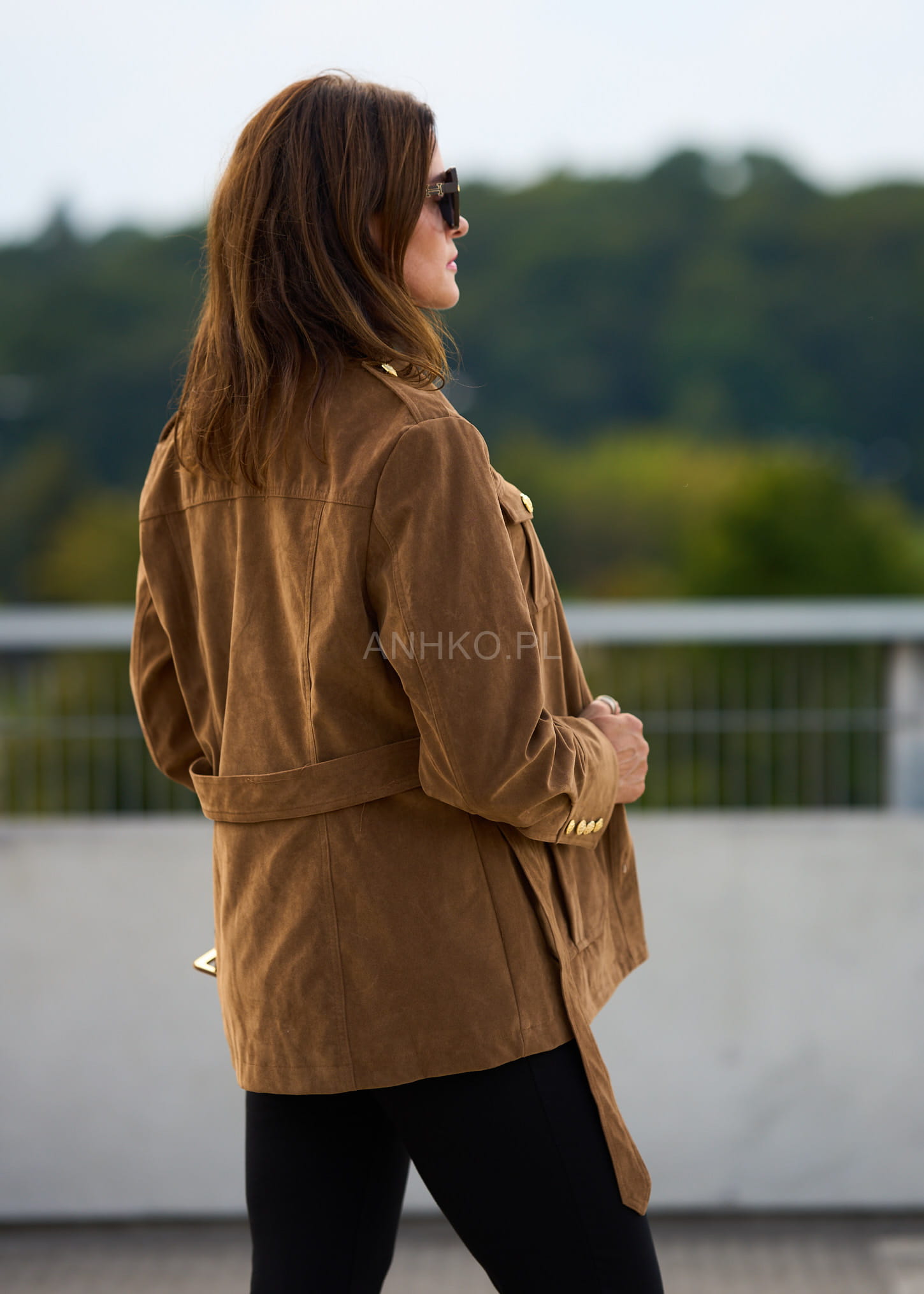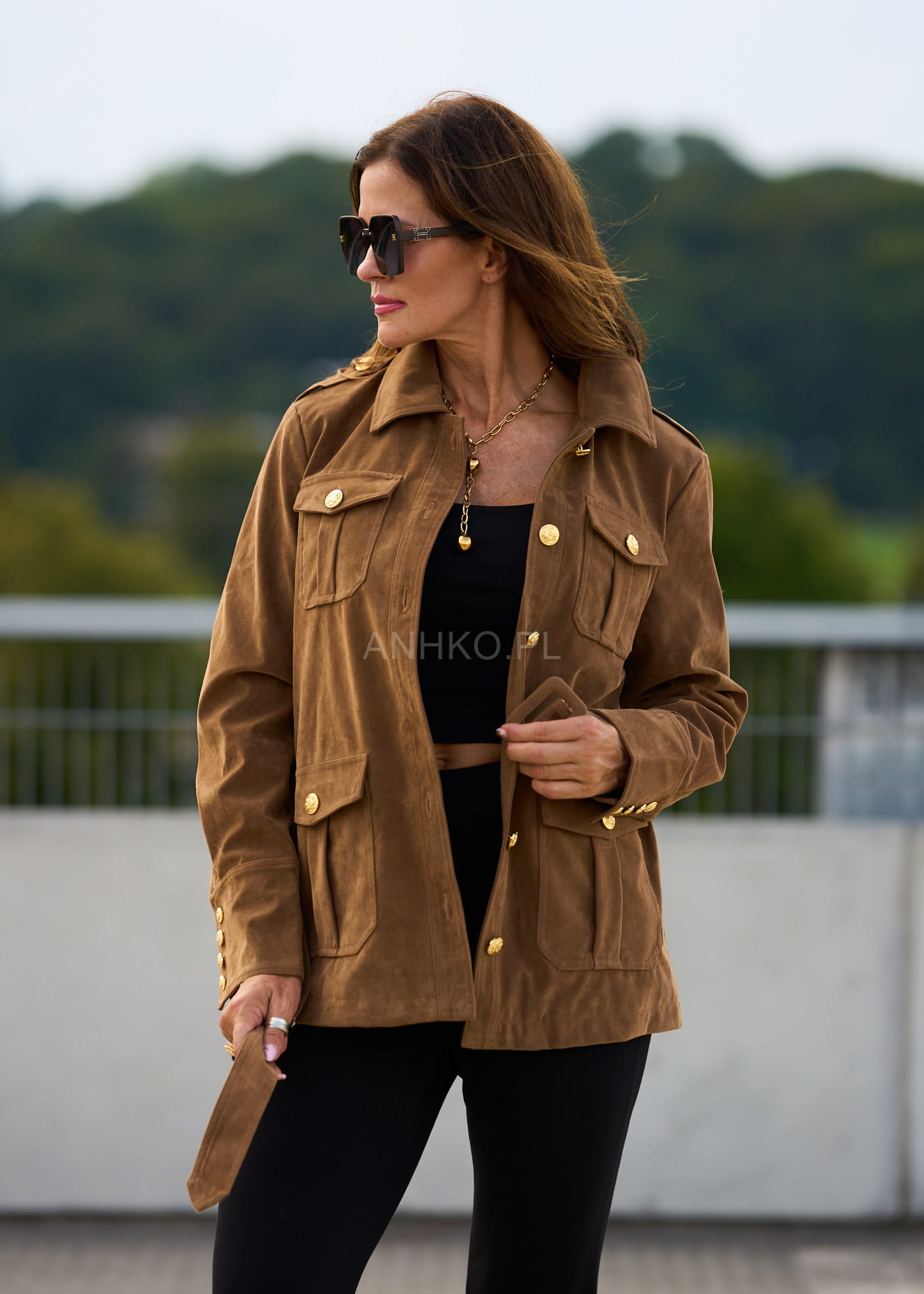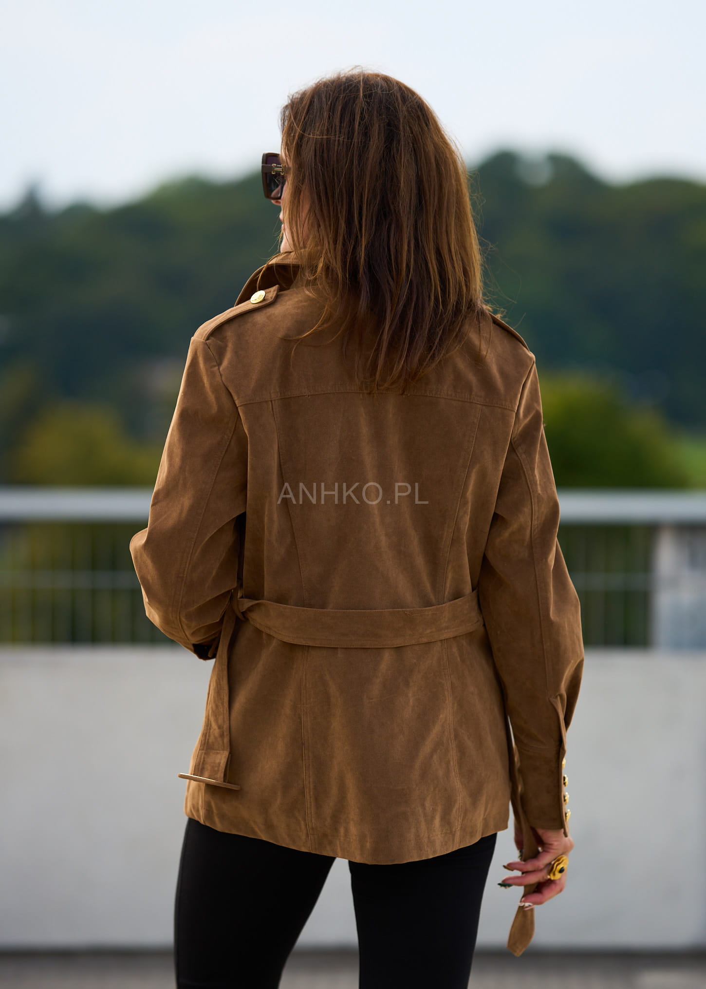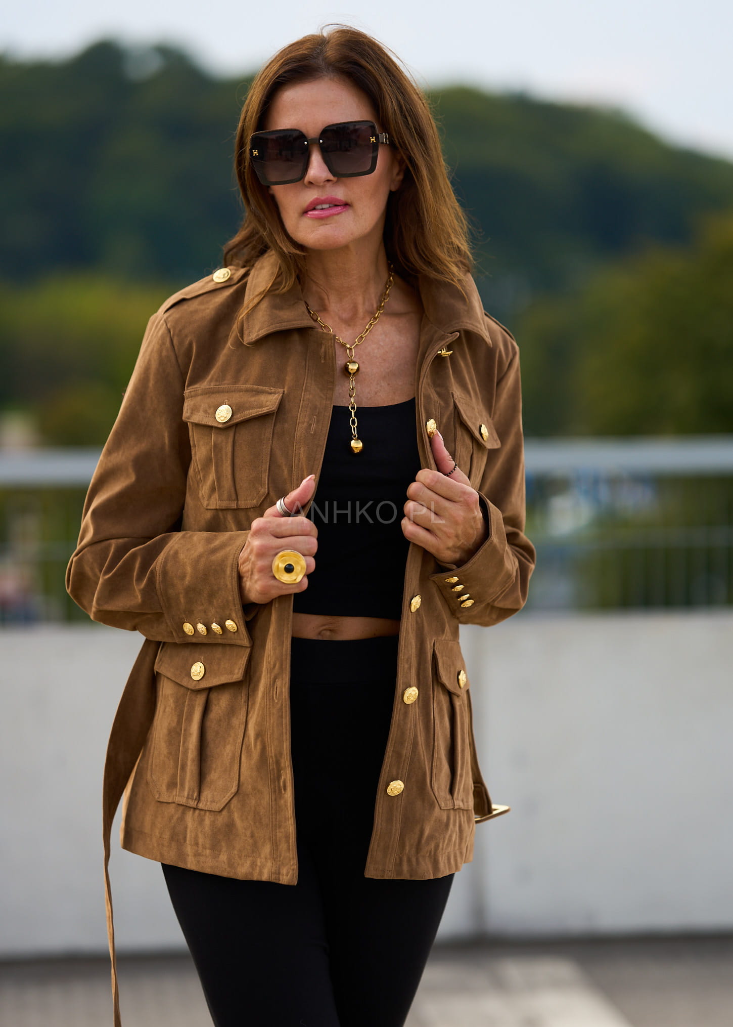 To wyjątkowa kurtka damska, która łączy w sobie ponadczasową elegancję i modny, militarny charakter. Jej wyróżniającym elementem są złote guziki z tłoczeniem, które nadają całości luksusowego akcentu. Uszyta z połączenia poliestru, wiskozy i PVC, prezentuje się jak naturalny zamsz, jednocześnie będąc łatwą w pielęgnacji. Cztery praktyczne kieszenie oraz pasek w talii podkreślają funkcjonalność i kobiecą sylwetkę. To doskonały wybór na jesienne dni, spotkania biznesowe, spacery po mieście czy eleganckie wyjścia. Dzięki uniwersalnemu kolorowi camel łatwo zestawisz ją zarówno z jeansami i botkami, jak i bardziej klasycznymi elementami garderoby.\