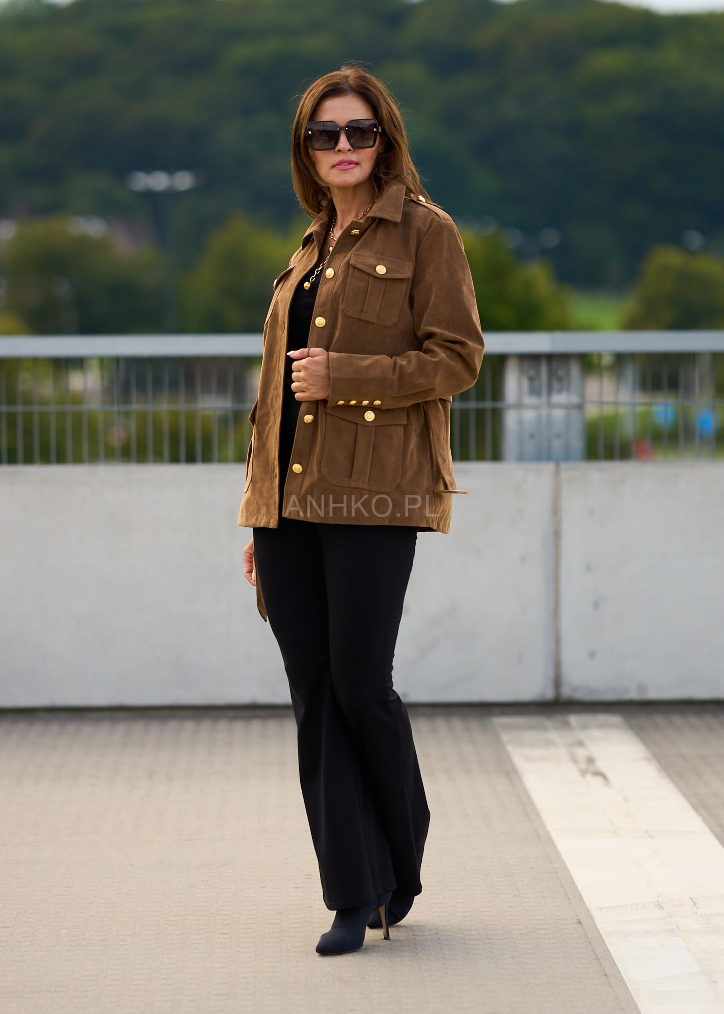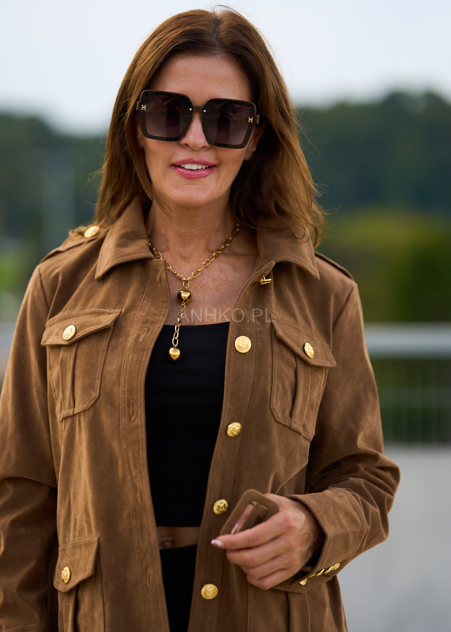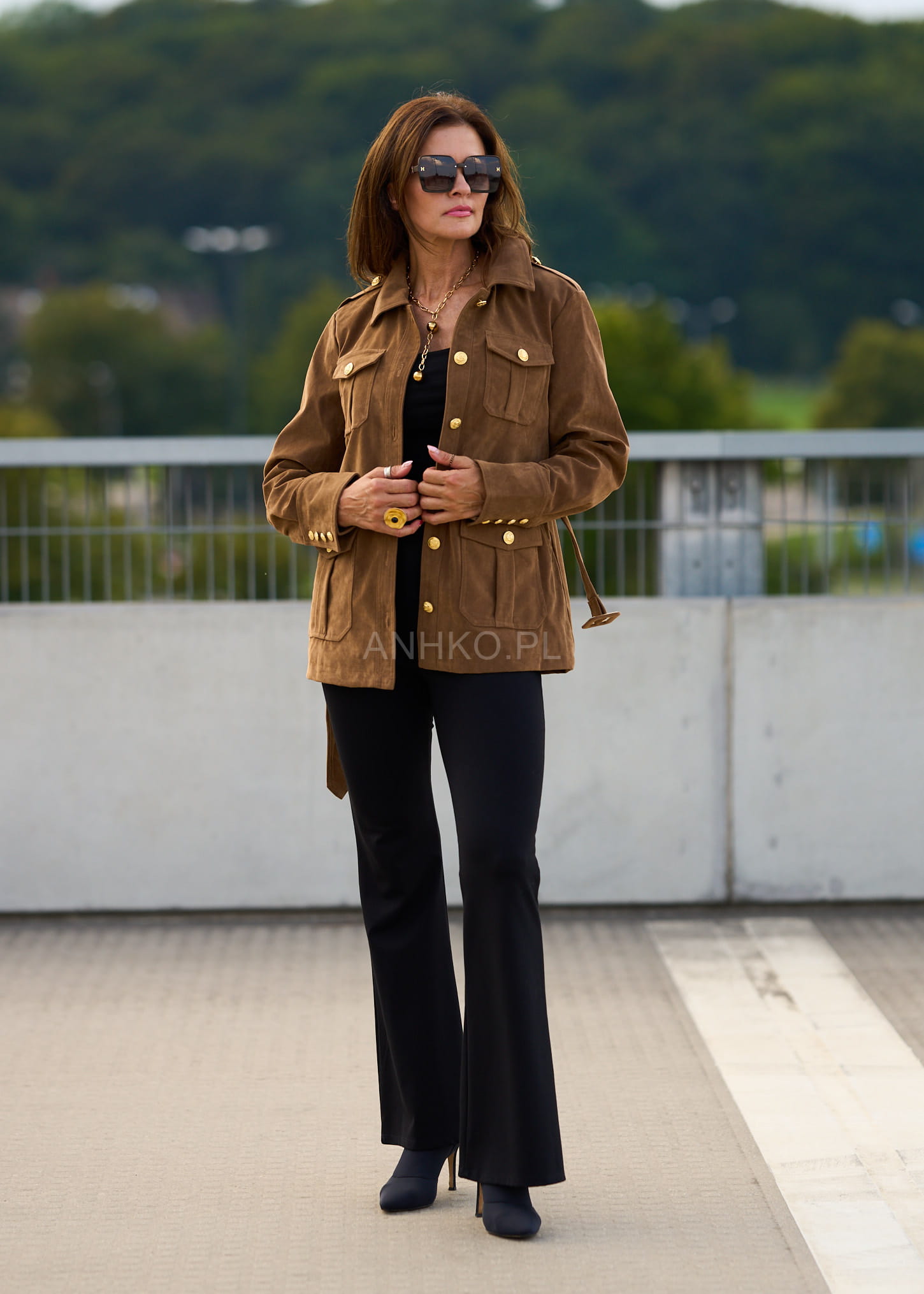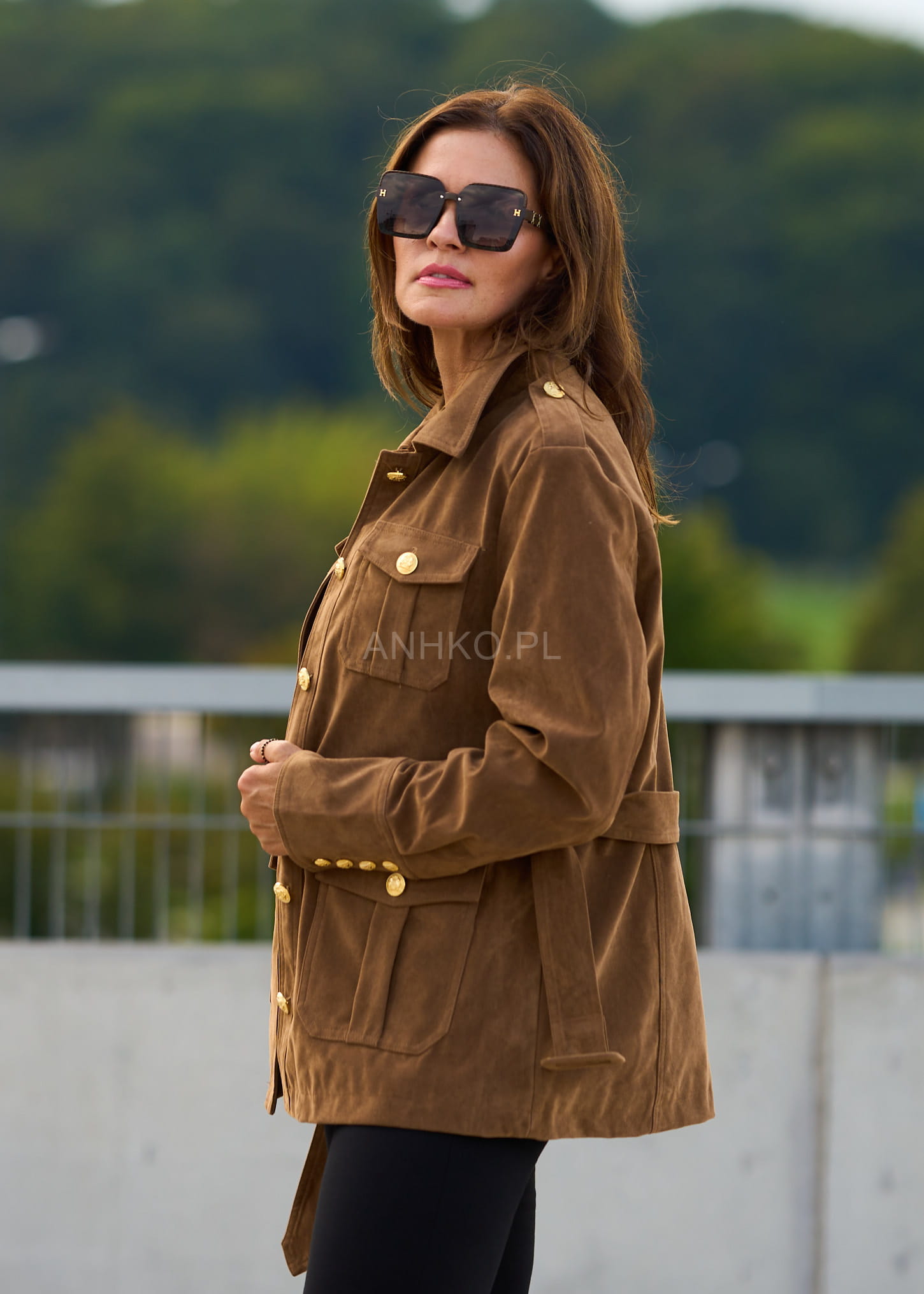 To wyjątkowa kurtka damska, która łączy w sobie ponadczasową elegancję i modny, militarny charakter. Jej wyróżniającym elementem są złote guziki z tłoczeniem, które nadają całości luksusowego akcentu. Uszyta z połączenia poliestru, wiskozy i PVC, prezentuje się jak naturalny zamsz, jednocześnie będąc łatwą w pielęgnacji. Cztery praktyczne kieszenie oraz pasek w talii podkreślają funkcjonalność i kobiecą sylwetkę. To doskonały wybór na jesienne dni, spotkania biznesowe, spacery po mieście czy eleganckie wyjścia. Dzięki uniwersalnemu kolorowi camel łatwo zestawisz ją zarówno z jeansami i botkami, jak i bardziej klasycznymi elementami garderoby.\