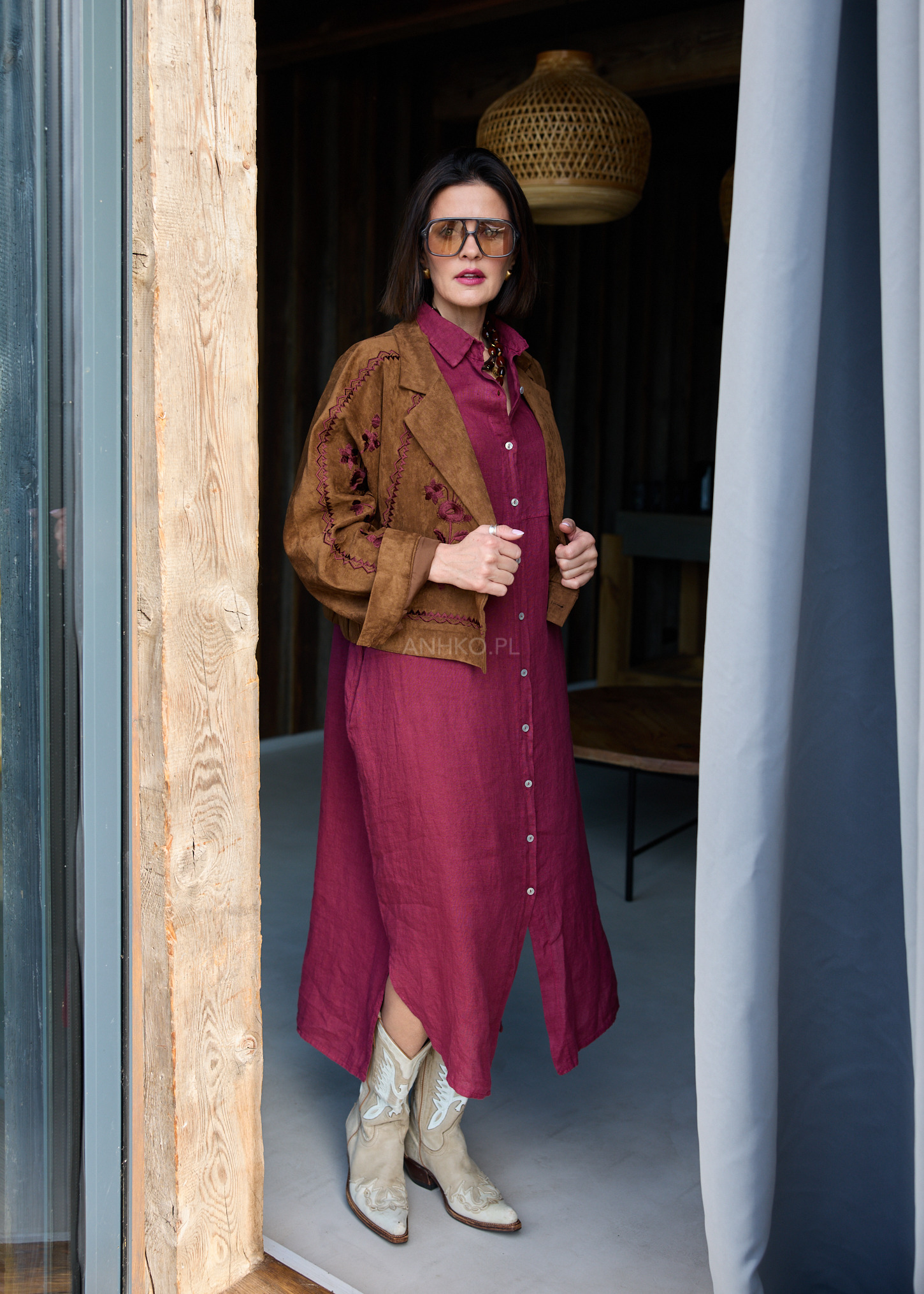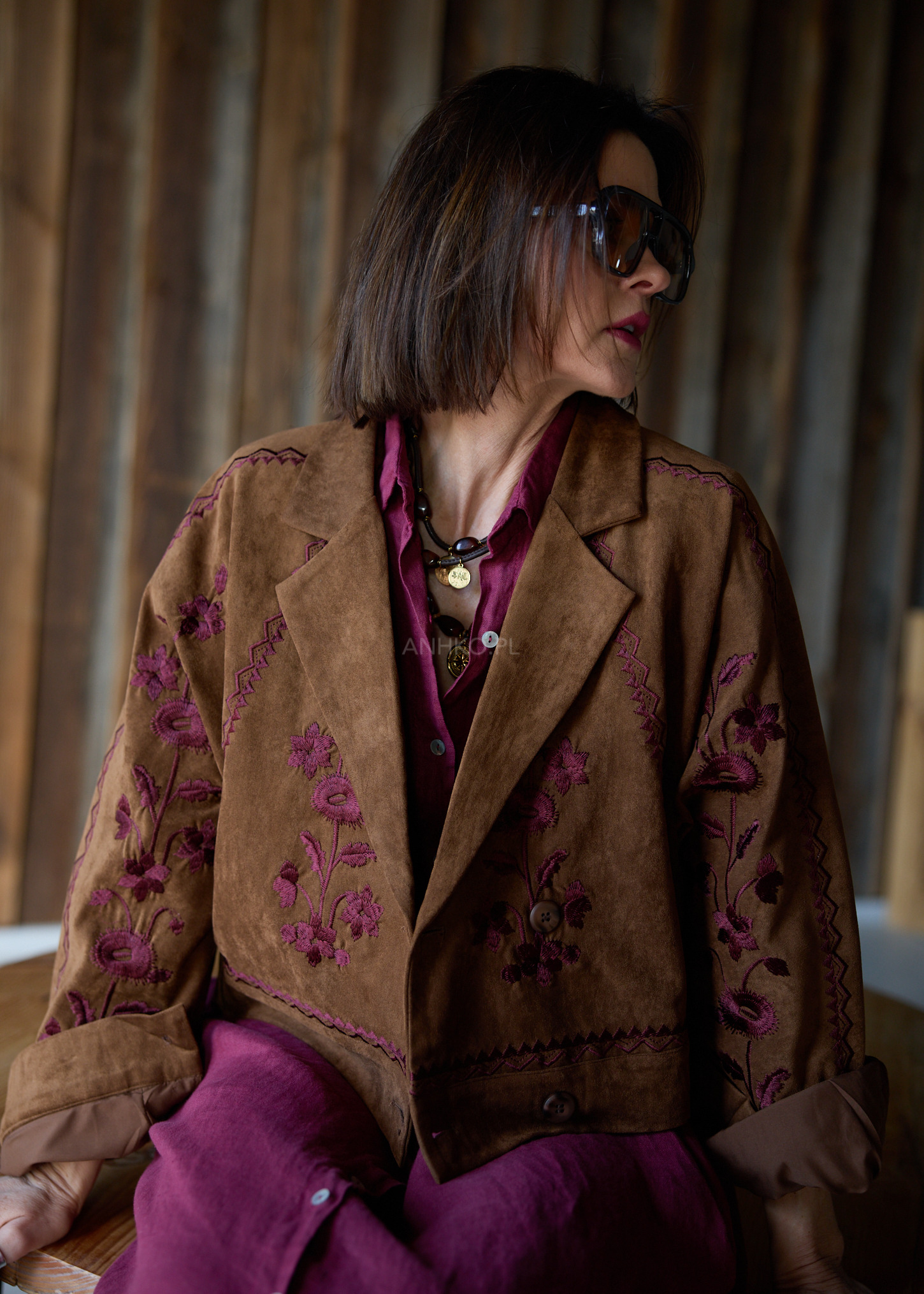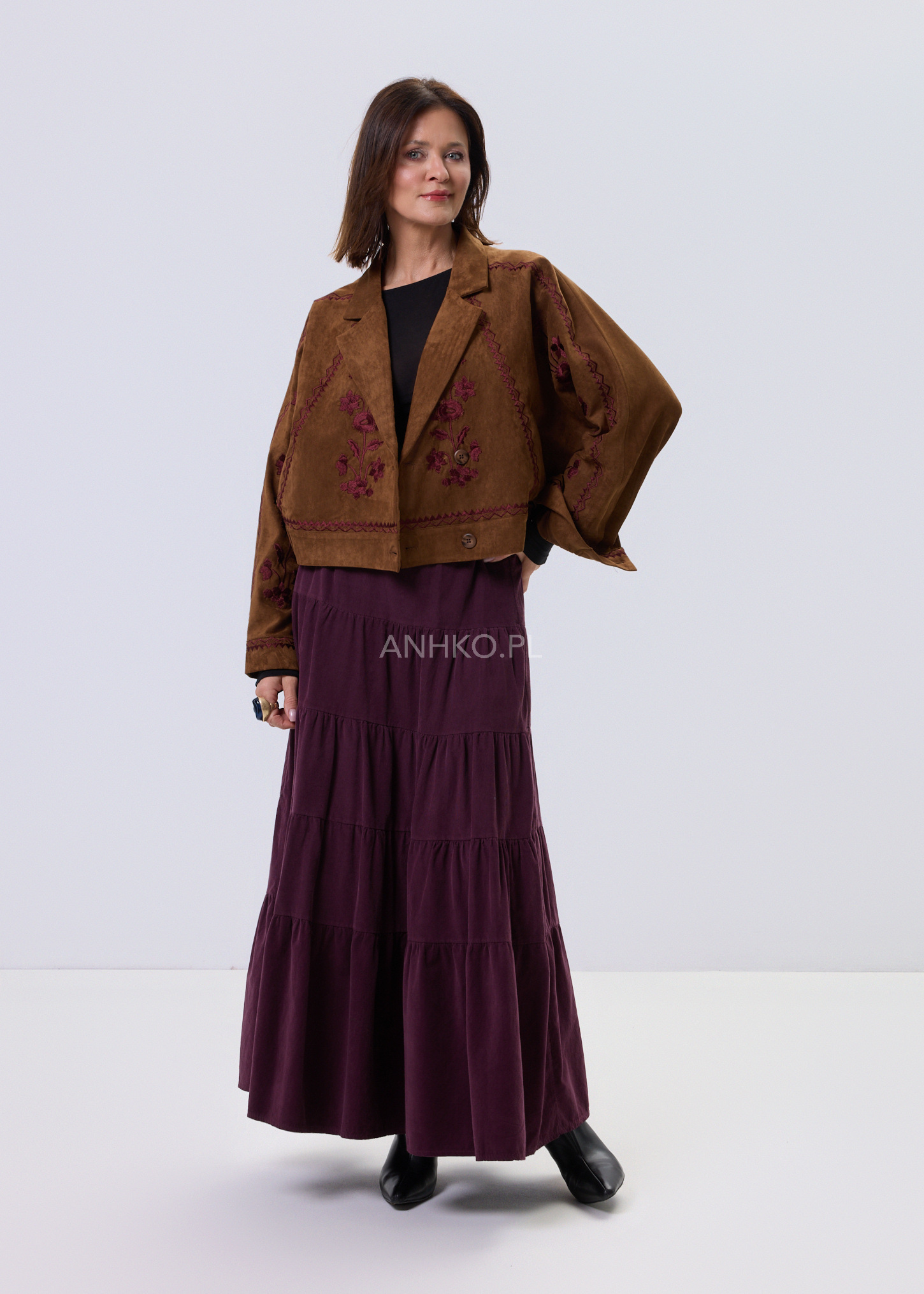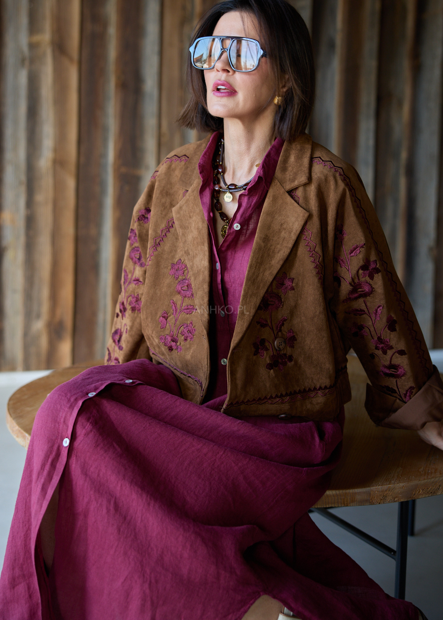 Ta kurtka damska o krótkim, lekko oversize’owym fasonie swobodnie układa się na sylwetce, tworząc wyrazistą, ale harmonijną linię ramion. Karmelowy odcień w połączeniu z bordowymi haftami kwiatowymi przyciąga spojrzenia i nadaje całości artystycznego charakteru inspirowanego stylem boho.