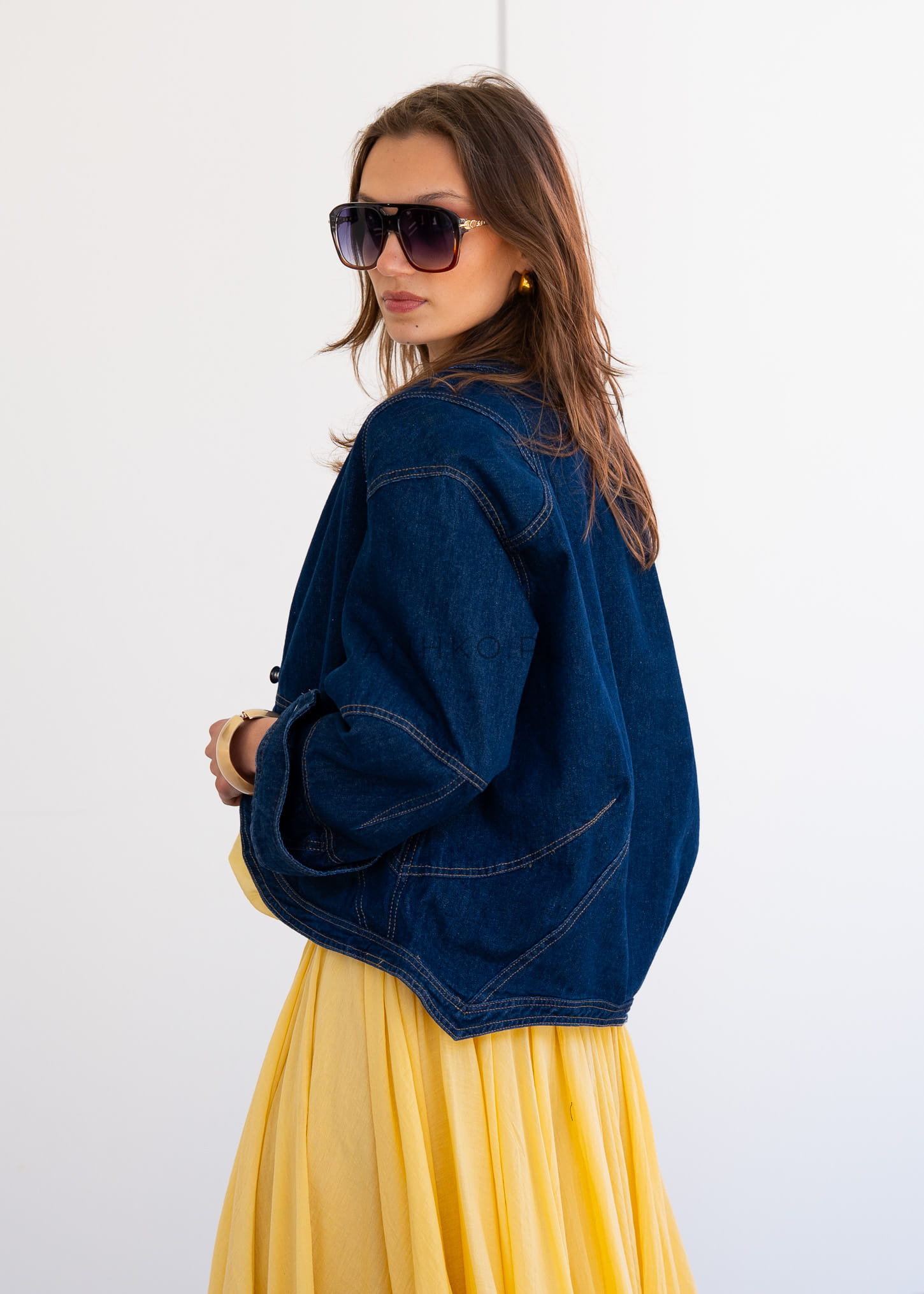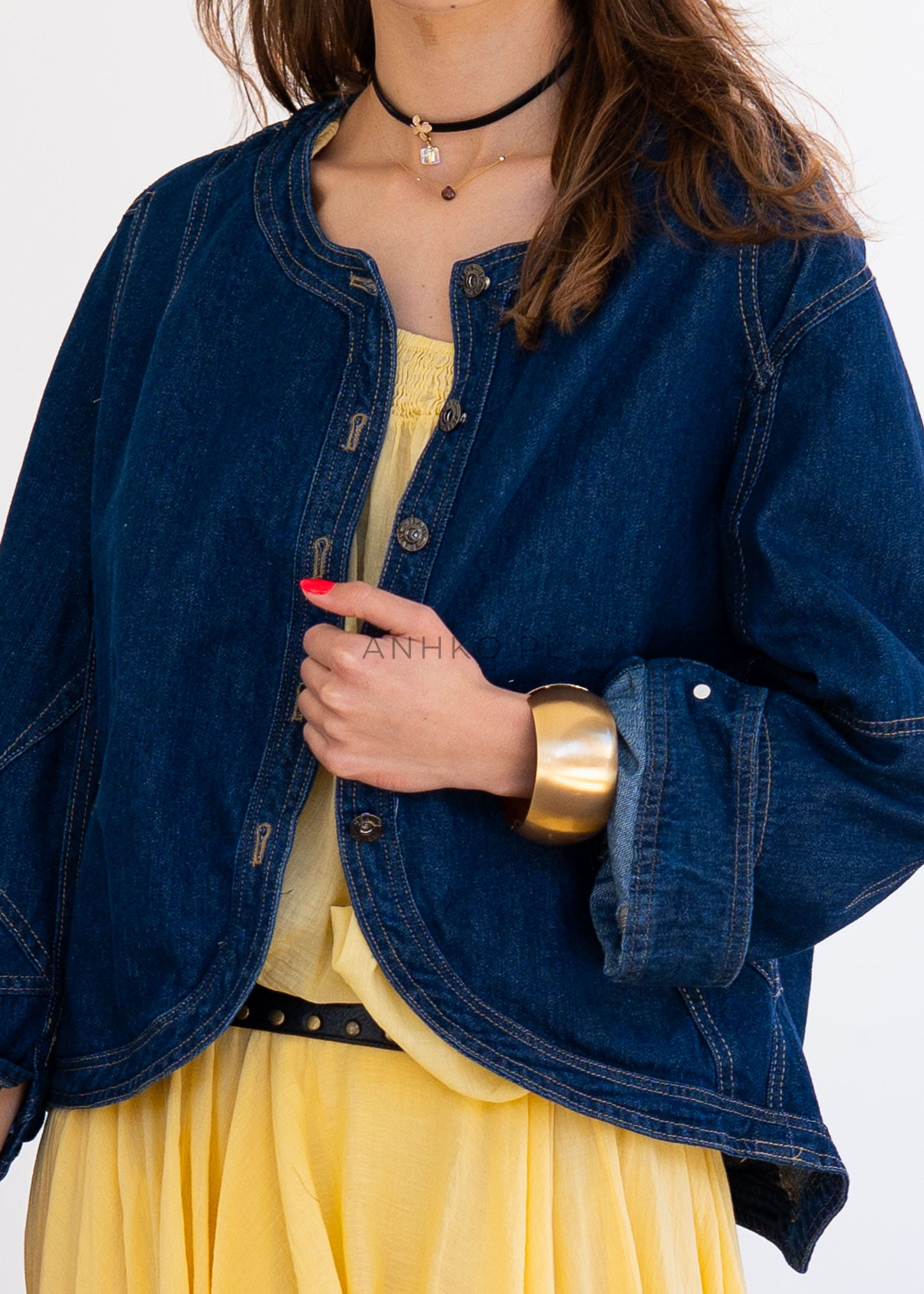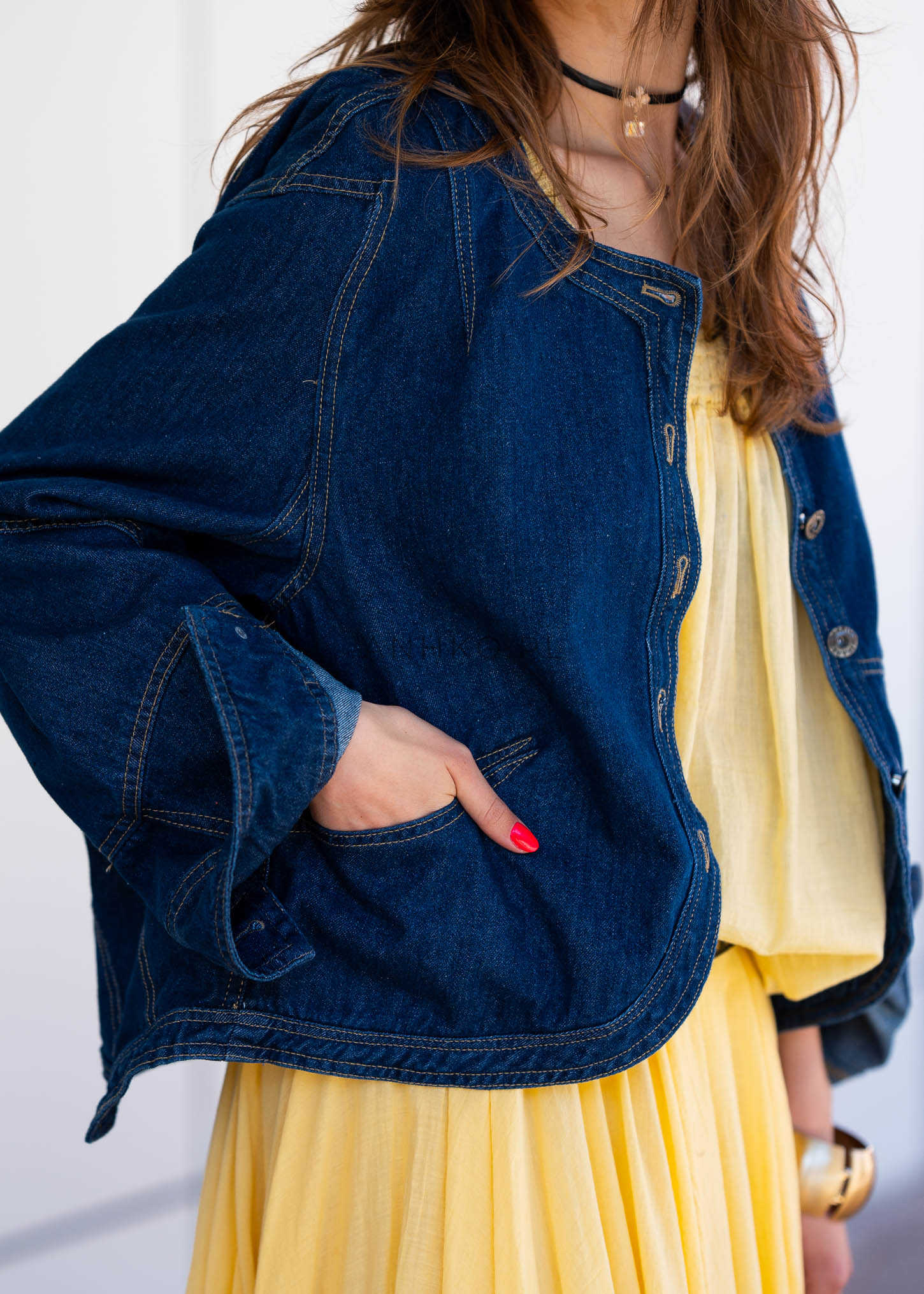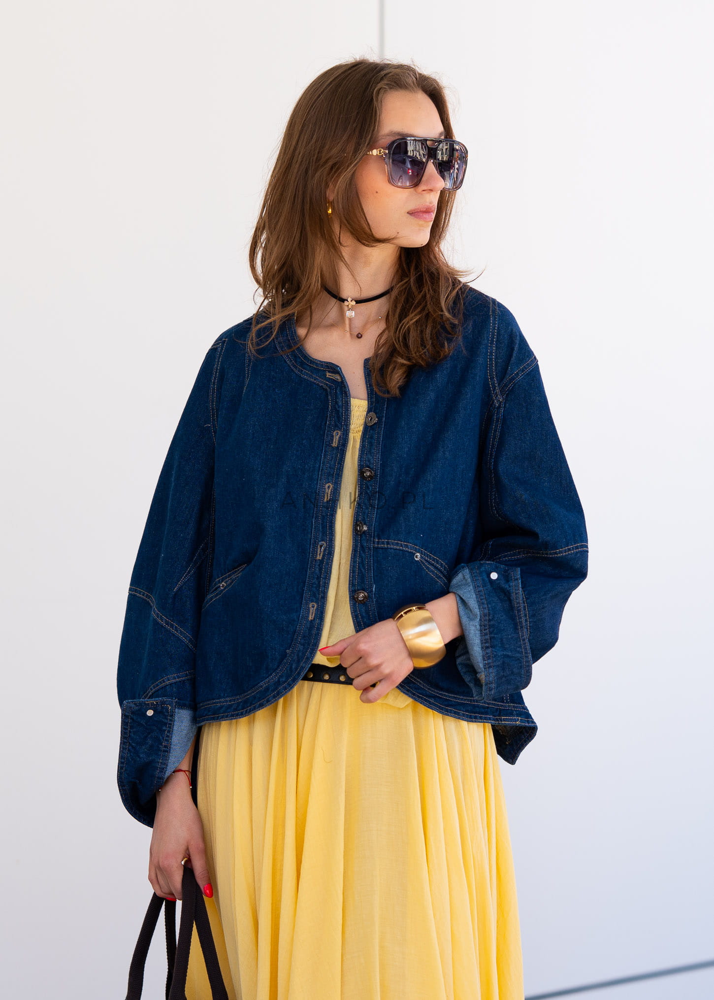 Model wyróżnia się minimalistycznym krojem bez klasycznego kołnierza, dzięki czemu wygląda nowocześnie i subtelnie. Ozdobne przeszycia oraz metalowe napy dodają całości modowego charakteru, a praktyczne kieszenie zwiększają funkcjonalność kurtki. Uniwersalny odcień denimu sprawia, że model łatwo dopasować do wielu stylizacji.