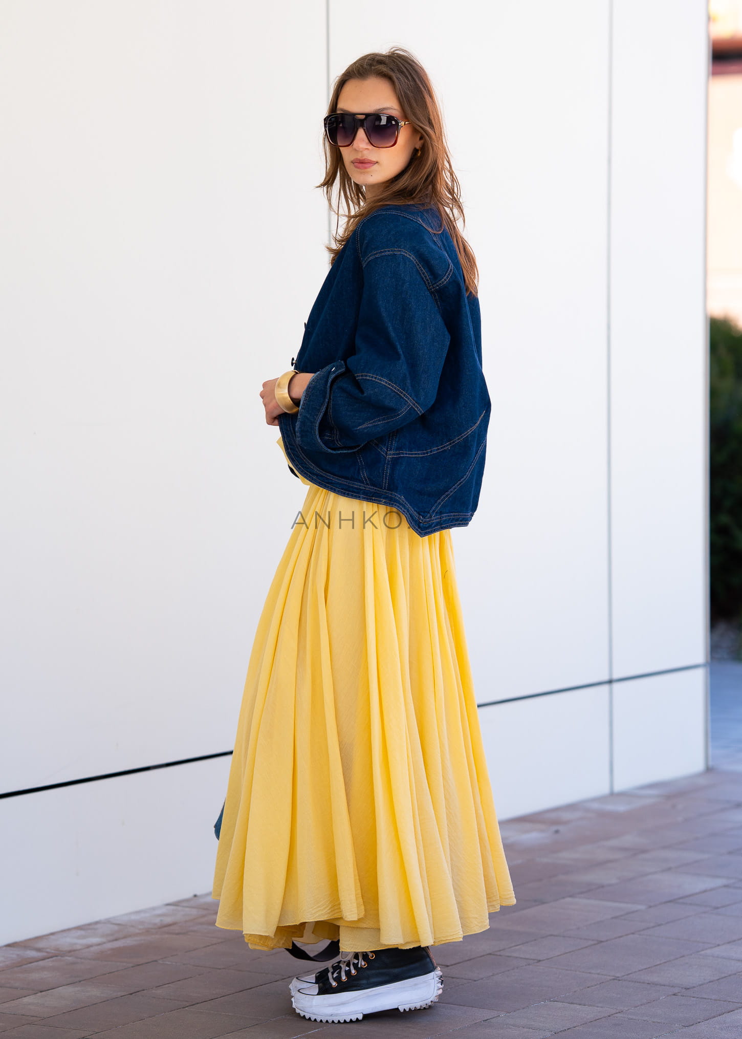 Spódnica Varstina Żółta - spódnica to doskonały wybór na letnie dni! Warstwowa konstrukcja nadaje jej lekkości i delikatności, idealnie sprawdzając się w ciepłe dni.
