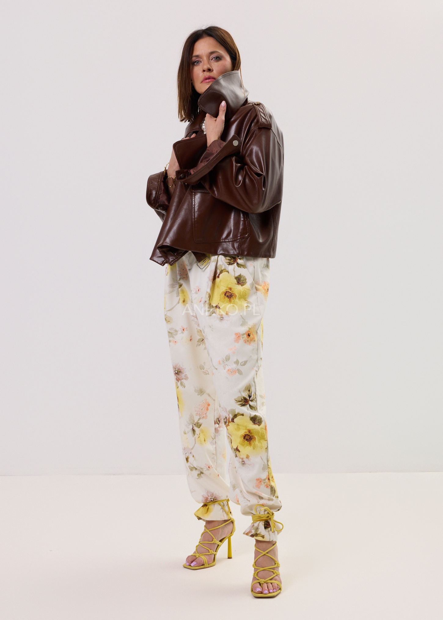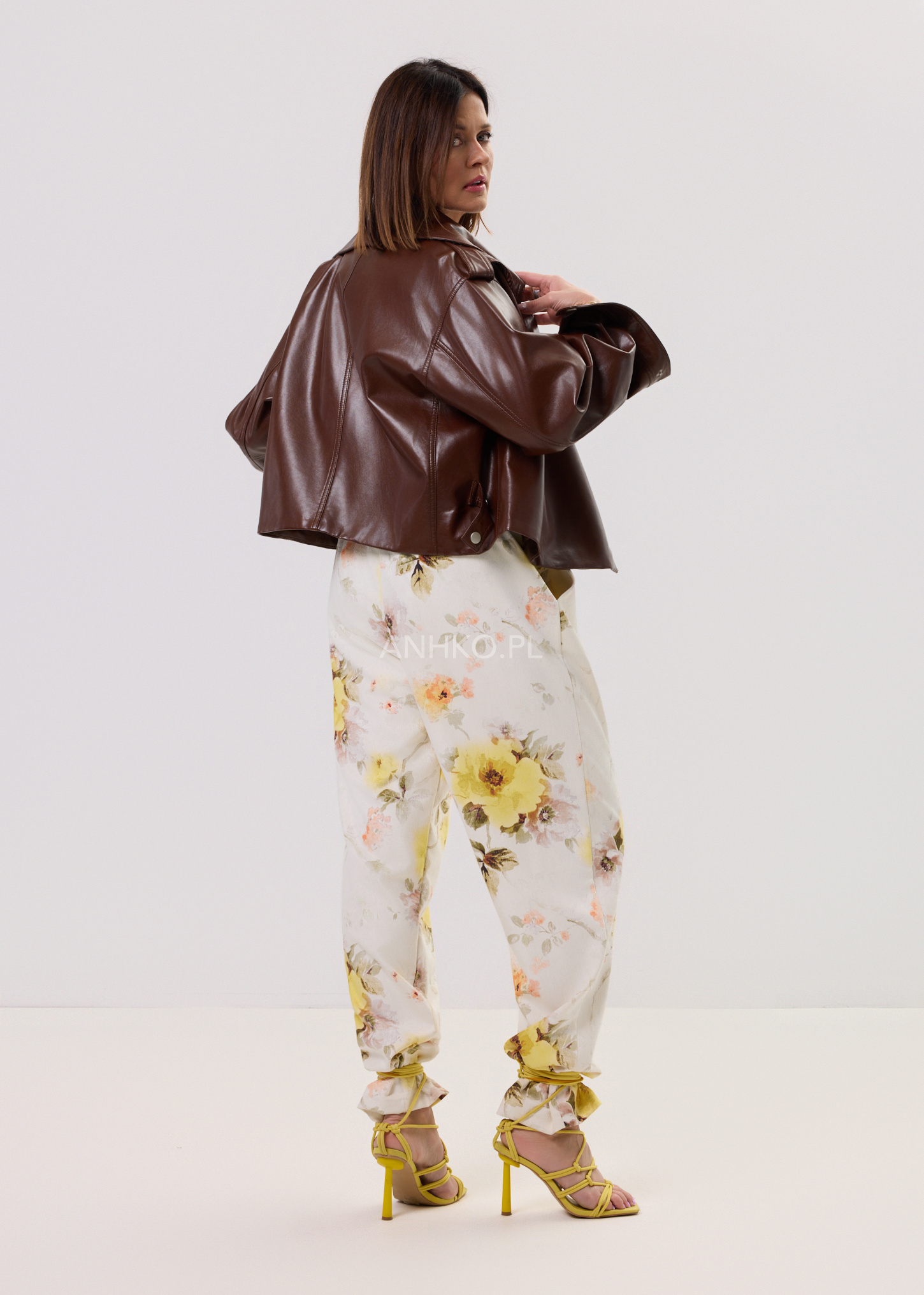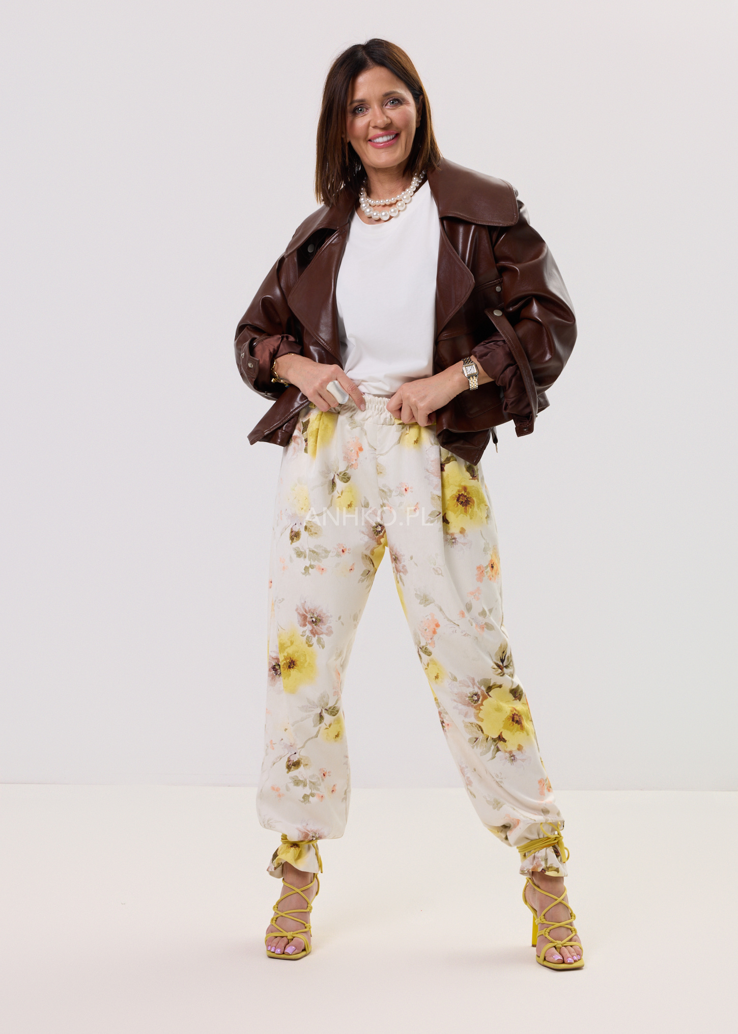 Spodnie Sunny Bloom Beżowo-Żółte - Lekkie, kobiece i mega wygodne. Joggersy w odcieniu ecru z żółtym, kwiatowym printem to idealna baza na wiosnę i lato. Elastyczny pas i swobodny krój sprawiają, że nosisz je od rana do wieczora – bez kompromisów.