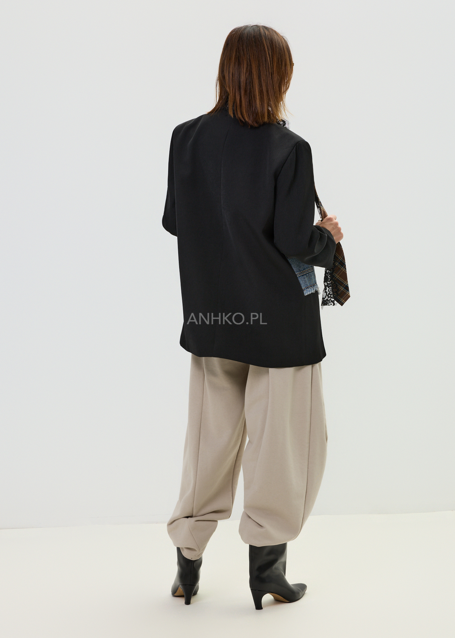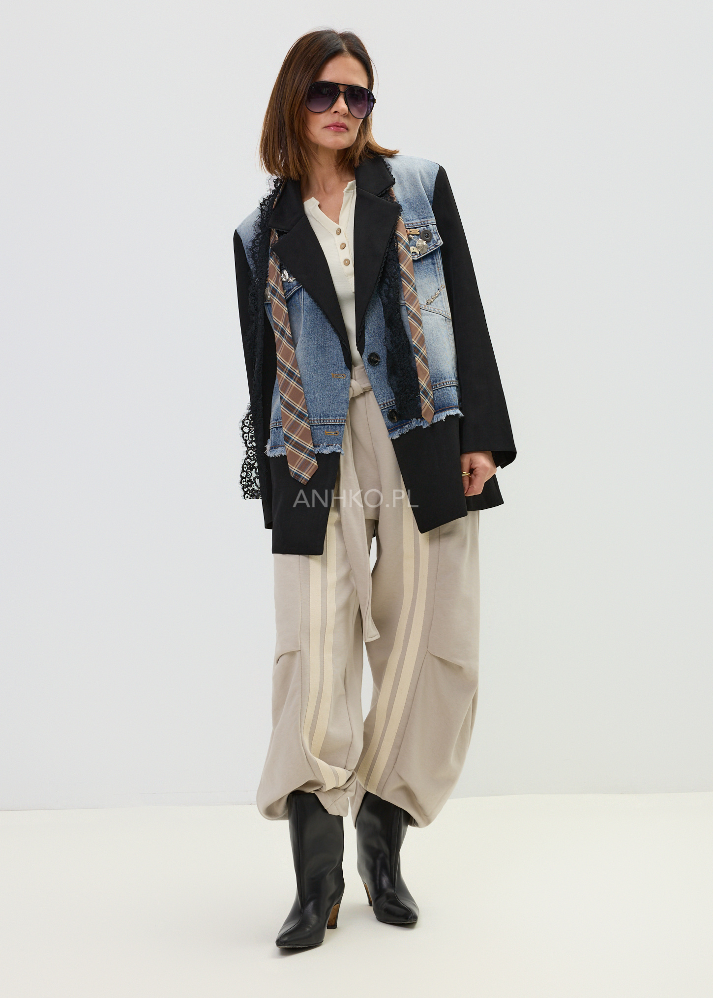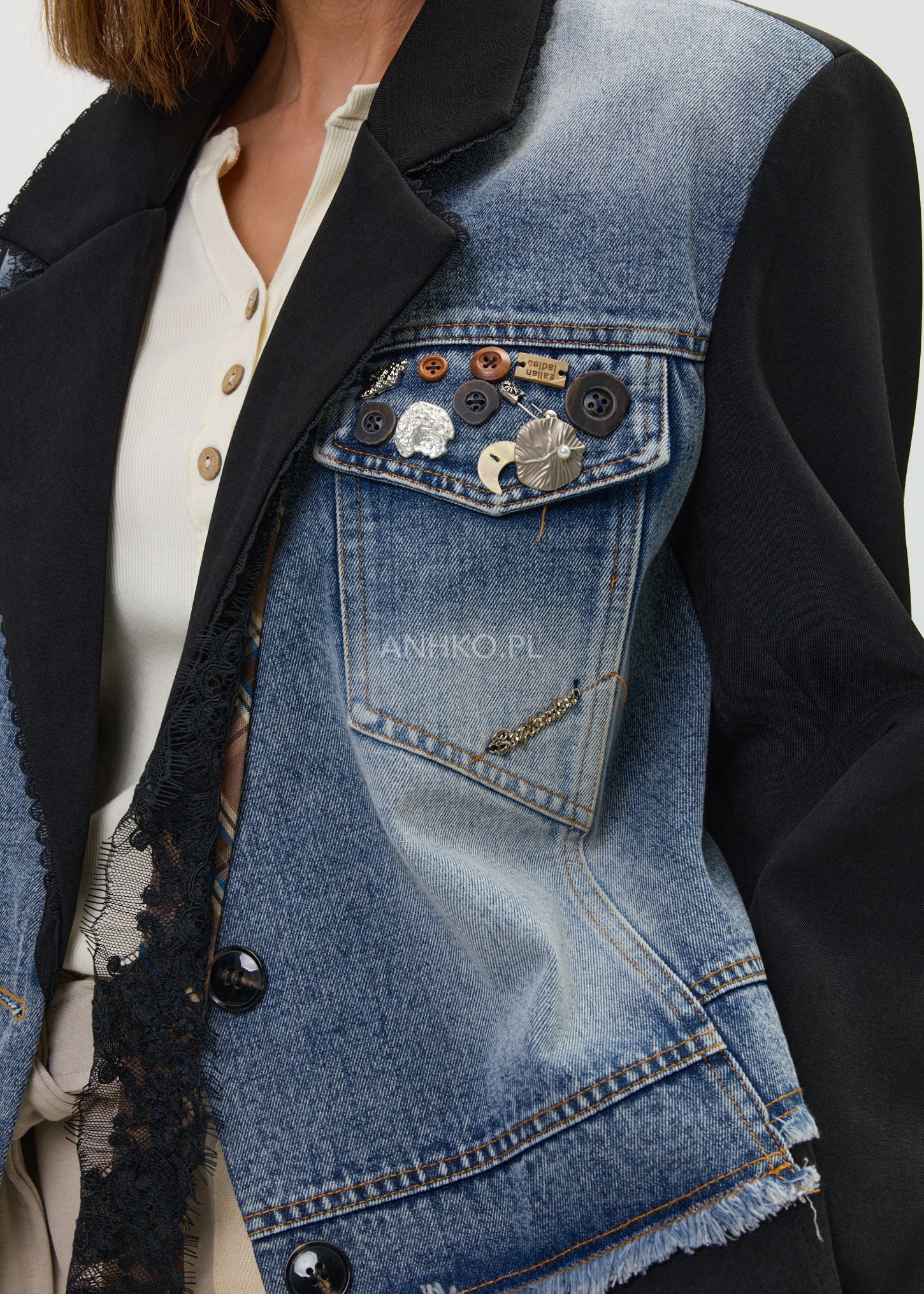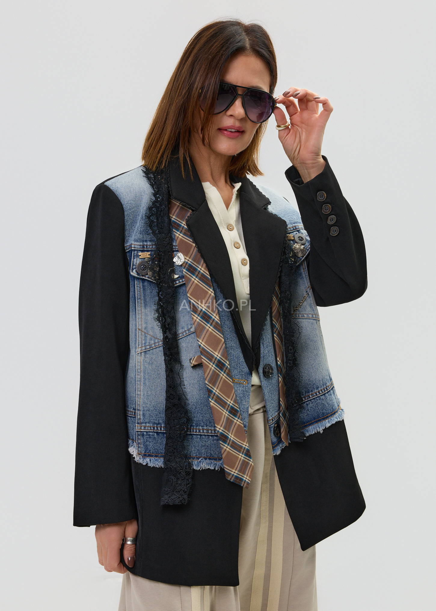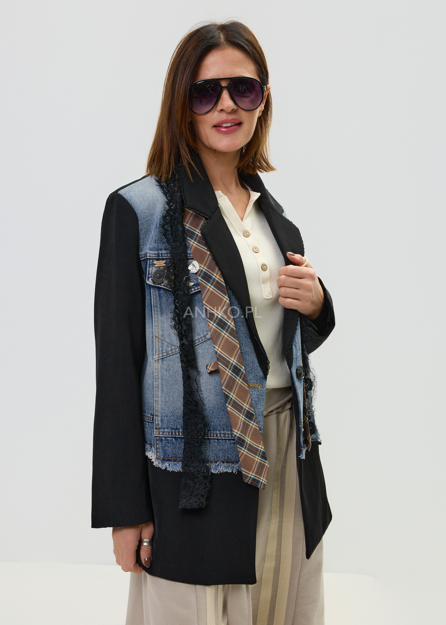 - Styl mix materiałów: połączenie klasycznej czarnej marynarki z denimowym panelem.