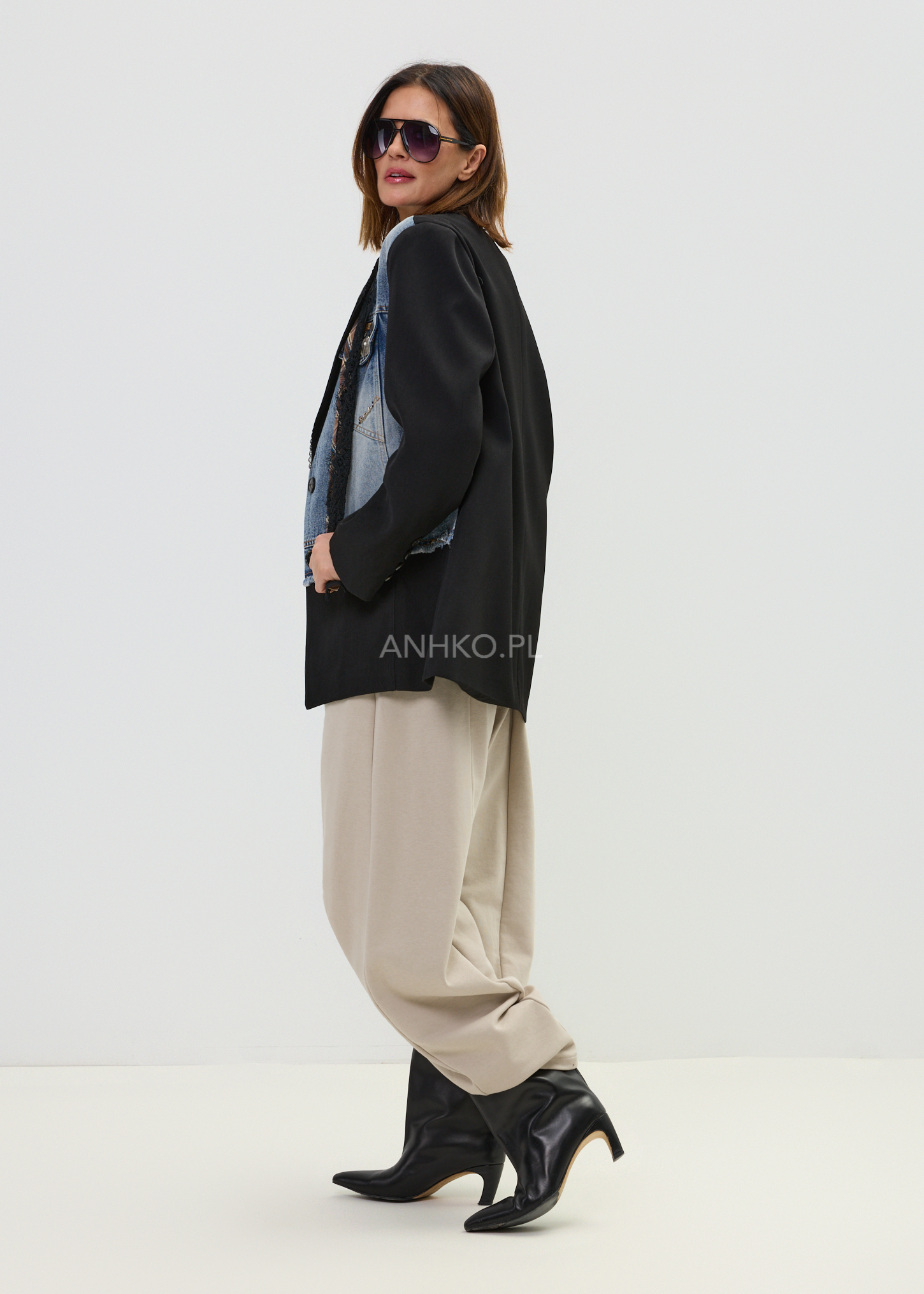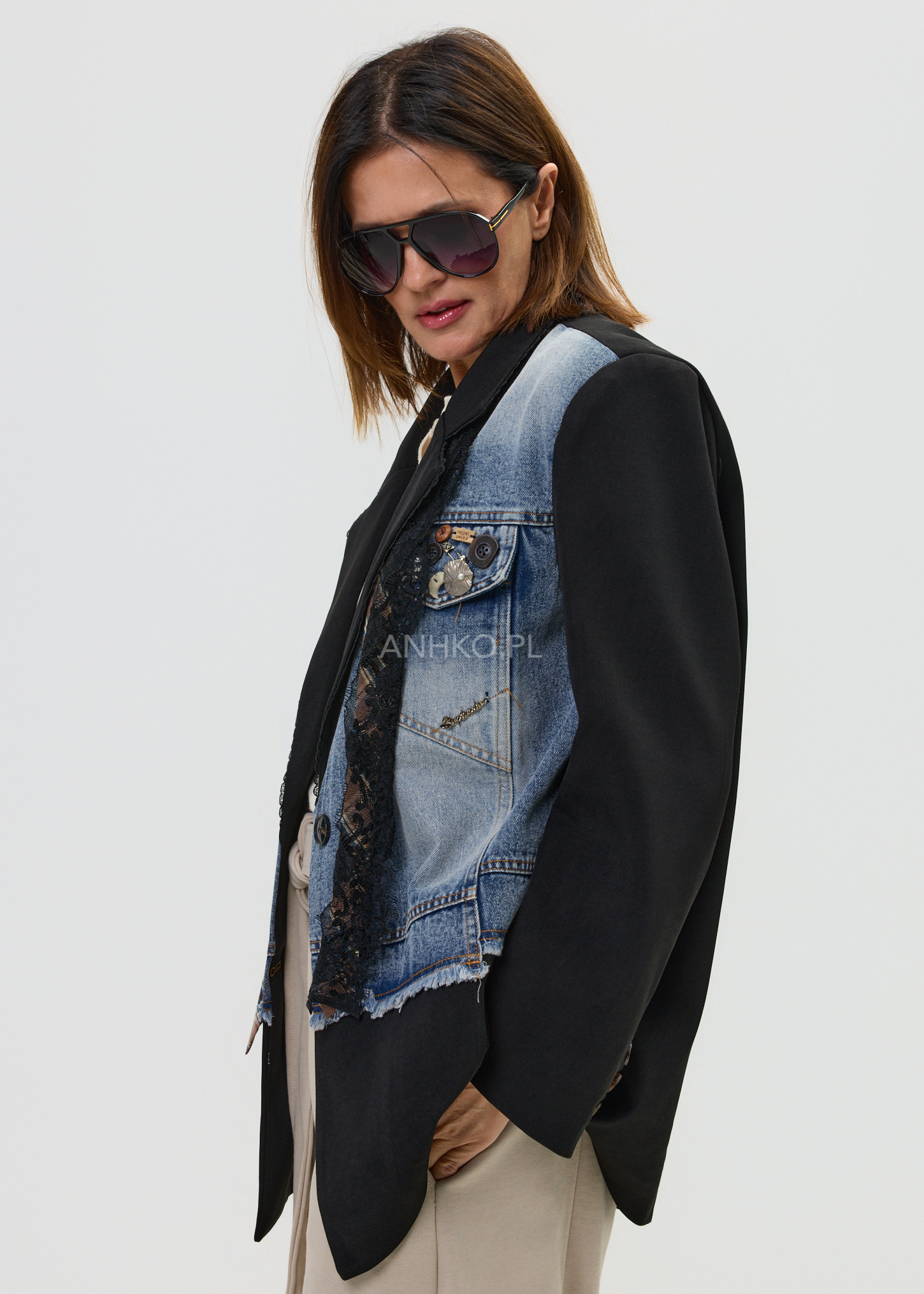 Ta marynarka damska przyciąga uwagę nietuzinkowym połączeniem klasycznej elegancji i modowego charakteru. Czarna baza zestawiona z kontrastowym panelem z denimu tworzy efektowny miks materiałów, który świetnie wpisuje się w nowoczesne, miejskie stylizacje. Luźniejszy fason miękko układa się na sylwetce, zapewniając komfort oraz swobodę ruchów.