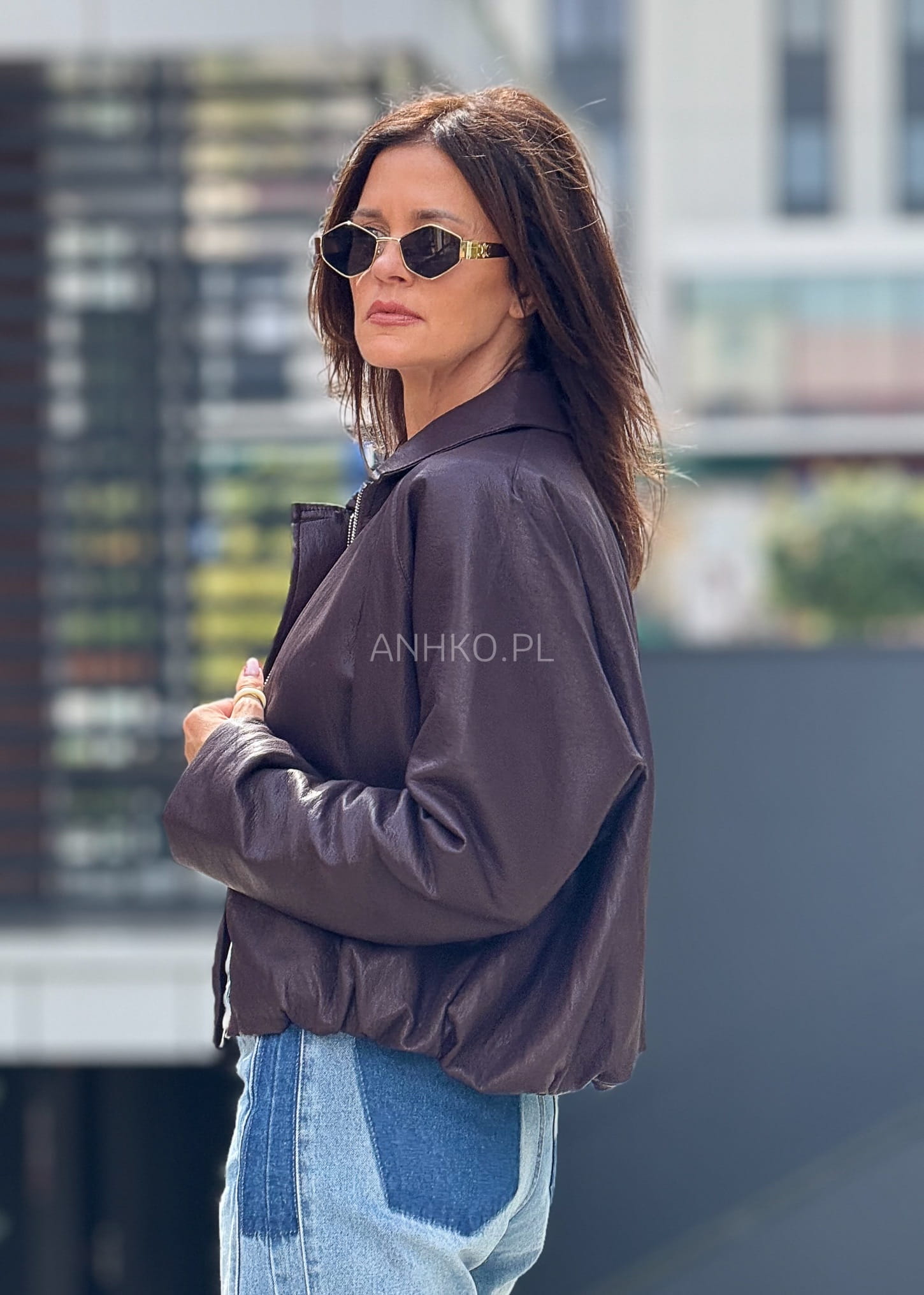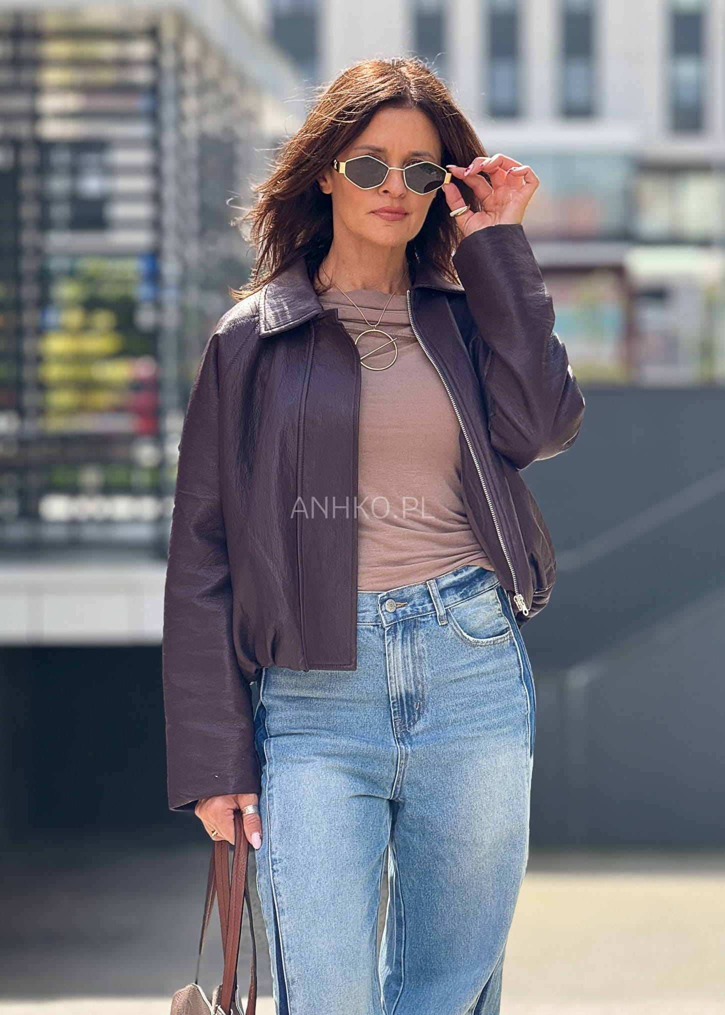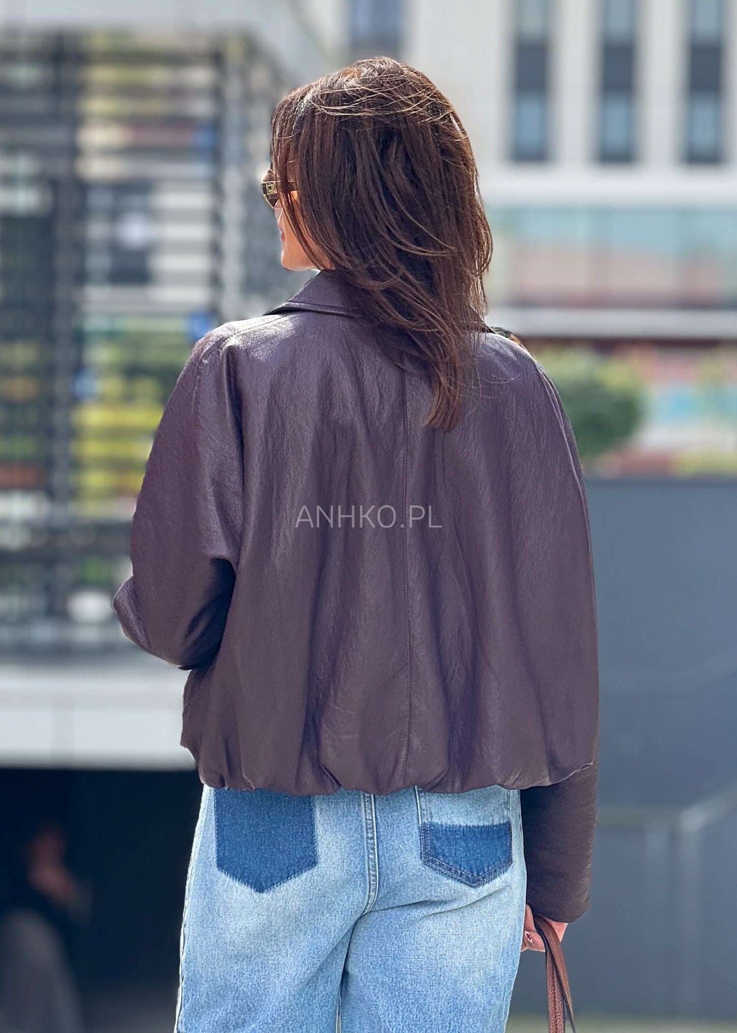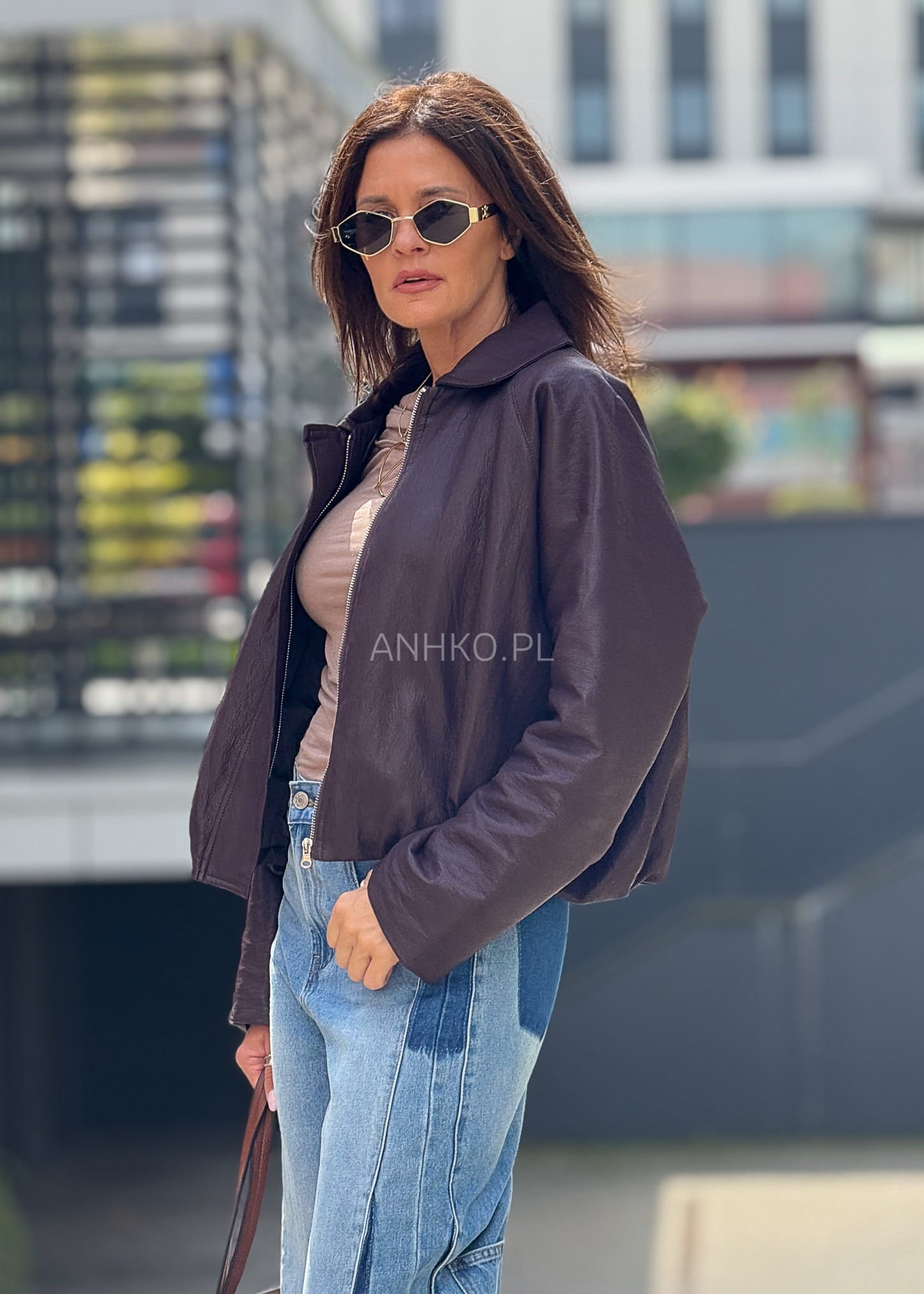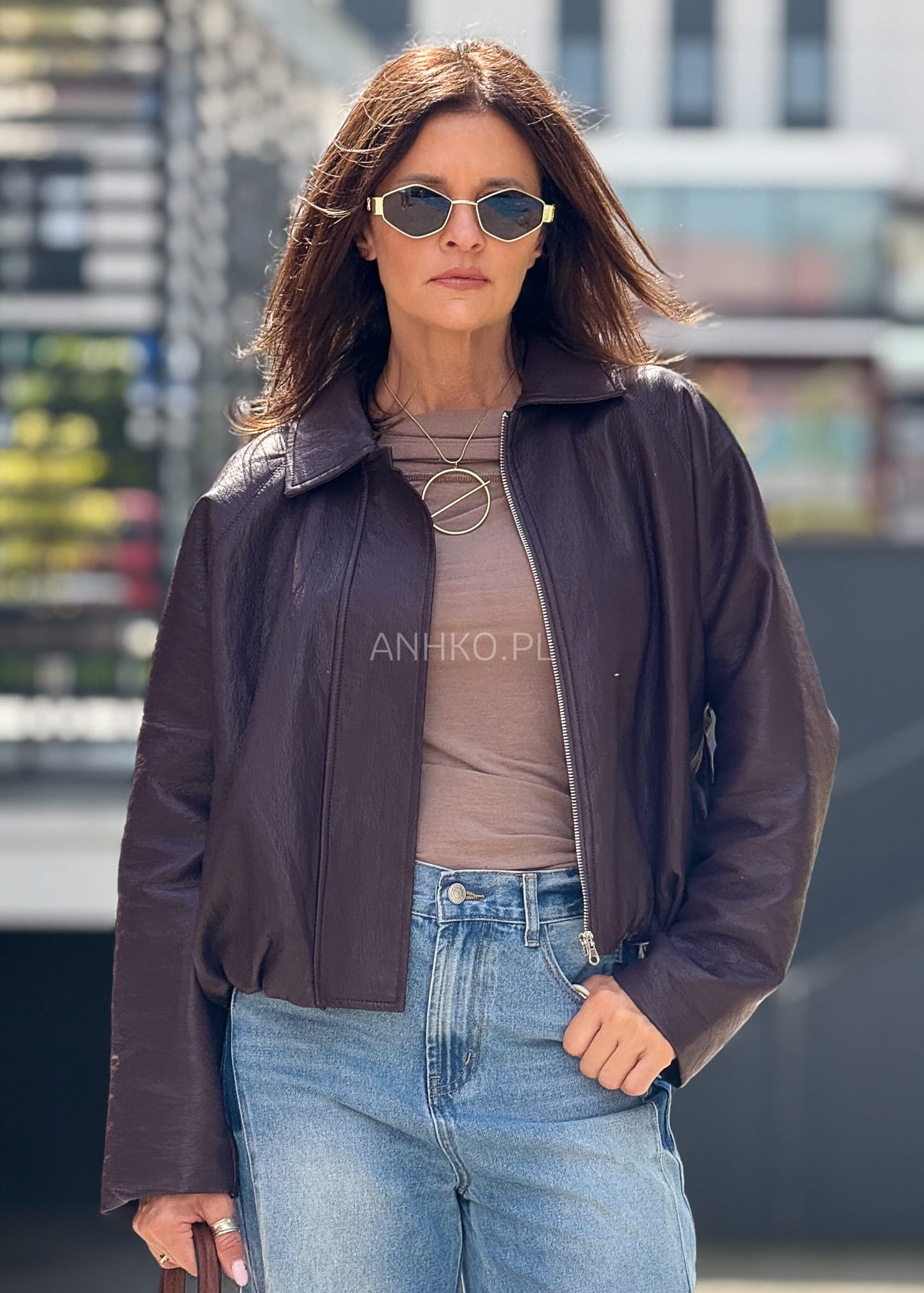 Stylowa kurtka z ekoskóry w kolorze głębokiego burgundu to doskonała propozycja dla kobiet ceniących modne i uniwersalne rozwiązania. Dzięki klasycznemu kołnierzowi i zapięciu na zamek błyskawiczny świetnie komponuje się zarówno z jeansami, jak i sukienkami, tworząc różnorodne stylizacje na co dzień i na wieczór. Luźny fason zakończony delikatnym ściągaczem dodaje całości lekko sportowego charakteru, jednocześnie zachowując elegancki wygląd. To idealny wybór na chłodniejsze dni, gwarantujący komfort i styl.