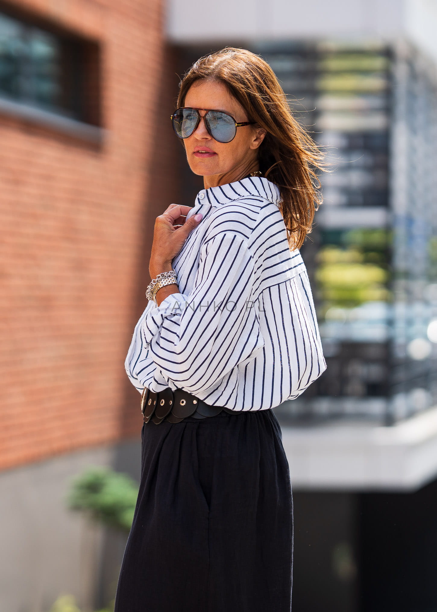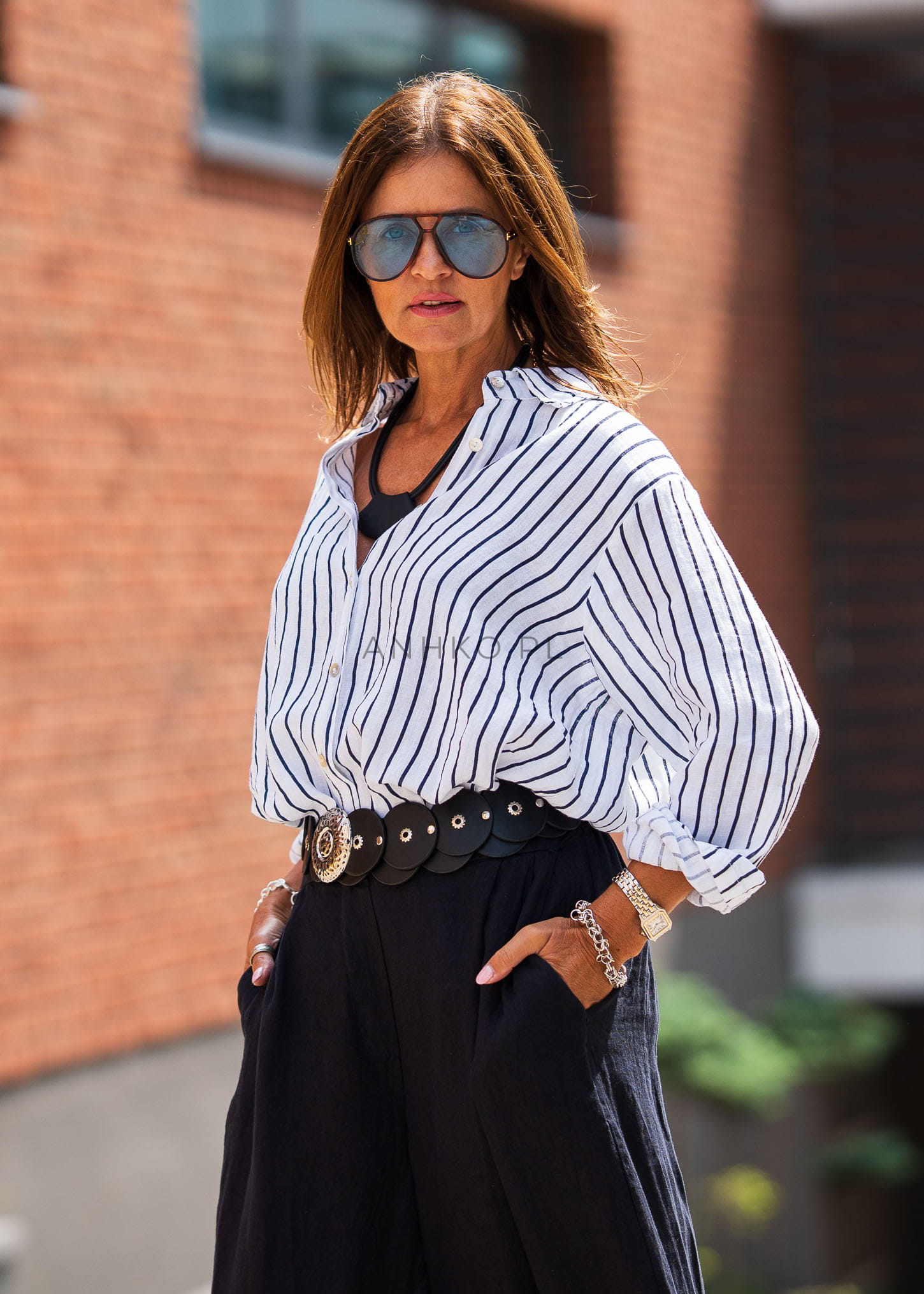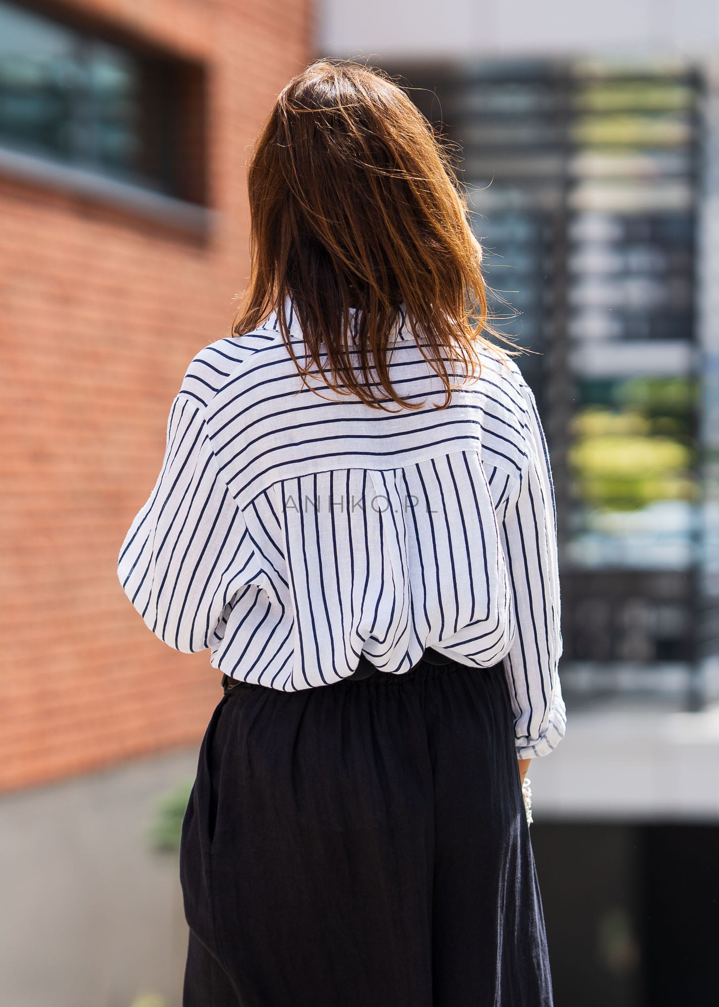 Ta lniana koszula damska w paski doskonale układa się na sylwetce, tworząc efekt lekkiej, niewymuszonej elegancji. Luźny fason z delikatnie opuszczoną linią ramion zapewnia komfort i swobodę ruchów, a pionowe paski optycznie wysmuklają sylwetkę i nadają jej harmonijnych proporcji.