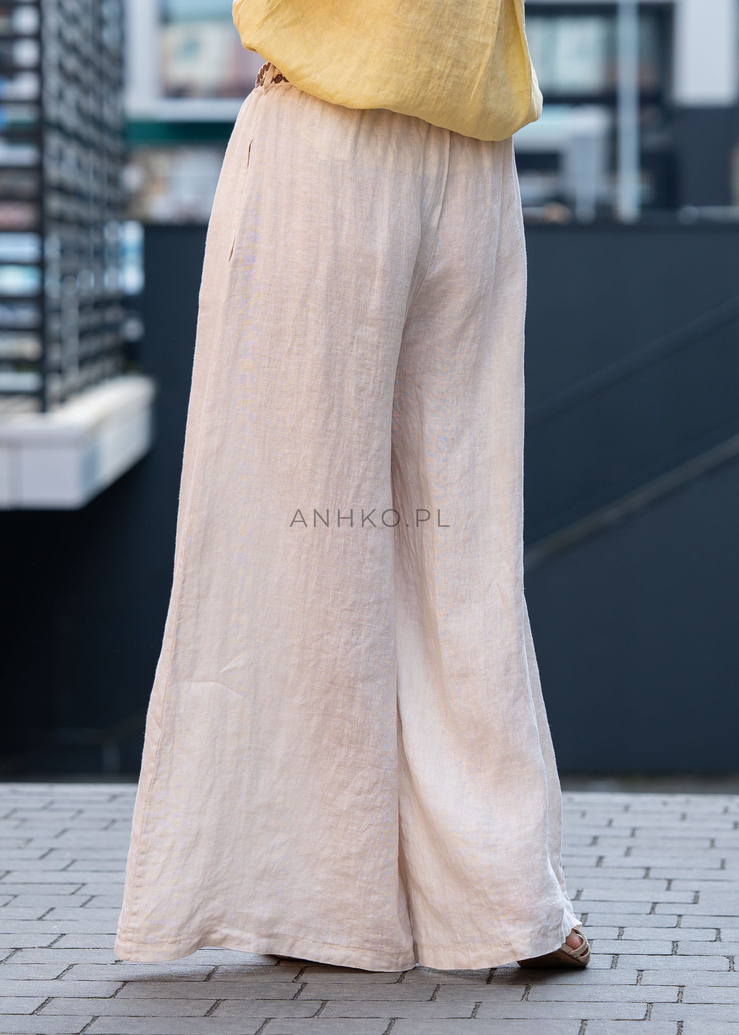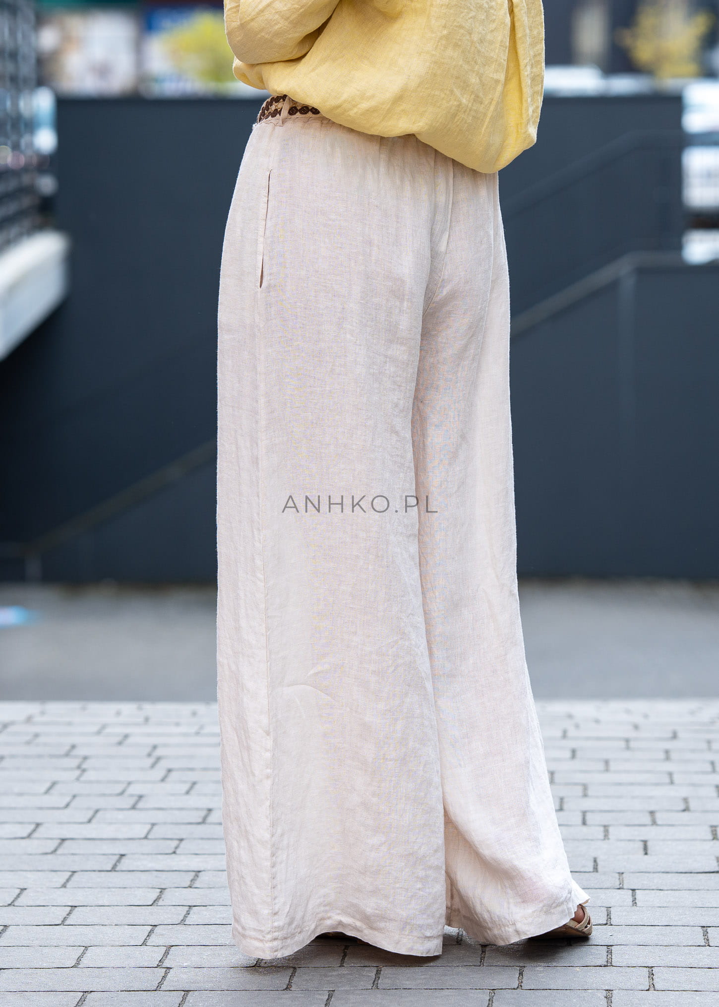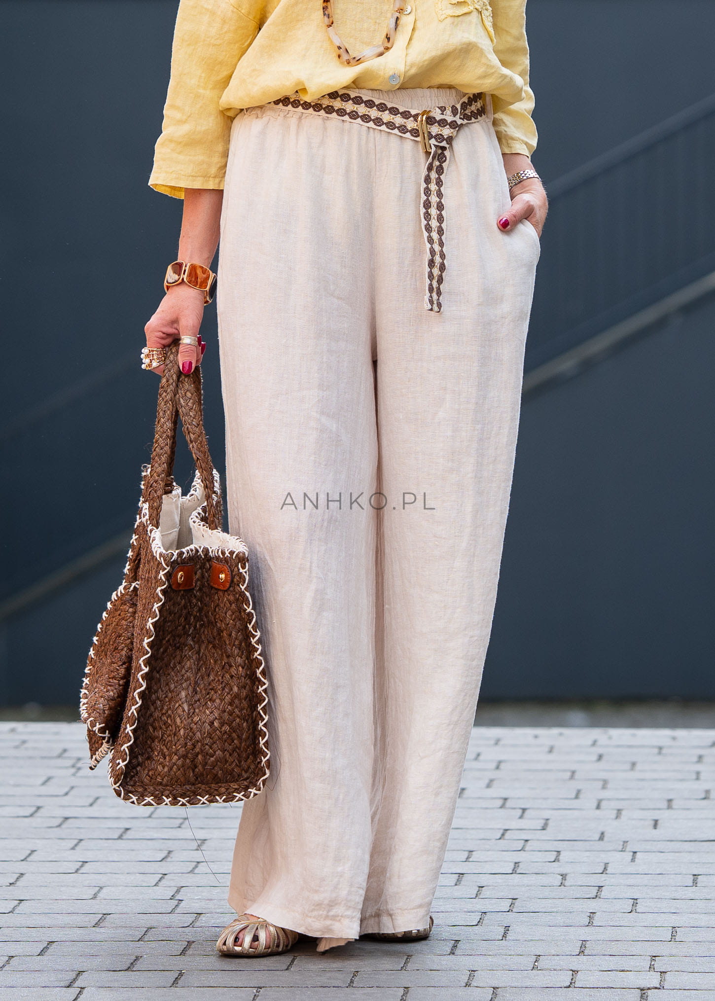 Luźny, wydłużony fason z szeroką nogawką pięknie układa się na sylwetce, optycznie ją wysmuklając. Elastyczny pas zapewnia wygodne dopasowanie, a ozdobny pasek w stylu boho dodaje charakteru i stanowi subtelny, modowy akcent. To model, który świetnie odnajdzie się zarówno w codziennych stylizacjach, jak i bardziej dopracowanych, letnich zestawach.