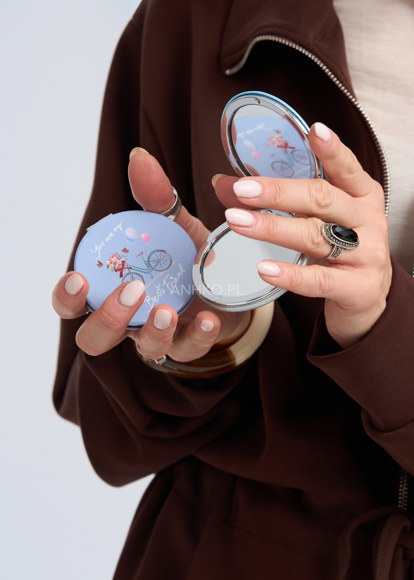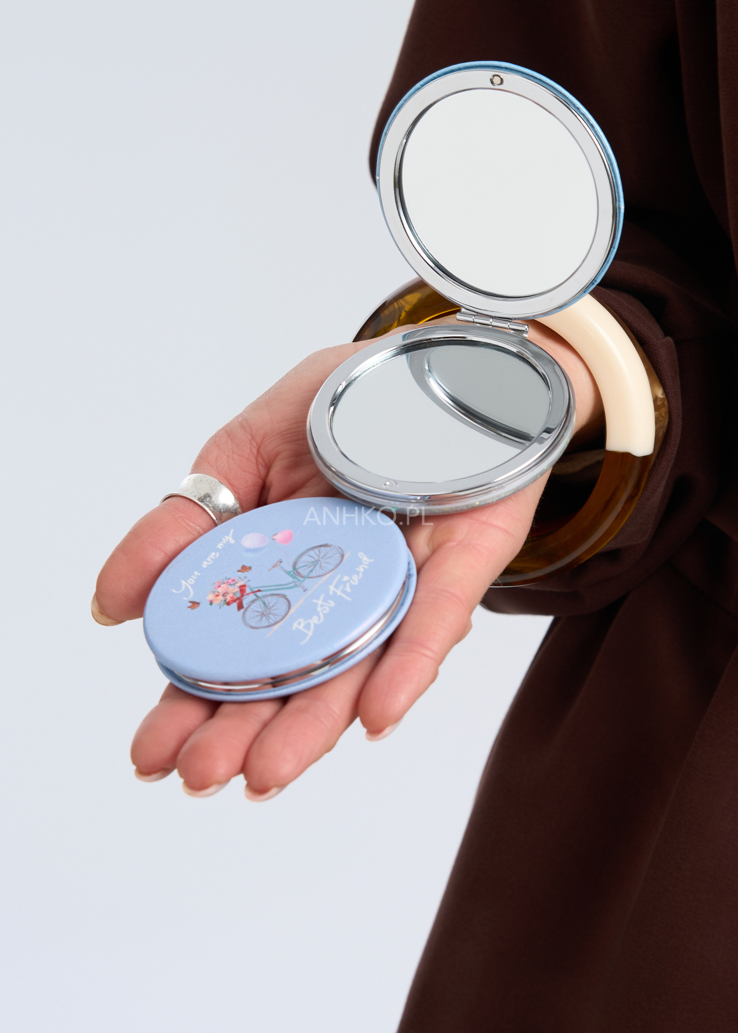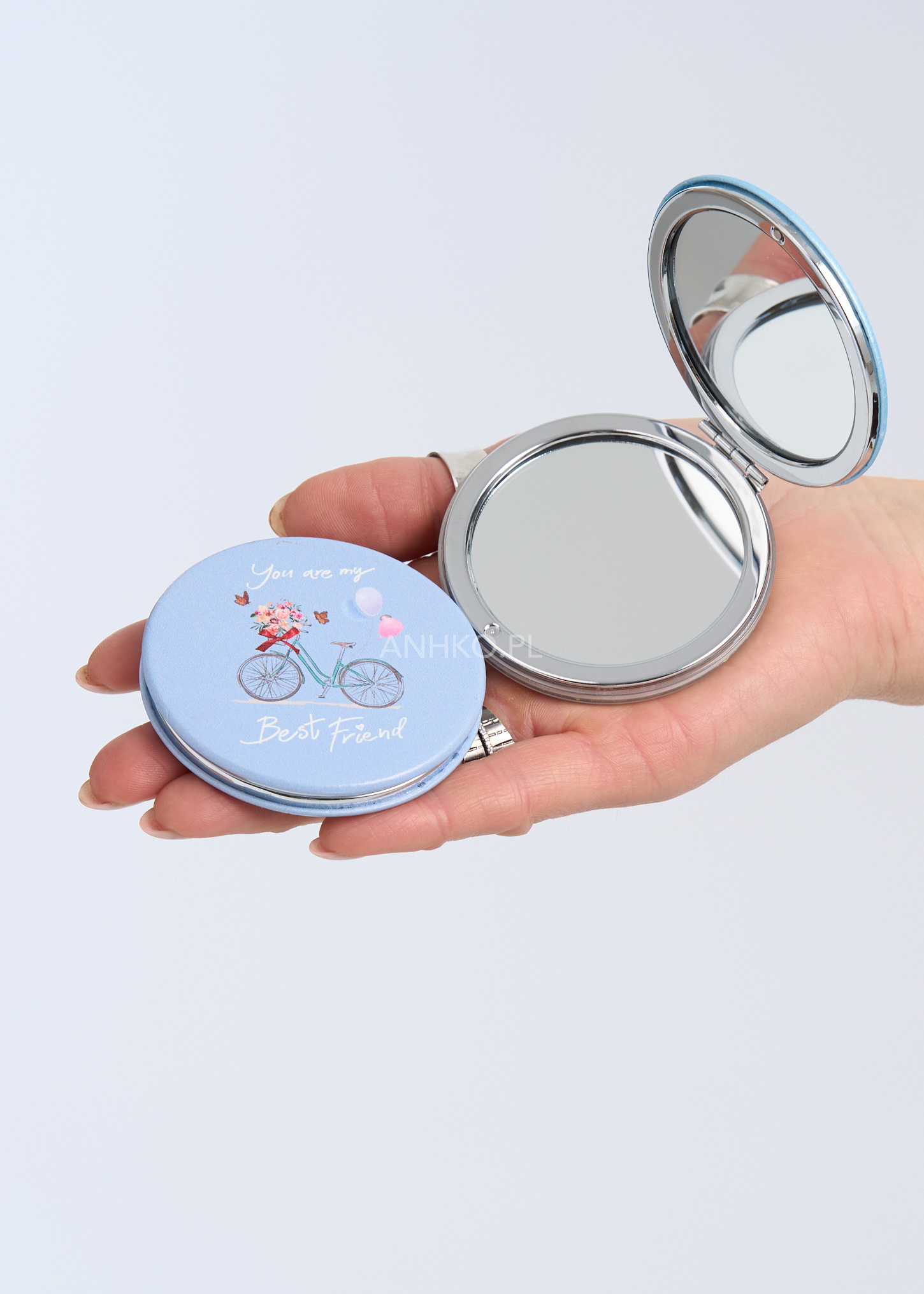 Stylowe lusterko kieszonkowe to praktyczny dodatek, który warto mieć zawsze pod ręką. Zamknięte w okrągłej, eleganckiej obudowie w pastelowym odcieniu błękitu, zachwyca subtelną grafiką z motywem roweru i hasłem „You are my Best Friend”. Kompaktowy format sprawia, że bez problemu zmieści się w torebce, kosmetyczce lub kieszeni płaszcza. Lusterko doskonale sprawdzi się na co dzień – w pracy, w podróży, na spotkaniu czy podczas szybkich poprawek makijażu. To również uroczy pomysł na drobny prezent dla bliskiej osoby. Delikatny design i funkcjonalność tworzą połączenie, które pasuje do kobiecego, minimalistycznego stylu.