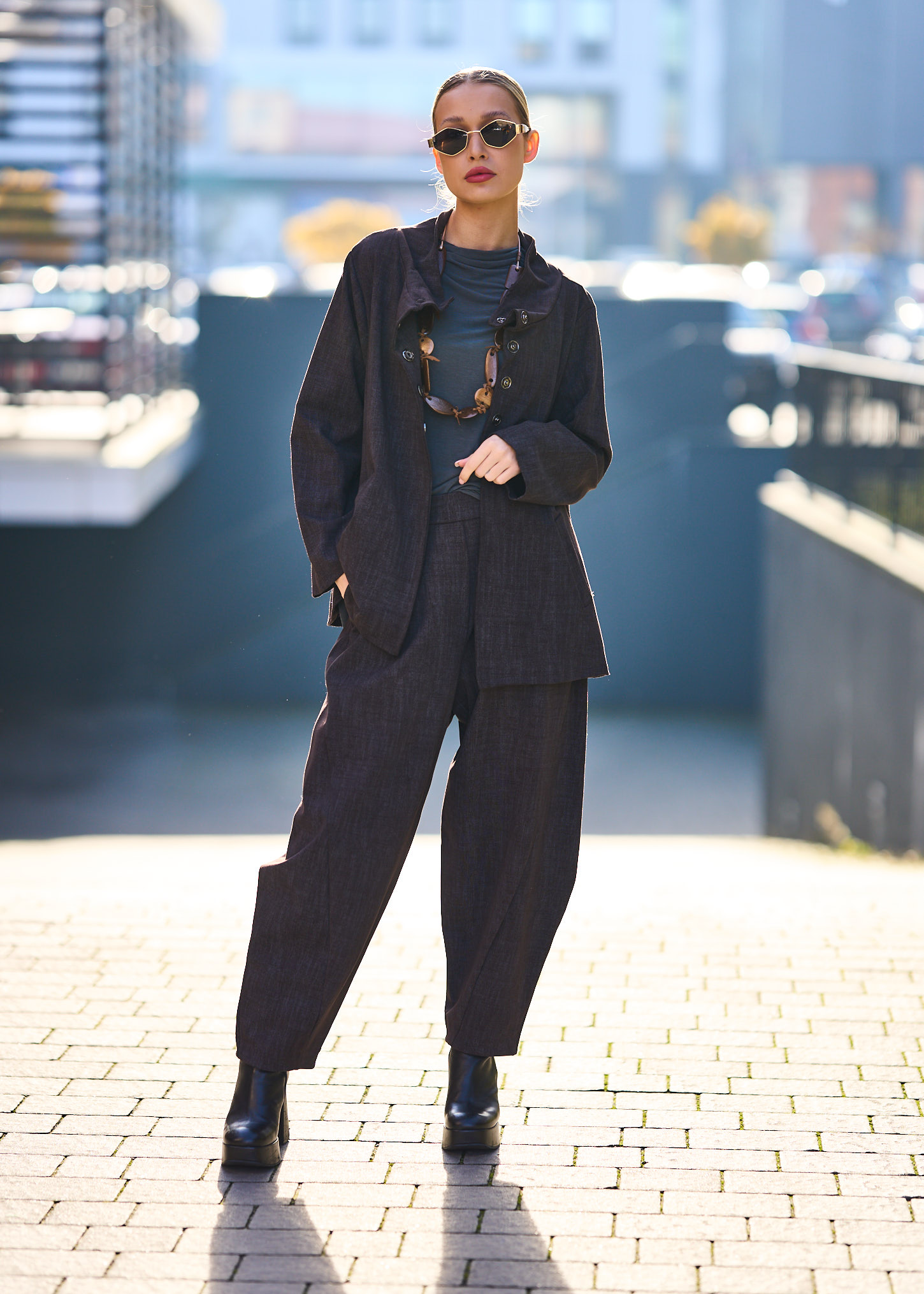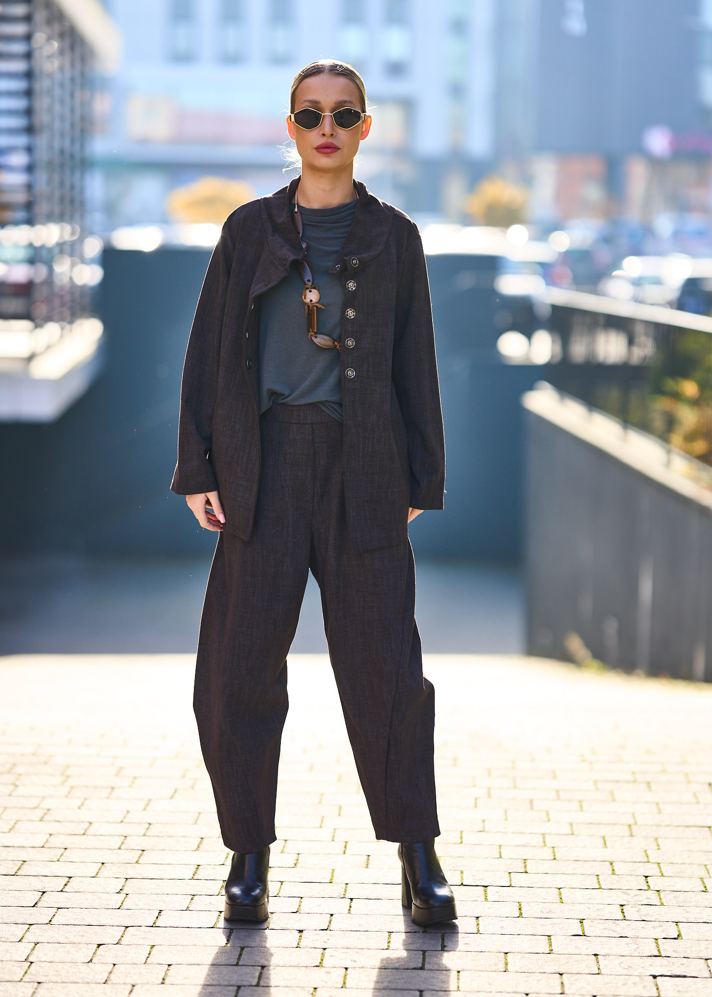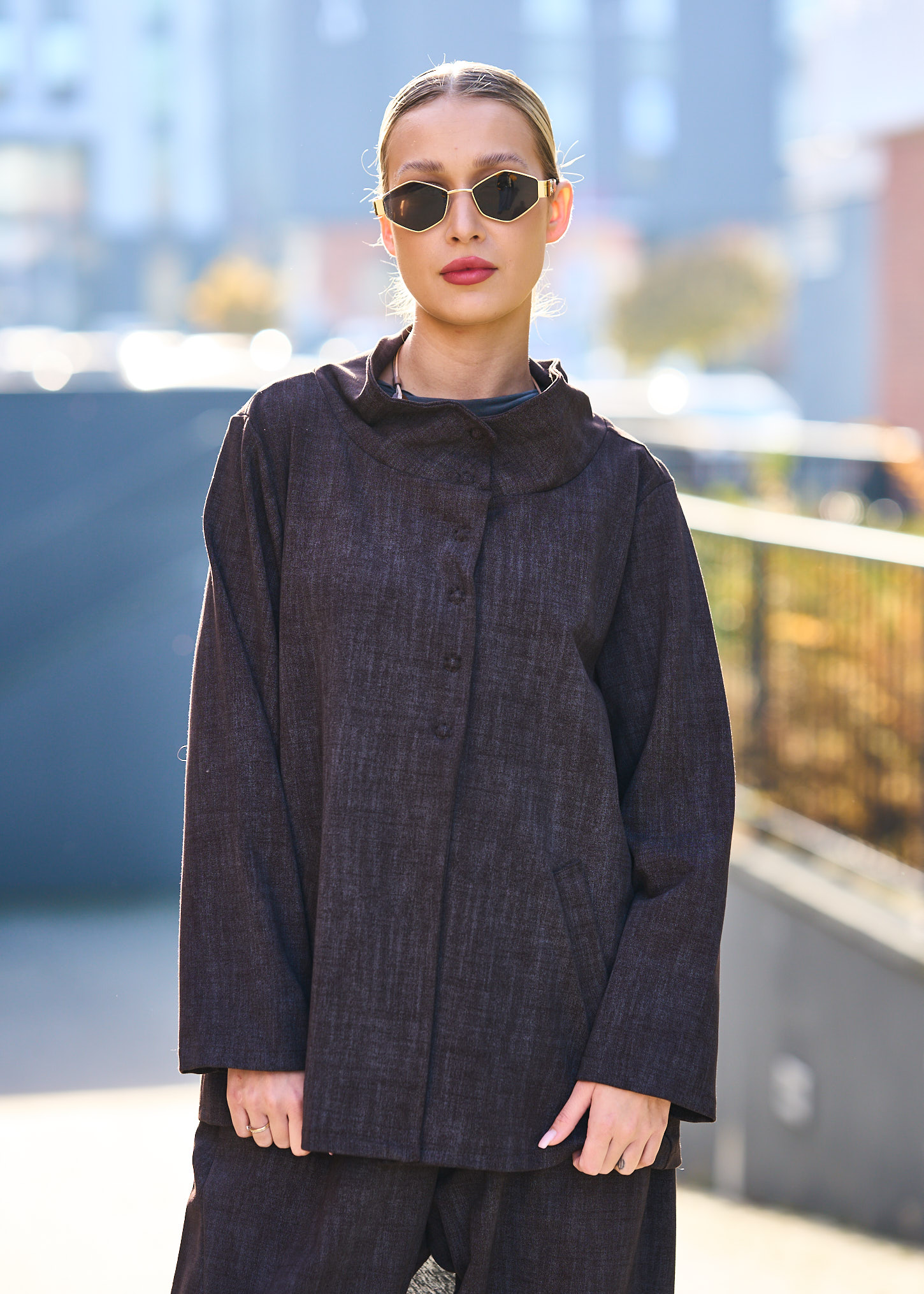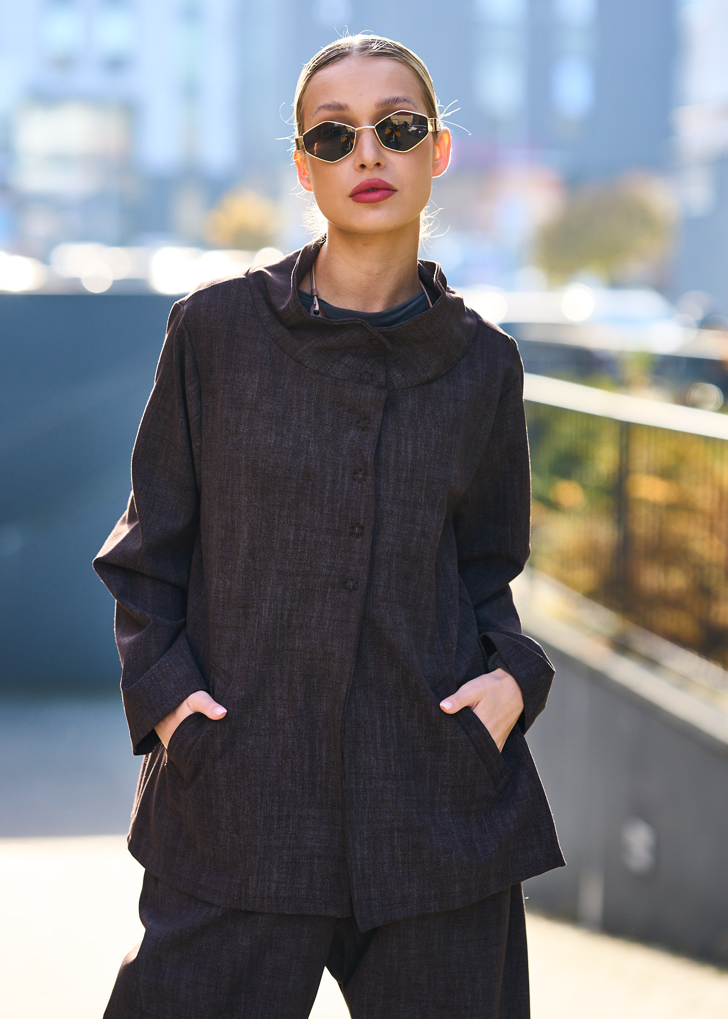 Ta stylowa, włoska marynarka to idealne połączenie wygody i elegancji. Wykonana z miękkiej, lekkiej tkaniny doskonale układa się na sylwetce, zapewniając komfort przez cały dzień. Charakterystyczna stójka zapinana na metalowe napy dodaje jej nowoczesnego wyglądu, a dwie praktyczne kieszenie po bokach zwiększają funkcjonalność. Marynarka nie posiada podszewki, dzięki czemu jest lekka i świetna na sezon wiosenny oraz jesienny, a także jako alternatywa dla klasycznej kurtki. Pasuje zarówno do spodni materiałowych, jak i dżinsów, tworząc stylizacje idealne do pracy, na spotkania czy codzienne wyjścia.
