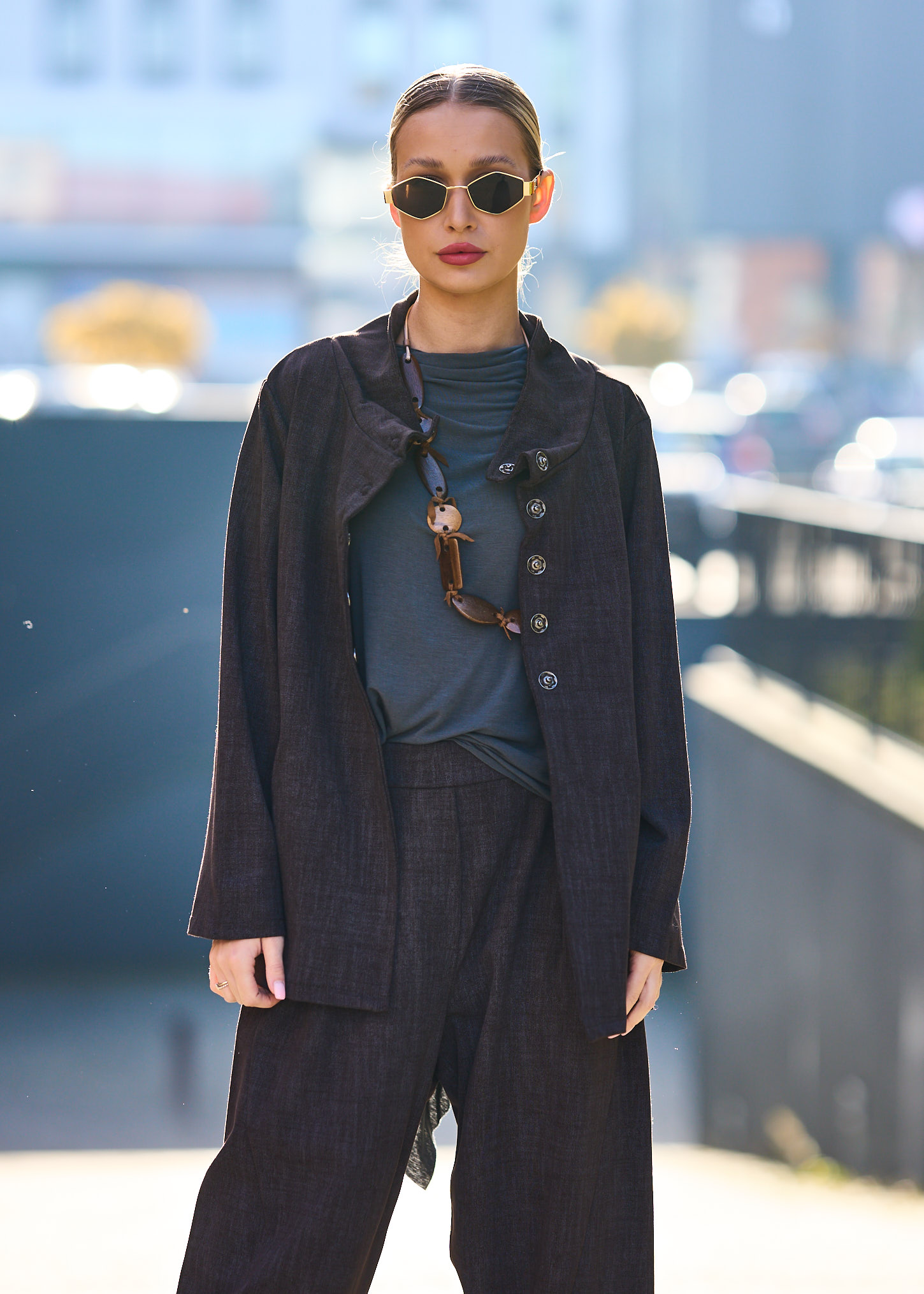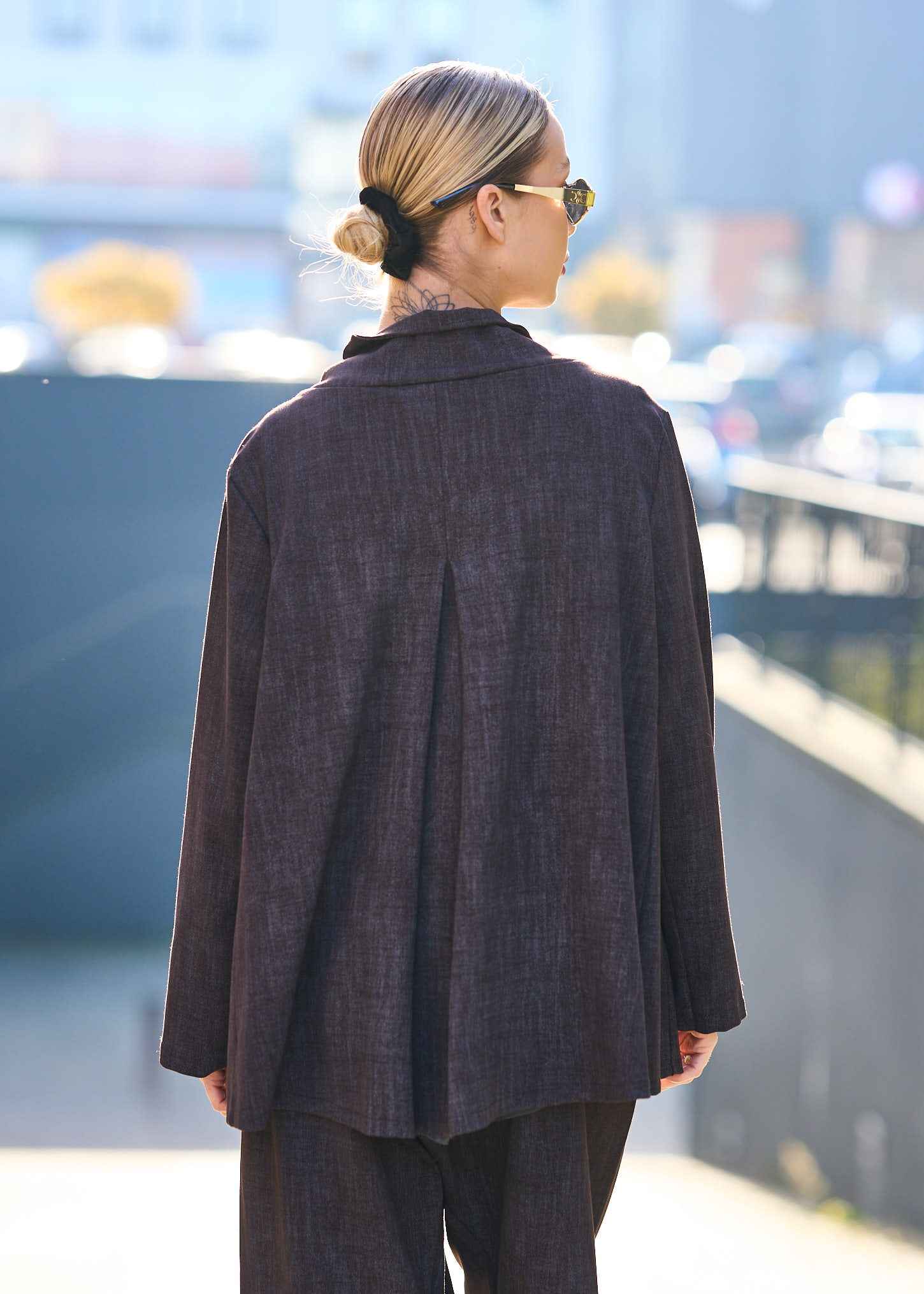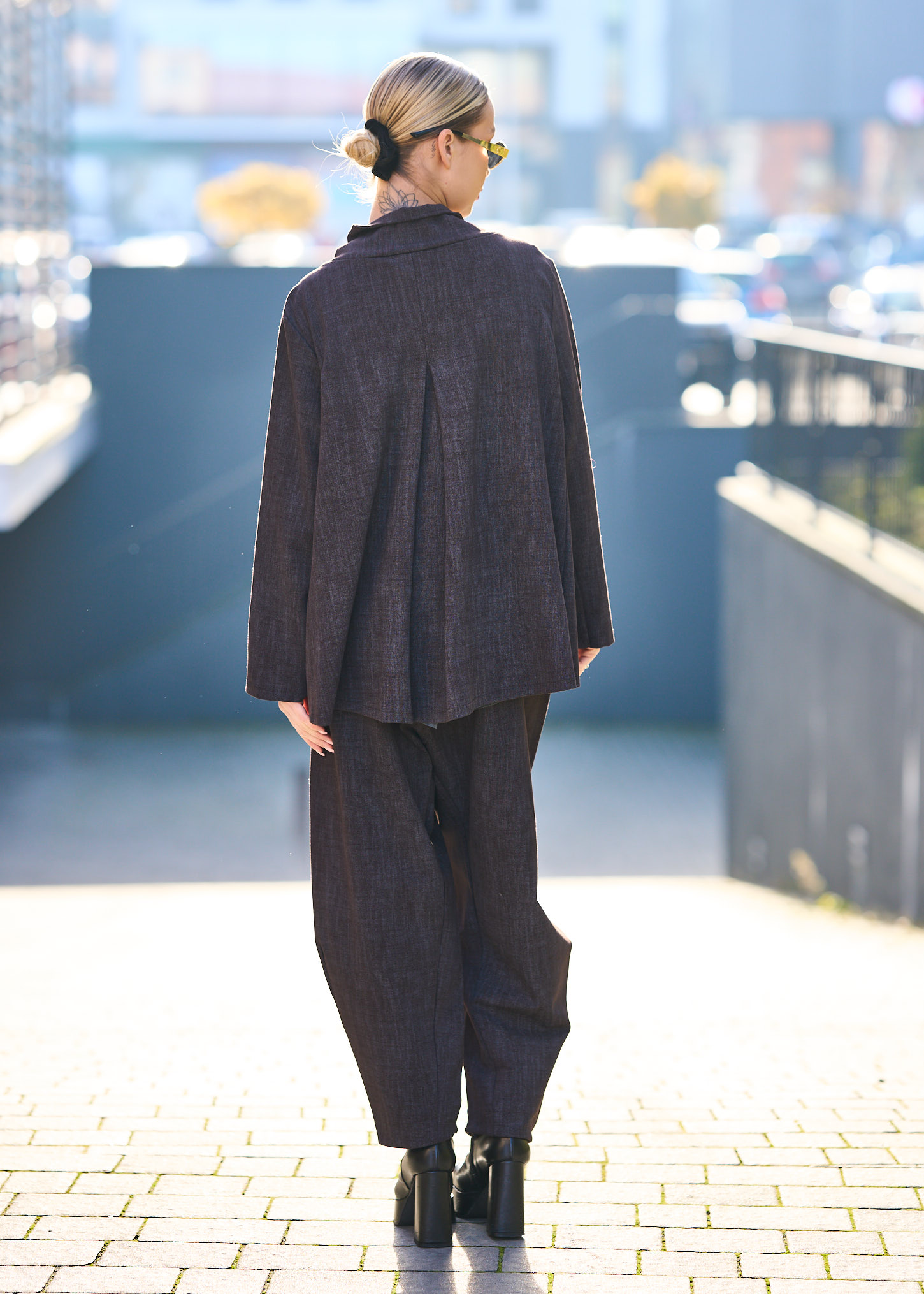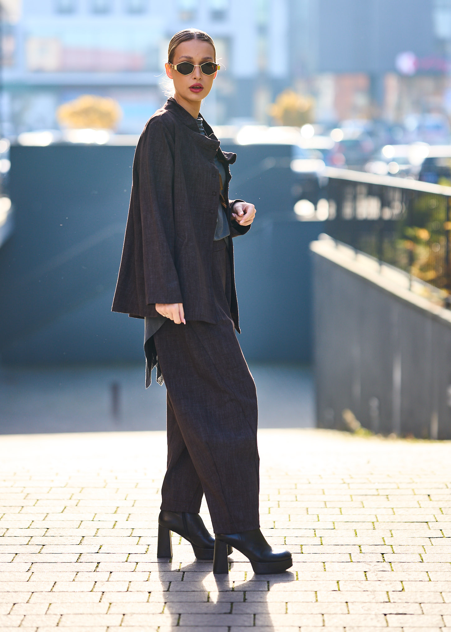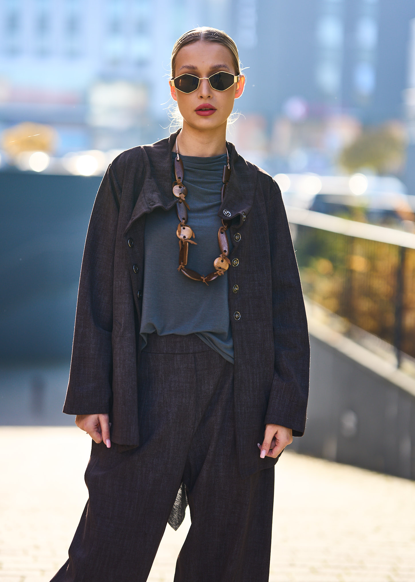Ta stylowa, włoska marynarka to idealne połączenie wygody i elegancji. Wykonana z miękkiej, lekkiej tkaniny doskonale układa się na sylwetce, zapewniając komfort przez cały dzień. Charakterystyczna stójka zapinana na metalowe napy dodaje jej nowoczesnego wyglądu, a dwie praktyczne kieszenie po bokach zwiększają funkcjonalność. Marynarka nie posiada podszewki, dzięki czemu jest lekka i świetna na sezon wiosenny oraz jesienny, a także jako alternatywa dla klasycznej kurtki. Pasuje zarówno do spodni materiałowych, jak i dżinsów, tworząc stylizacje idealne do pracy, na spotkania czy codzienne wyjścia.