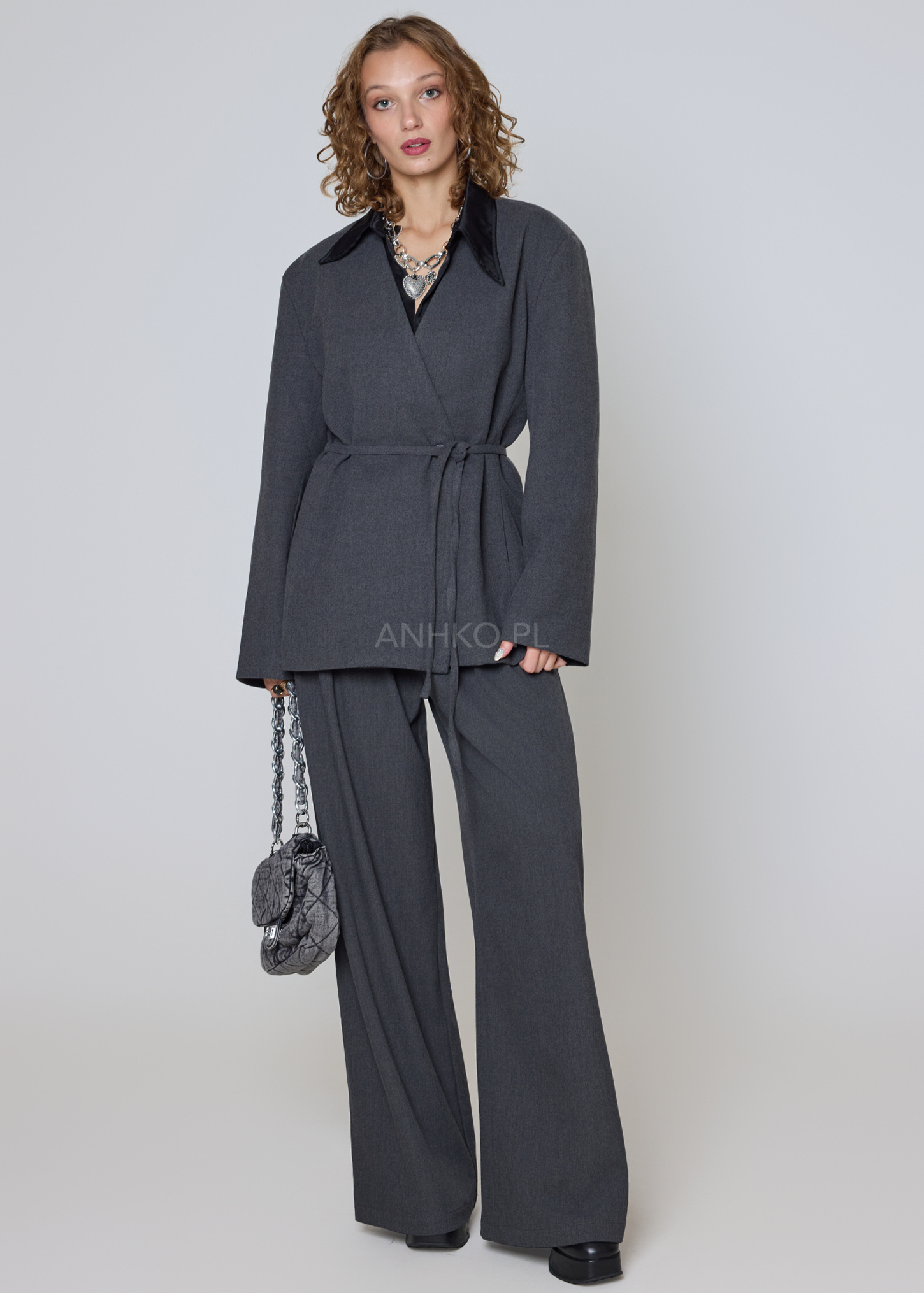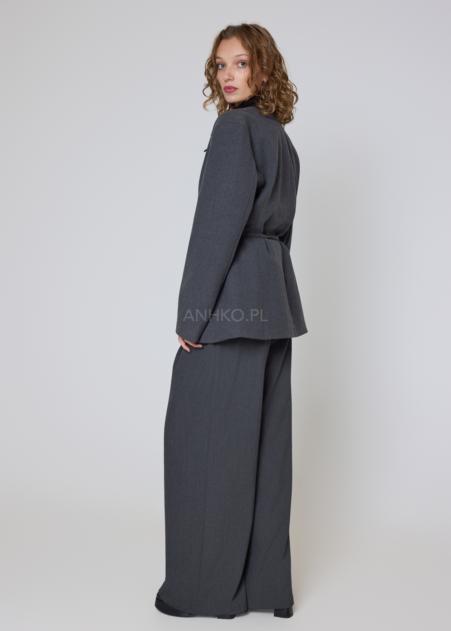 Spodnie Meriviar Grafitowe - Eleganckie, wygodne spodnie o szerokiej nogawce, z praktycznymi kieszeniami i subtelnymi zakładkami w talii. Idealne do pracy, na spotkania i codzienne wyjścia – łączą klasykę z nowoczesnym komfortem.