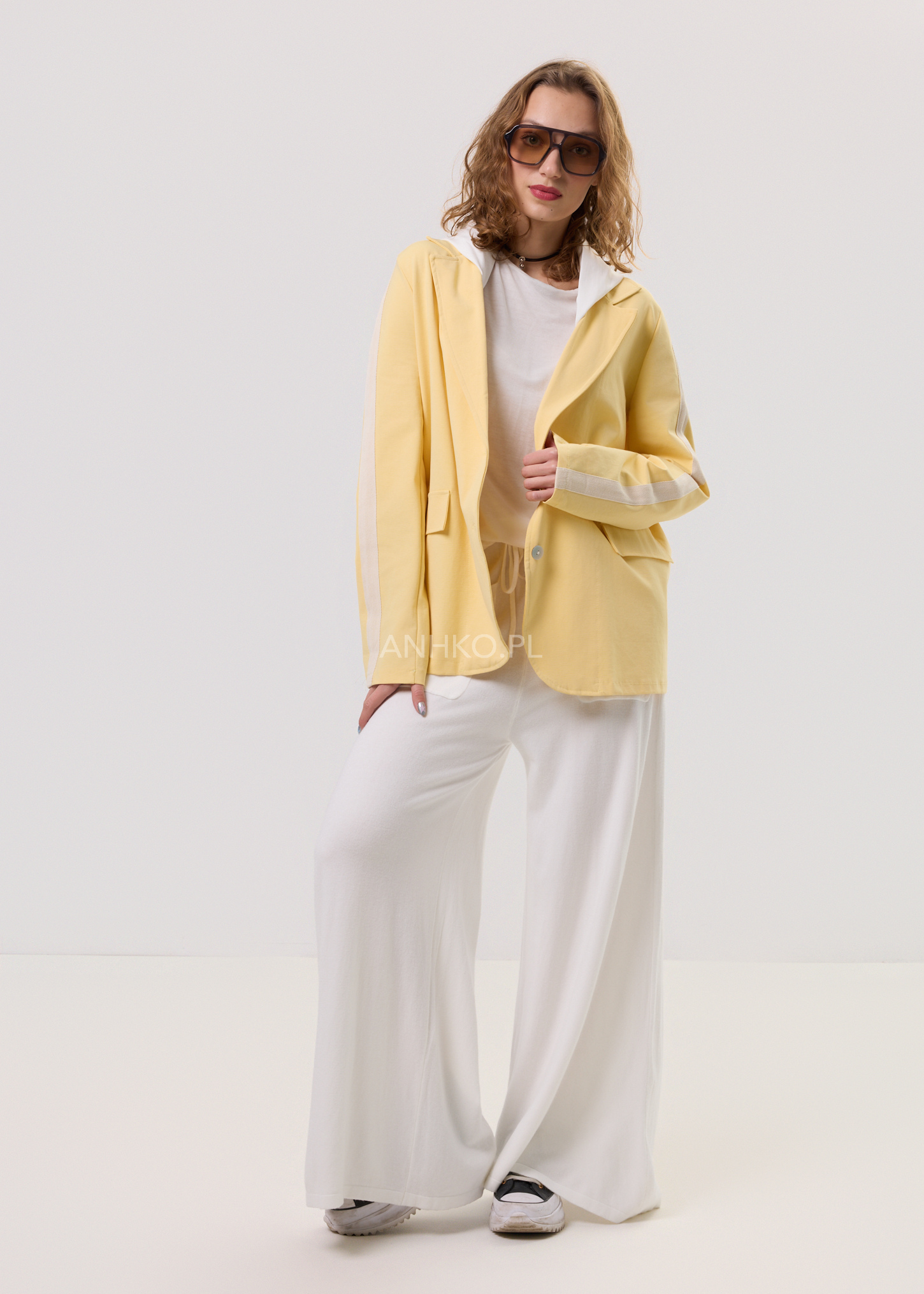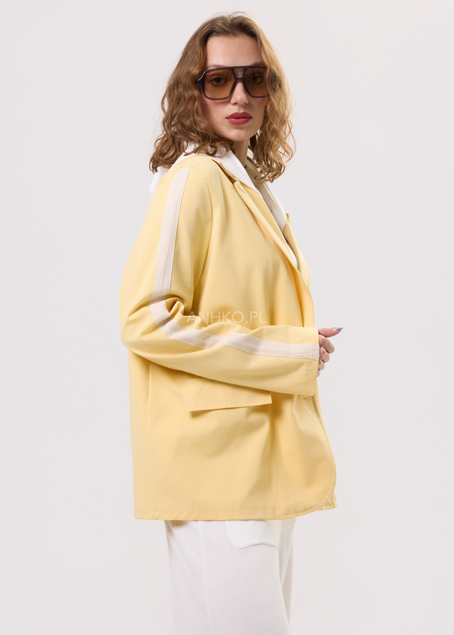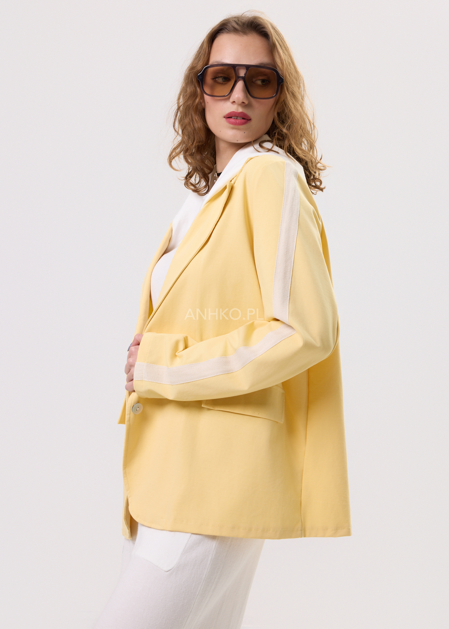 Model zapinany na dwa guziki, z subtelnymi kieszeniami z przodu oraz ozdobnym lampasem na rękawach, który optycznie wysmukla ramiona. Elastyczna tkanina z dodatkiem elastanu gwarantuje wysoki komfort noszenia i dopasowanie bez uczucia sztywności. To propozycja dla kobiet, które cenią połączenie casualu i nowoczesnej elegancji w jednej formie.