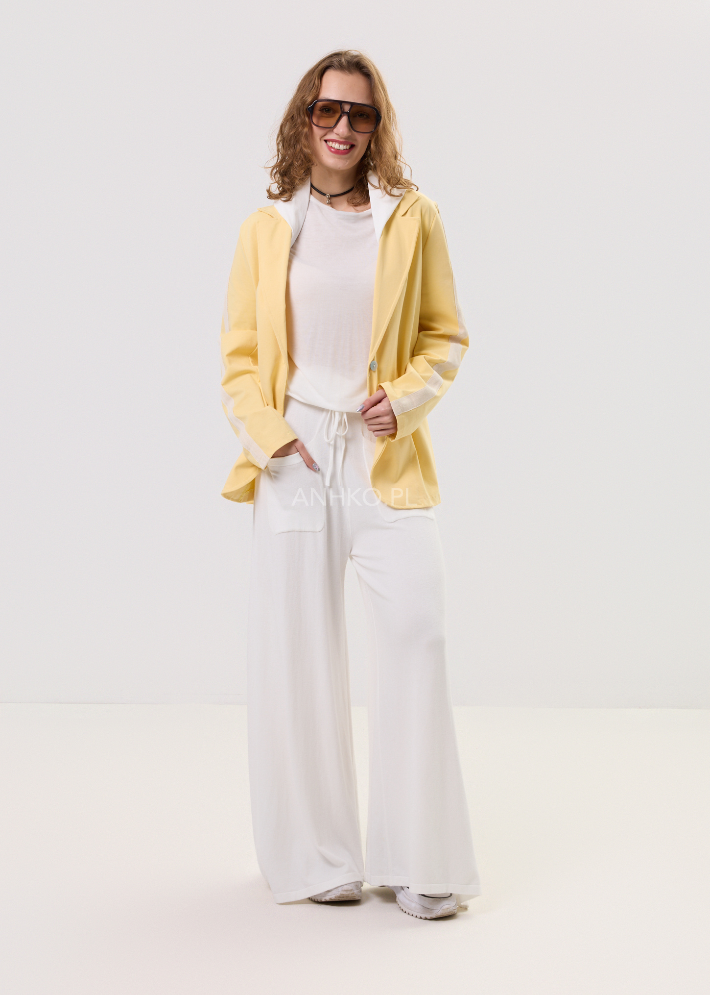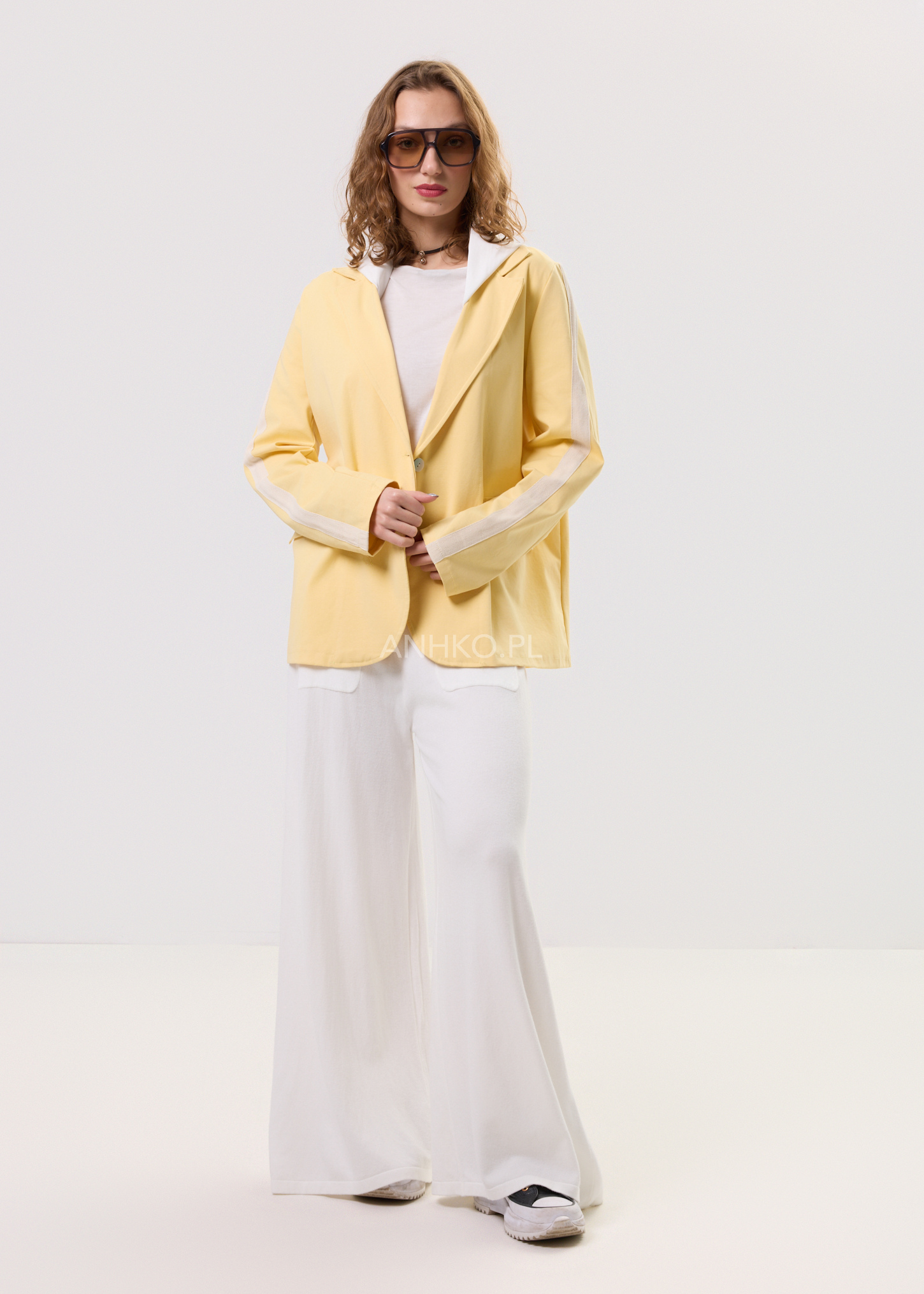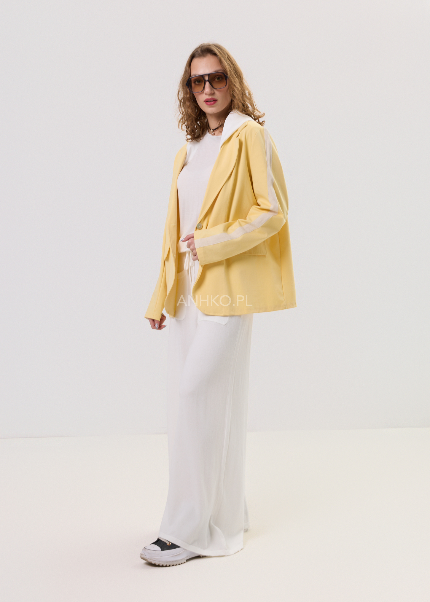Model zapinany na dwa guziki, z subtelnymi kieszeniami z przodu oraz ozdobnym lampasem na rękawach, który optycznie wysmukla ramiona. Elastyczna tkanina z dodatkiem elastanu gwarantuje wysoki komfort noszenia i dopasowanie bez uczucia sztywności. To propozycja dla kobiet, które cenią połączenie casualu i nowoczesnej elegancji w jednej formie.