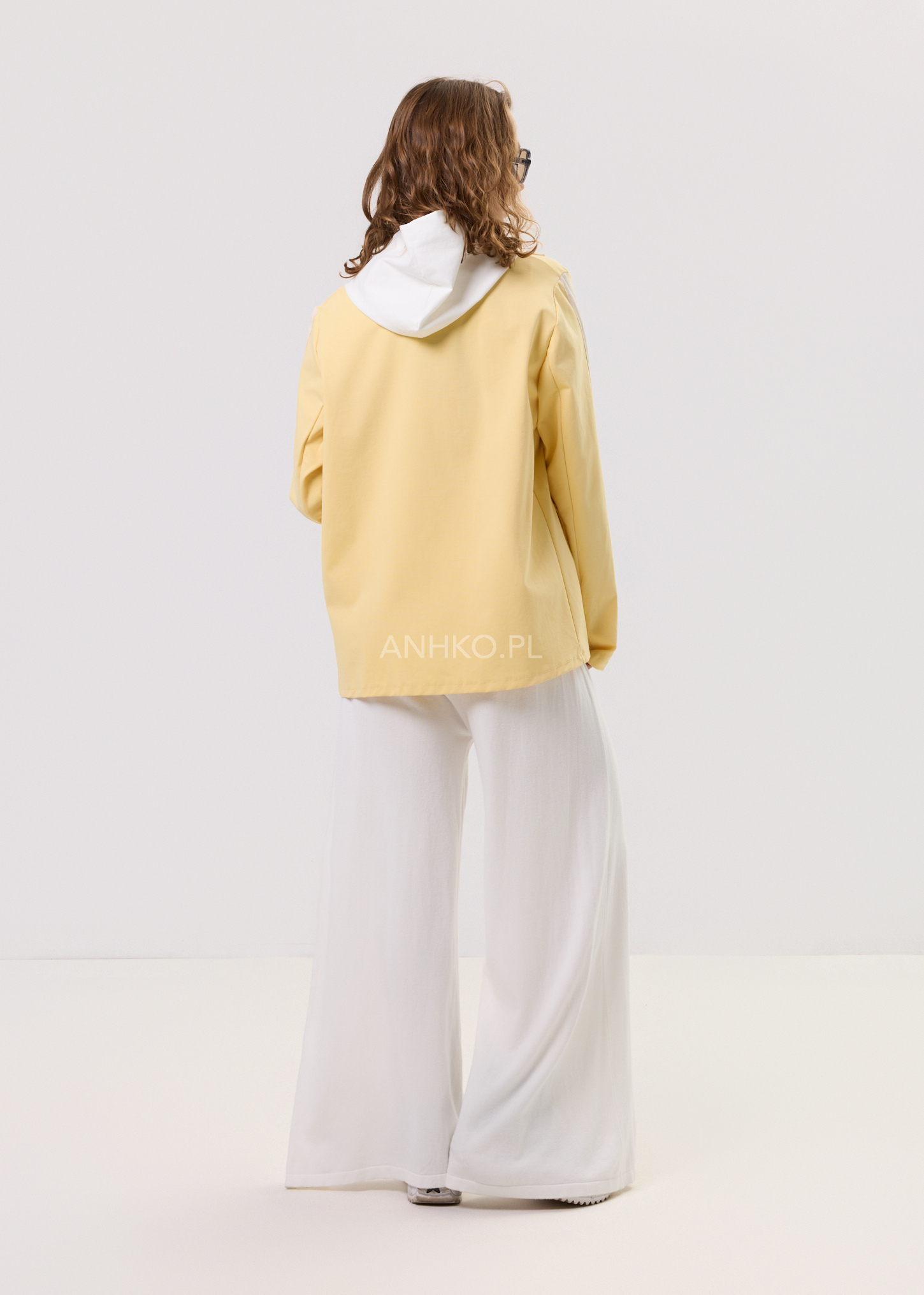 Ta marynarka damska o luźnym, lekko oversize’owym kroju swobodnie opada na sylwetkę, tworząc nowoczesną, warstwową formę. Miękka dzianina z przewagą bawełny sprawia, że model nie usztywnia ramion, a kontrastowy kaptur przełamuje klasyczną linię klap, nadając całości dynamicznego charakteru. Fason sięga do bioder i dobrze układa się zarówno rozpięty, jak i zapięty na guziki.