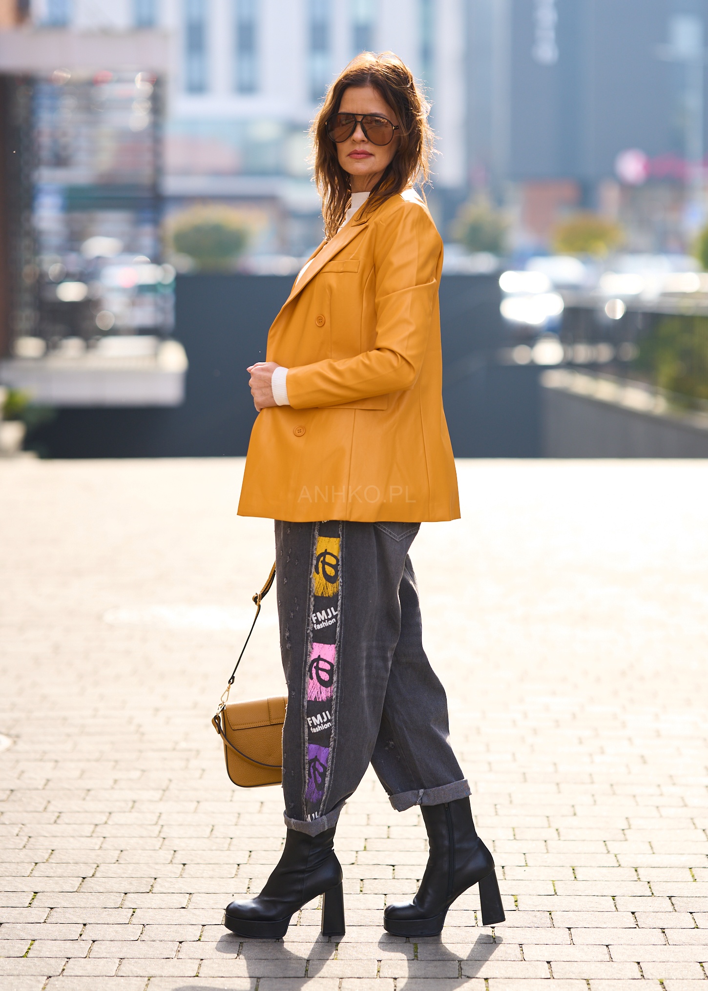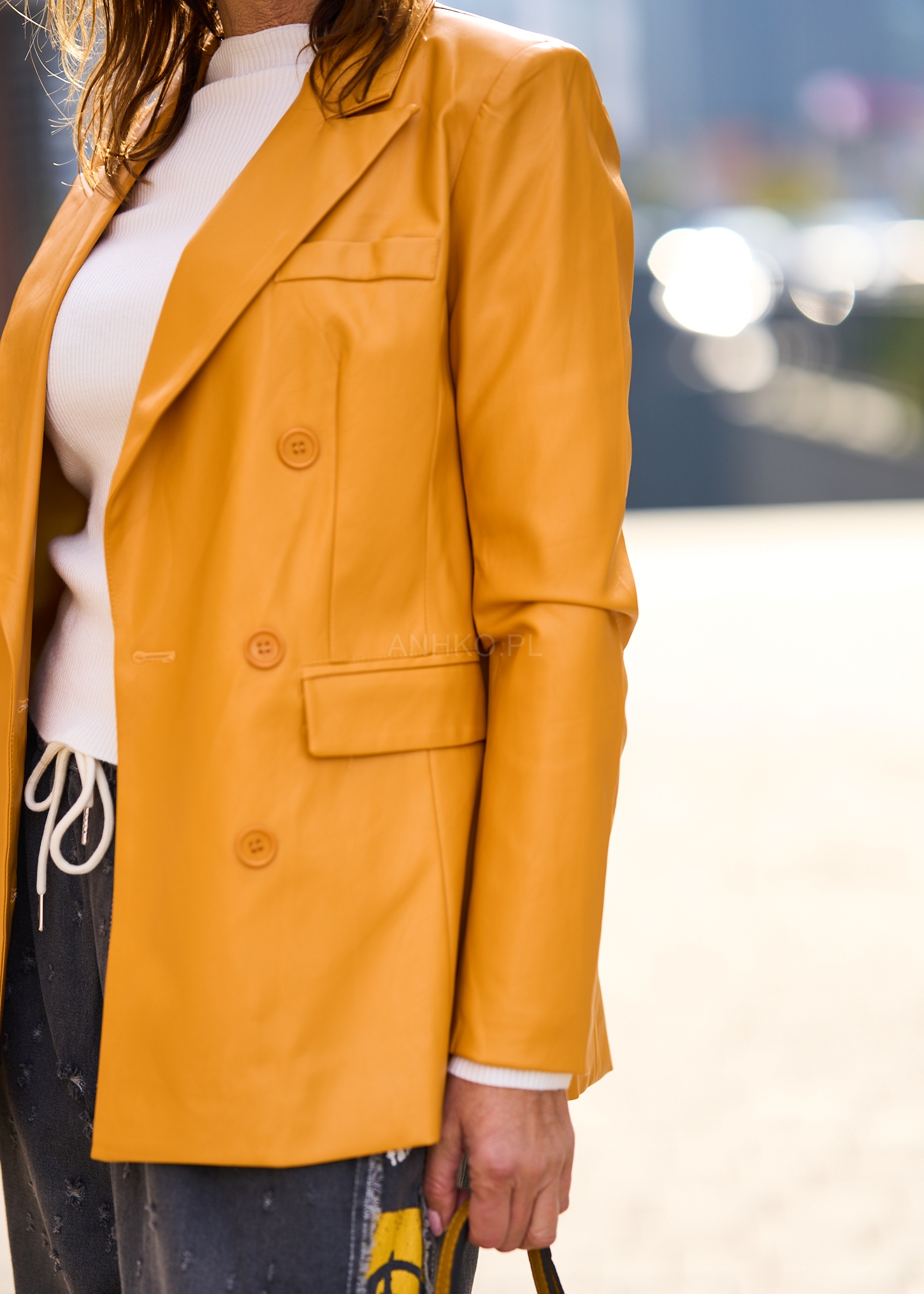 To stylowa propozycja dla kobiet, które lubią wyraziste, ale eleganckie elementy w garderobie. Wykonana z miękkiej ekoskóry, w soczystym odcieniu żółci, posiada klasyczny fason z klapami i dwurzędowym zapięciem. Świetnie sprawdzi się zarówno w stylizacji biznesowej z białą koszulą i cygaretkami, jak i w casualowym wydaniu z jeansami i sneakersami. Idealna na wiosnę, chłodne letnie wieczory, a także do biura i na spotkania. Dzięki podszewce i dopracowanym detalom wygląda profesjonalnie i stylowo.