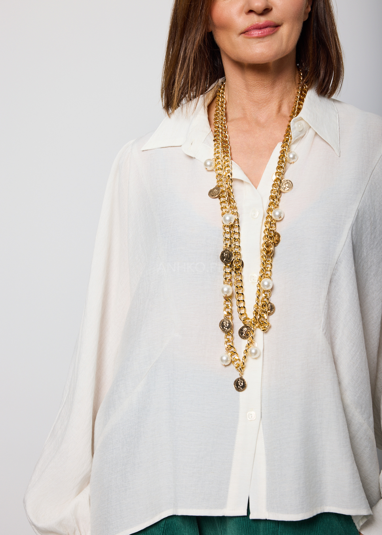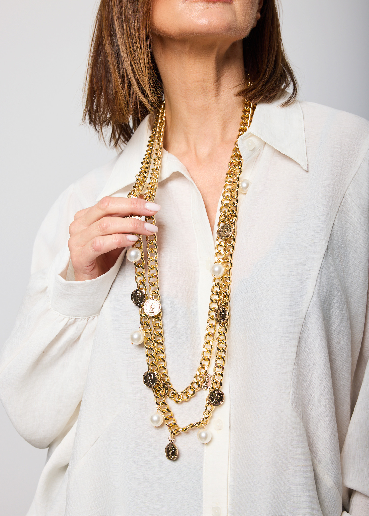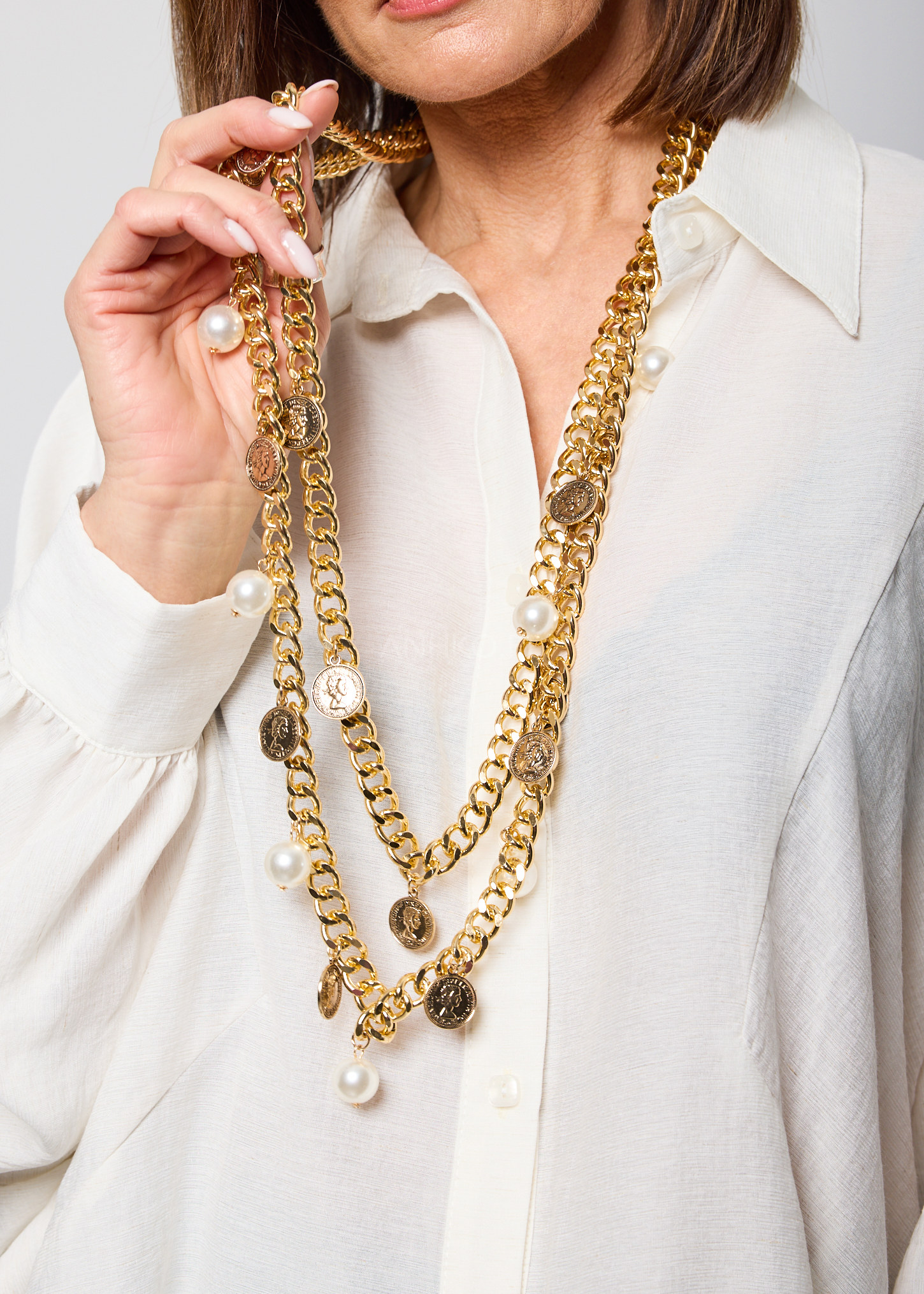 Propozycja dla osób, które lubią zdecydowane, wyraziste dodatki. Składa się z dwóch warstw grubych, złotych łańcuchów, które pięknie odbijają światło i podkreślają linię dekoltu. Całość urozmaicają duże perłowe koraliki oraz zawieszki w formie monet, dodające biżuterii charakteru vintage. Model świetnie komponuje się z eleganckimi sukienkami, koszulami, golfami oraz klasycznymi t-shirtami. Sprawdzi się zarówno na co dzień, jak i na wyjątkowe okazje – randki, kolacje, eventy, a nawet świąteczne stylizacje.