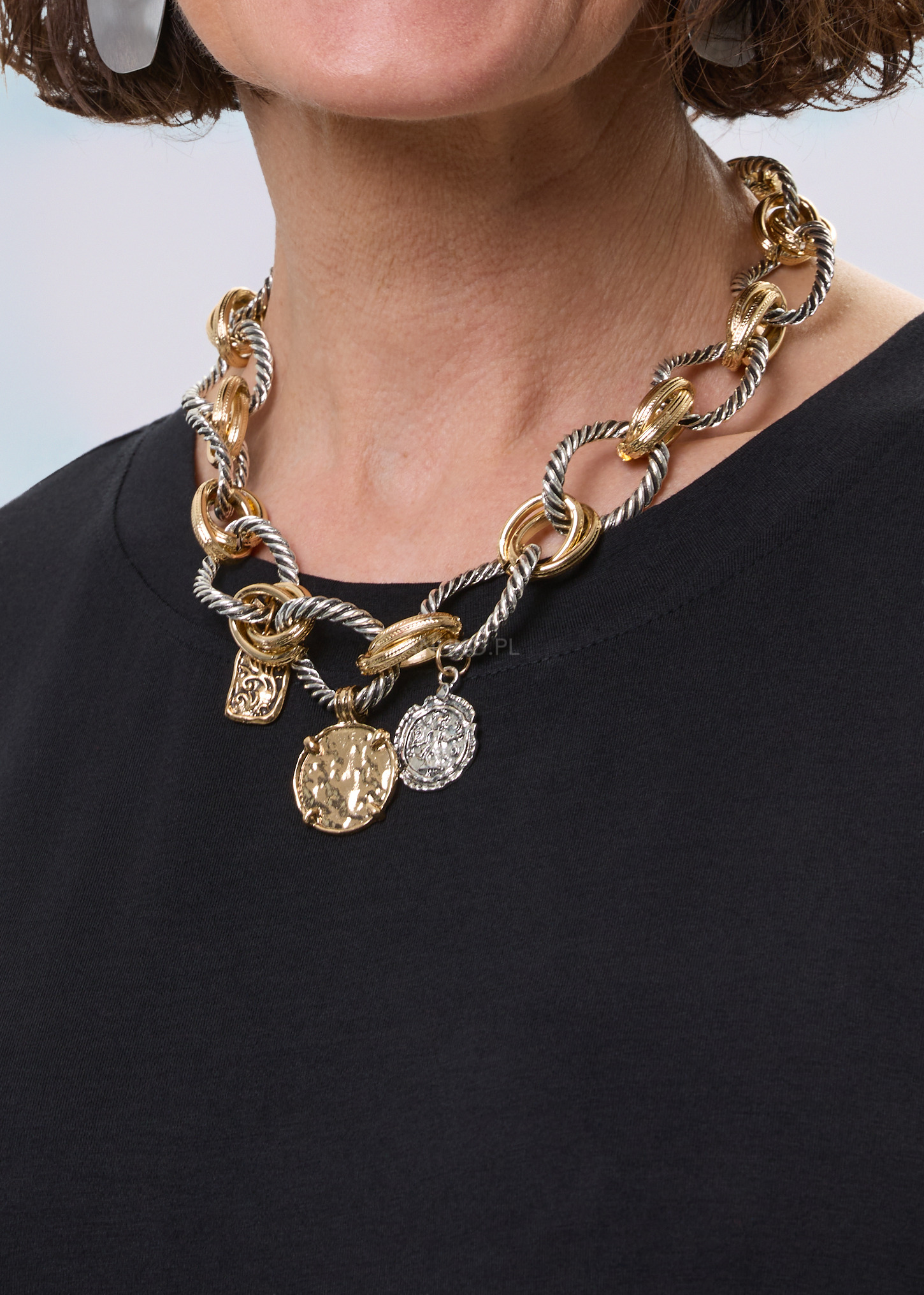 Ten naszyjnik przyciąga uwagę już od pierwszego spojrzenia. Masywne, przeplatane ogniwa w złoto-srebrnym wykończeniu tworzą efekt mocnego, nowoczesnego akcentu, który pięknie podbija proste stylizacje. Model układa się przy dekolcie w sposób wyrazisty, ale nadal wygodny, dzięki czemu dobrze prezentuje się zarówno przy gładkich topach, jak i przy koszulach z bardziej otwartą linią szyi.