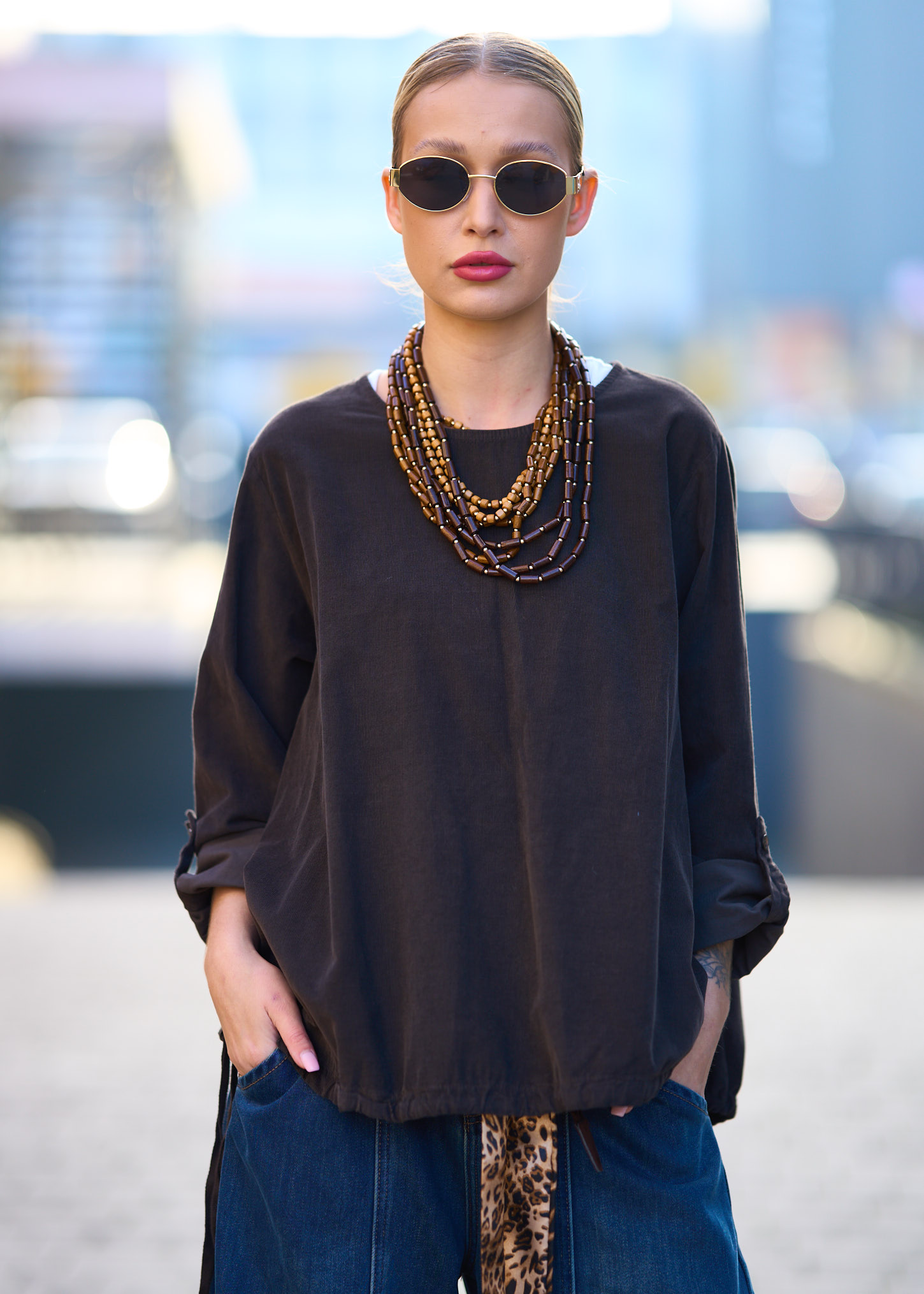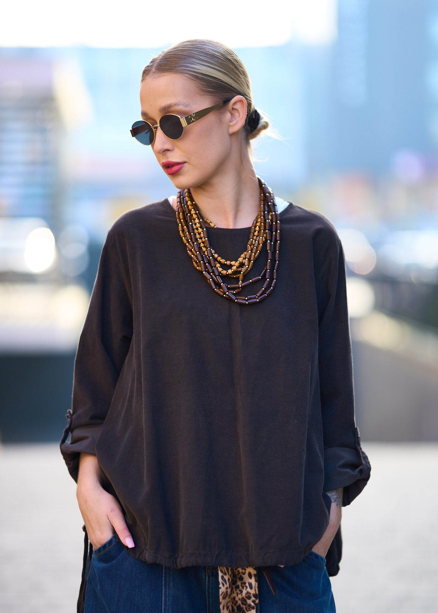 Wyjątkowa propozycja dla miłośniczek stylu boho, etno i naturalnych materiałów. Wykonany z wielu rzędów drewnianych koralików w różnych odcieniach brązu, tworzy efektowną, a jednocześnie lekką formę, która pięknie układa się na dekolcie. Złote przekładki dodają całości subtelnego blasku, dzięki czemu naszyjnik świetnie sprawdzi się zarówno w codziennych stylizacjach, jak i podczas letnich wyjazdów, festiwali czy spotkań ze znajomymi. Doskonale pasuje do lnianych sukienek, basicowych bluzek, swetrów i koszul. To dodatek, który ociepli każdą stylizację i nada jej wyjątkowego charakteru.