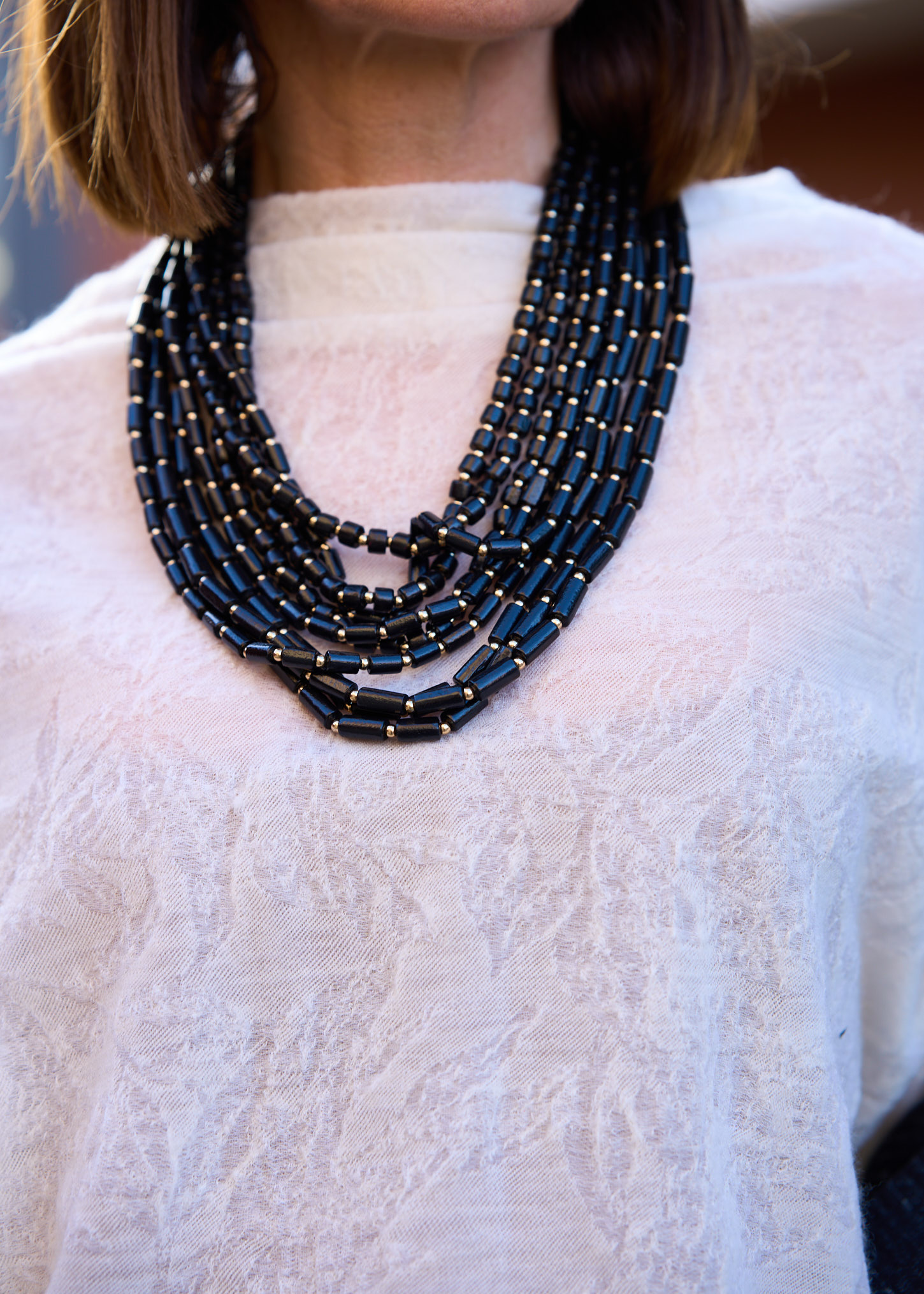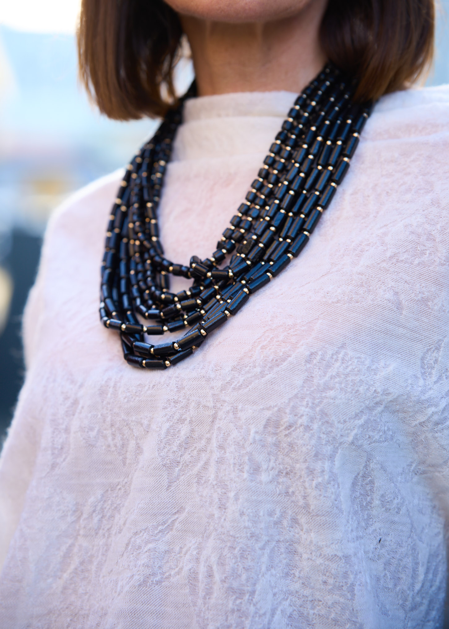 Wyjątkowa propozycja dla miłośniczek stylu boho, etno i naturalnych materiałów. Wykonany z wielu rzędów drewnianych koralików w klasycznym czarnym kolorze, tworzy efektowną, a jednocześnie lekką formę, która pięknie układa się na dekolcie. Złote przekładki dodają całości subtelnego blasku, dzięki czemu naszyjnik świetnie sprawdzi się zarówno w codziennych stylizacjach, jak i podczas letnich wyjazdów, festiwali czy spotkań ze znajomymi. Doskonale pasuje do lnianych sukienek, basicowych bluzek, swetrów i koszul. To dodatek, który podkreśli każdą stylizację i nada jej wyjątkowego charakteru.