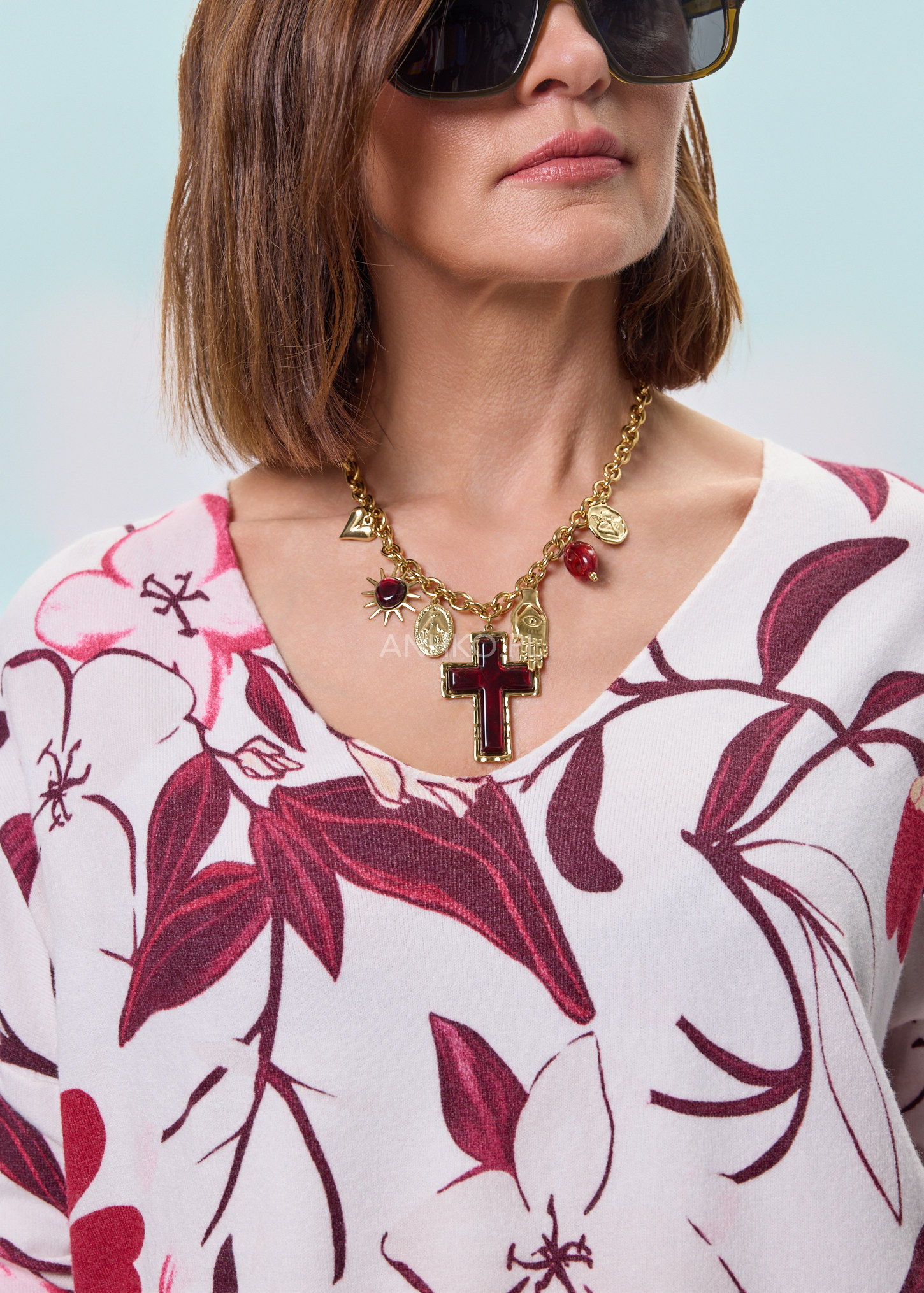 Wyrazisty naszyjnik zaprojektowany z myślą o osobach, które traktują biżuterię jako główny element stylizacji. Solidny, złocony łańcuch został uzupełniony bordowymi elementami oraz dekoracyjnymi zawieszkami o symbolicznym charakterze: krzyżem, dłonią, słońcem, sercem oraz medalionami. Połączenie ciepłego złota z głęboką czerwienią nadaje całości elegancki, lekko mistyczny wygląd. Naszyjnik pięknie prezentuje się na tle prostych form – gładkich sukienek, koszul, golfów czy minimalistycznych topów. Sprawdzi się zarówno w stylizacjach wieczorowych, jak i jako mocny akcent do codziennych, miejskich zestawów. Idealny na wyjścia, eventy, kolacje oraz spotkania towarzyskie.