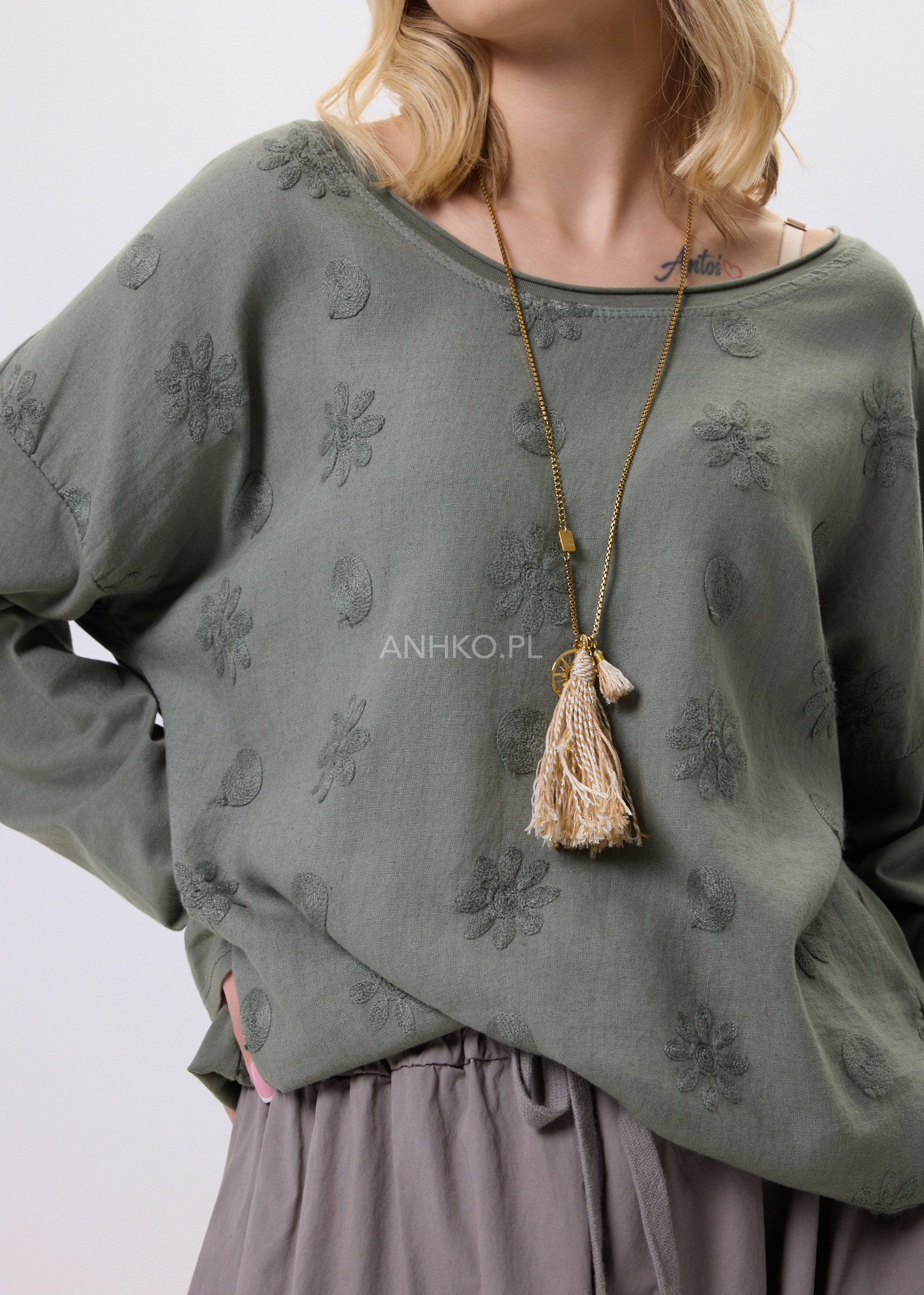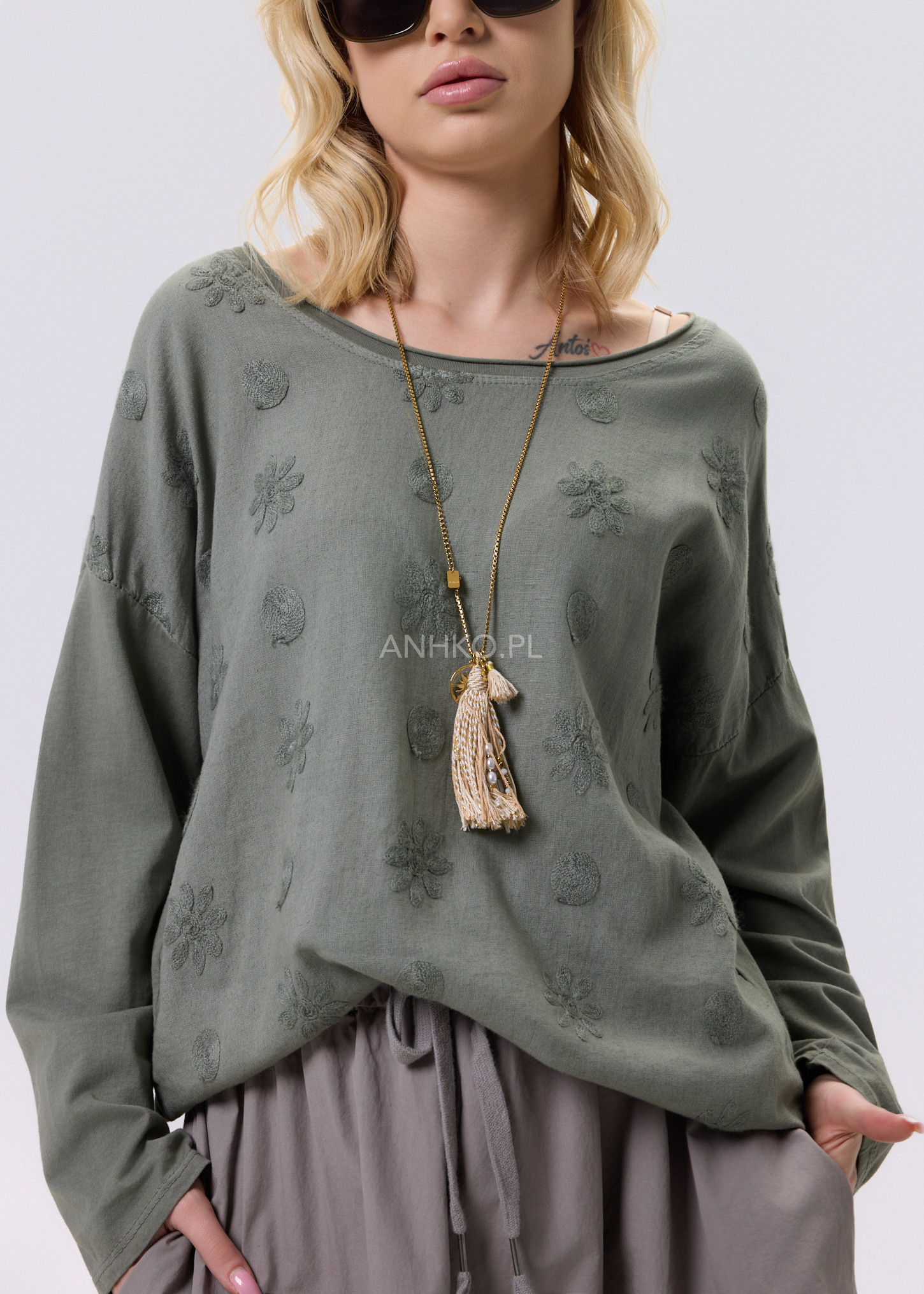 Bluzka Margot Poise Khaki - Luźna bluzka o subtelnej fakturze i delikatnym wzorze, zaprojektowana z myślą o codziennym komforcie i niewymuszonej elegancji. Idealna do stylizacji casualowych i bardziej dopracowanych zestawów.