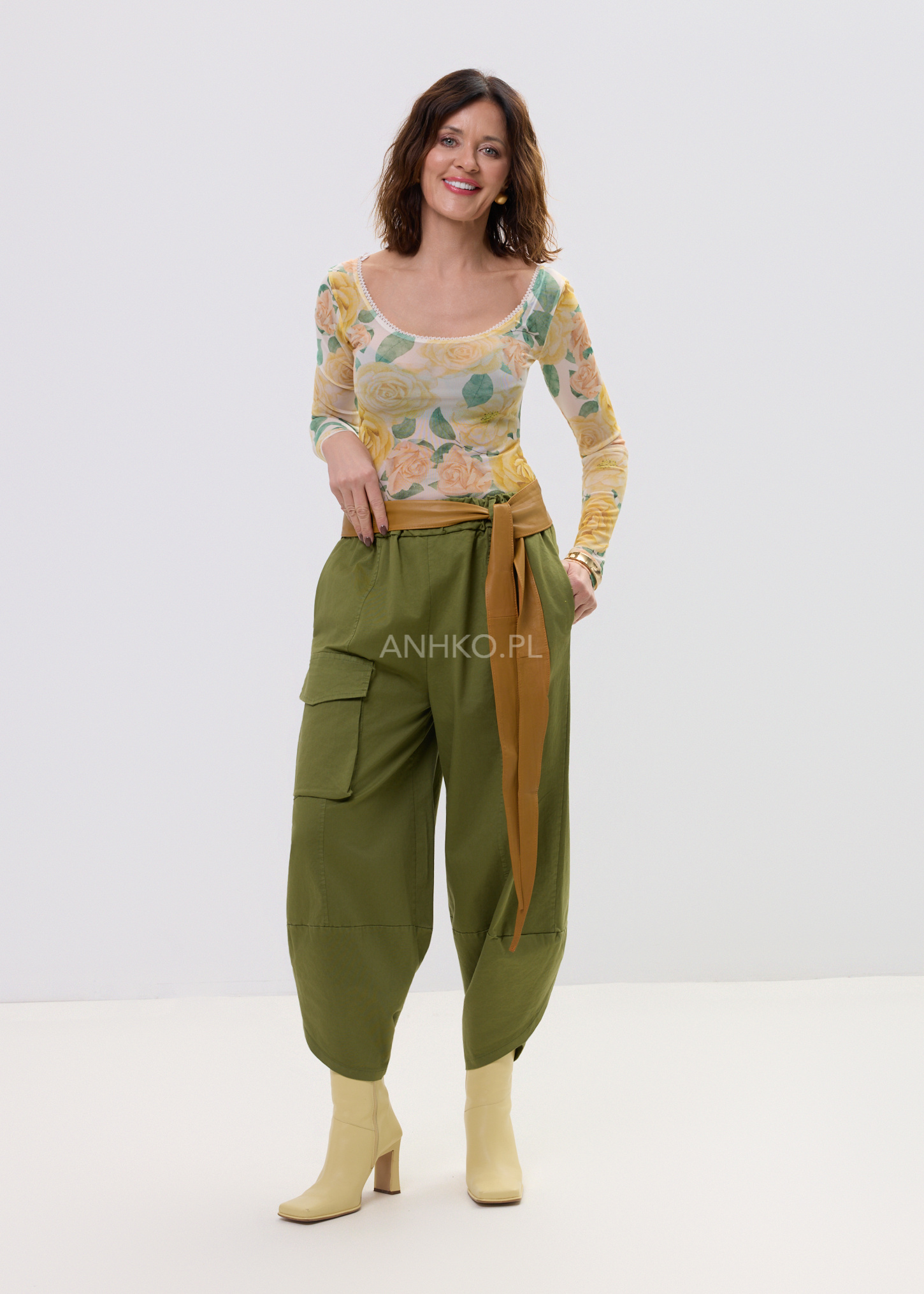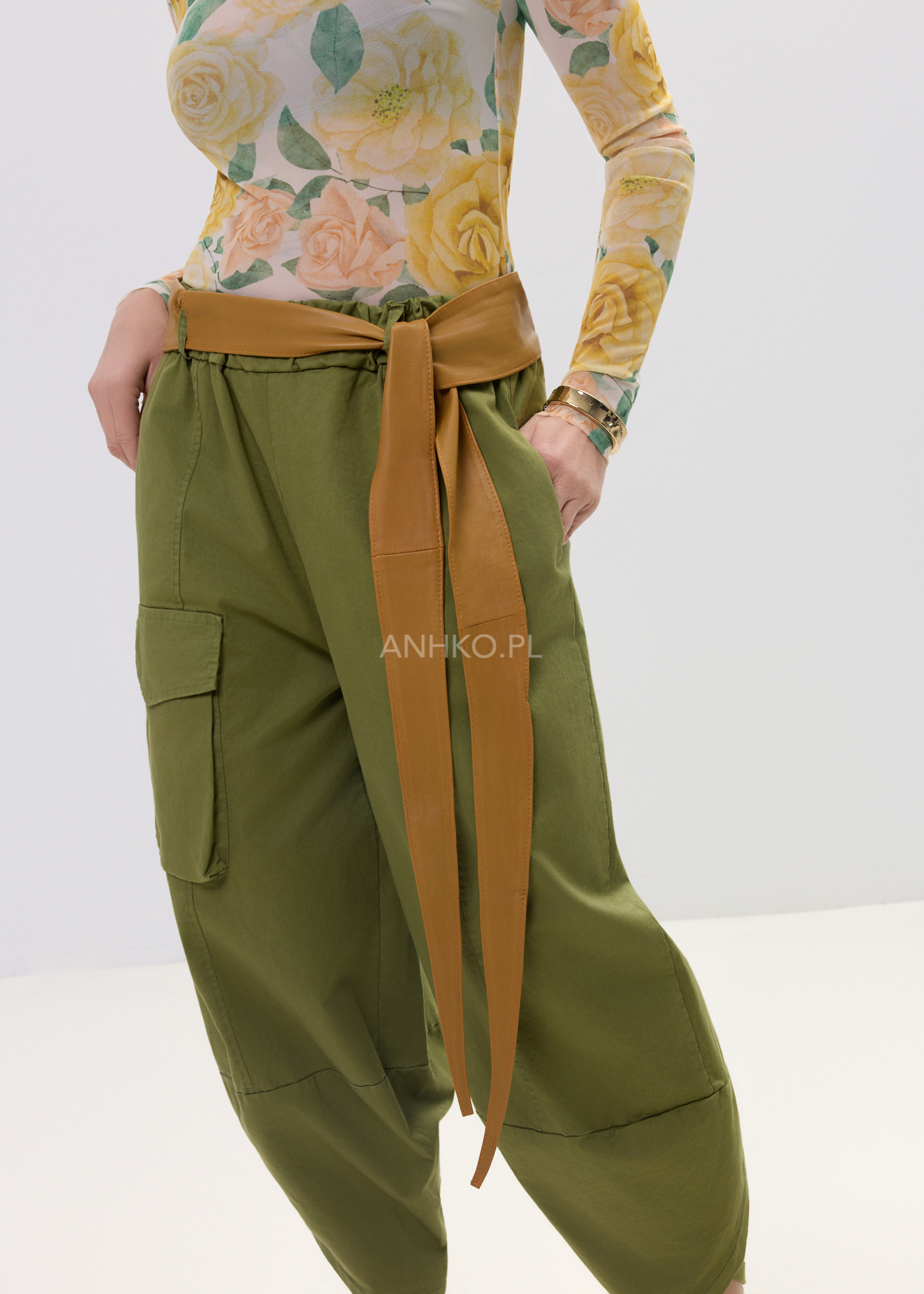 Spodnie Cargo Driftona Oliwkowe - Luźne spodnie cargo w modnym oliwkowym kolorze. Komfortowy krój, elastyczna guma w pasie i charakterystyczna kieszeń na nogawce nadają im miejskiego charakteru. Idealne do codziennych stylizacji – od sneakersów po cięższe buty.