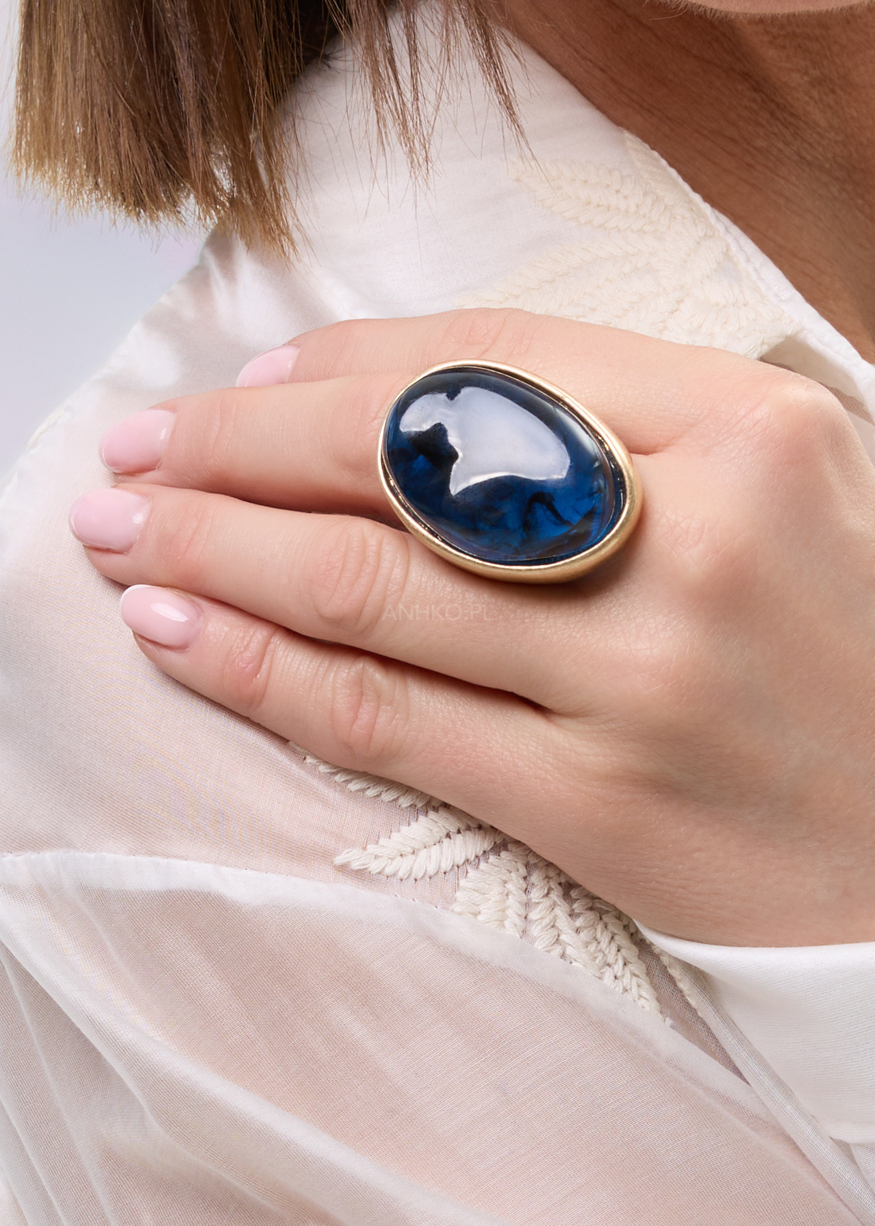 Nowoczesny pierścionek o wyrafinowanym, minimalistycznym designie. Centralnym elementem jest chabrowy kamień z subtelnym wzorem, który nadaje biżuterii głębi i unikalnego charakteru. Gładka, złota oprawa tworzy elegancką ramę dla kamienia i sprawia, że całość prezentuje się niezwykle stylowo. Prosta forma w połączeniu z efektowną strukturą kamienia czyni ten model idealnym dodatkiem zarówno do eleganckich stylizacji, jak i codziennych, nowoczesnych looków. Regulowany obwód pozwala na komfortowe dopasowanie do palca. Pierścionek doskonale sprawdzi się na wieczorne wyjścia, spotkania, eventy oraz jako subtelny, ale wyrazisty akcent codziennego stroju.