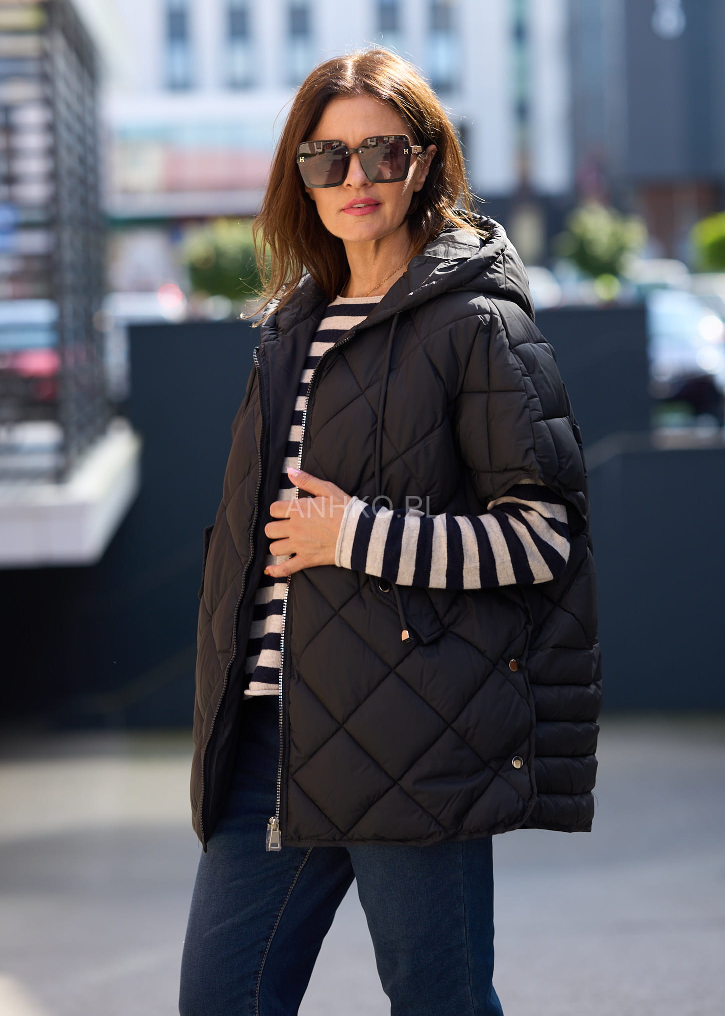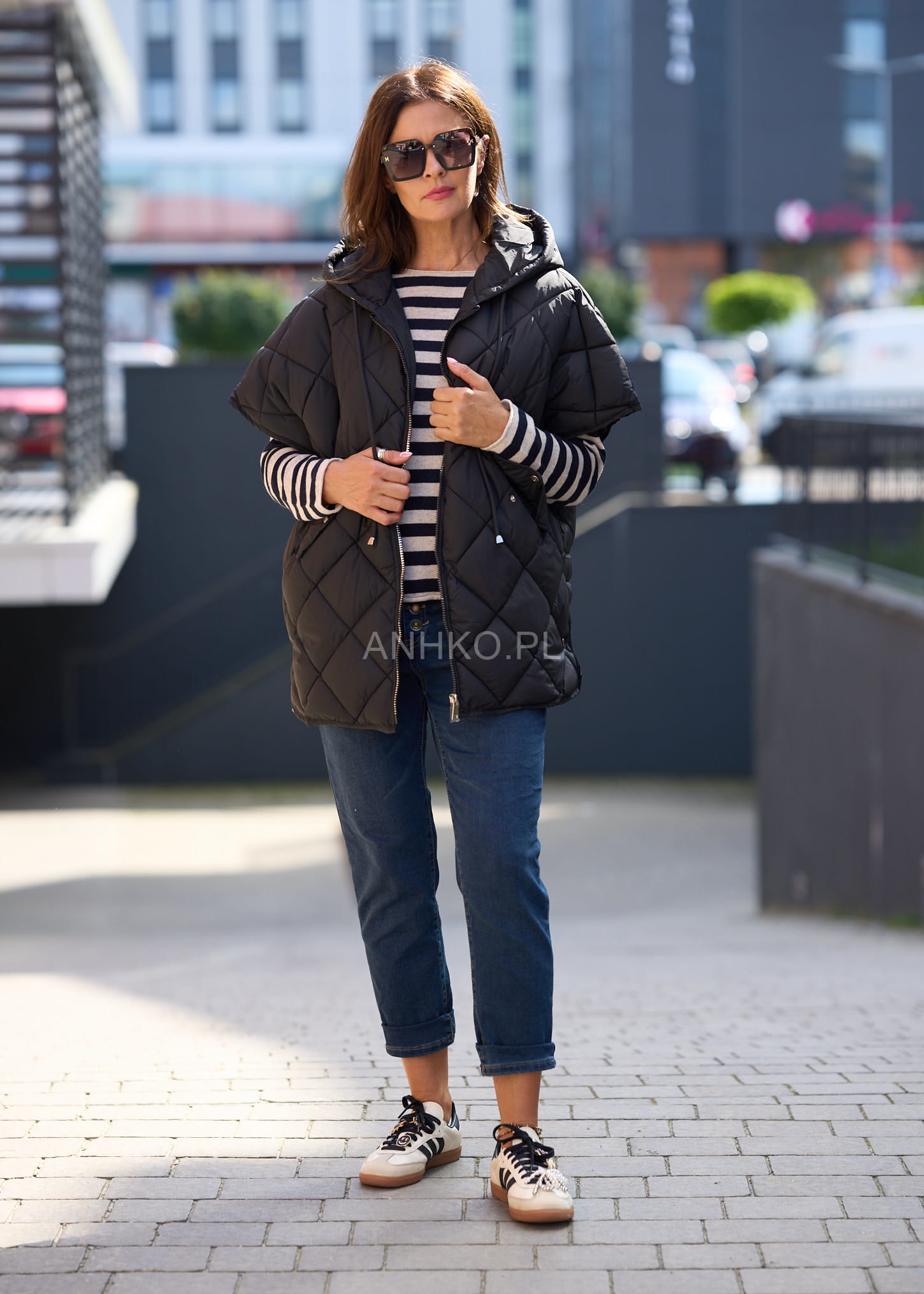 Ta pikowana kamizelka to połączenie komfortu, funkcjonalności i nowoczesnego stylu. Jej oversize’owy krój sprawia, że pasuje do wielu sylwetek, a kaptur zapewnia dodatkową ochronę przed wiatrem i chłodem. Wygodne kieszenie boczne i praktyczne zapięcie na zamek dodają jej funkcjonalności. Kamizelka świetnie komponuje się z jeansami, dresami, a także bardziej eleganckimi spodniami, tworząc casualowe stylizacje idealne na spacery, zakupy czy weekendowe wyjazdy. Klasyczny czarny kolor sprawia, że łatwo dopasujesz ją do różnych barw garderoby. To uniwersalna propozycja dla kobiet ceniących wygodę i modny wygląd.