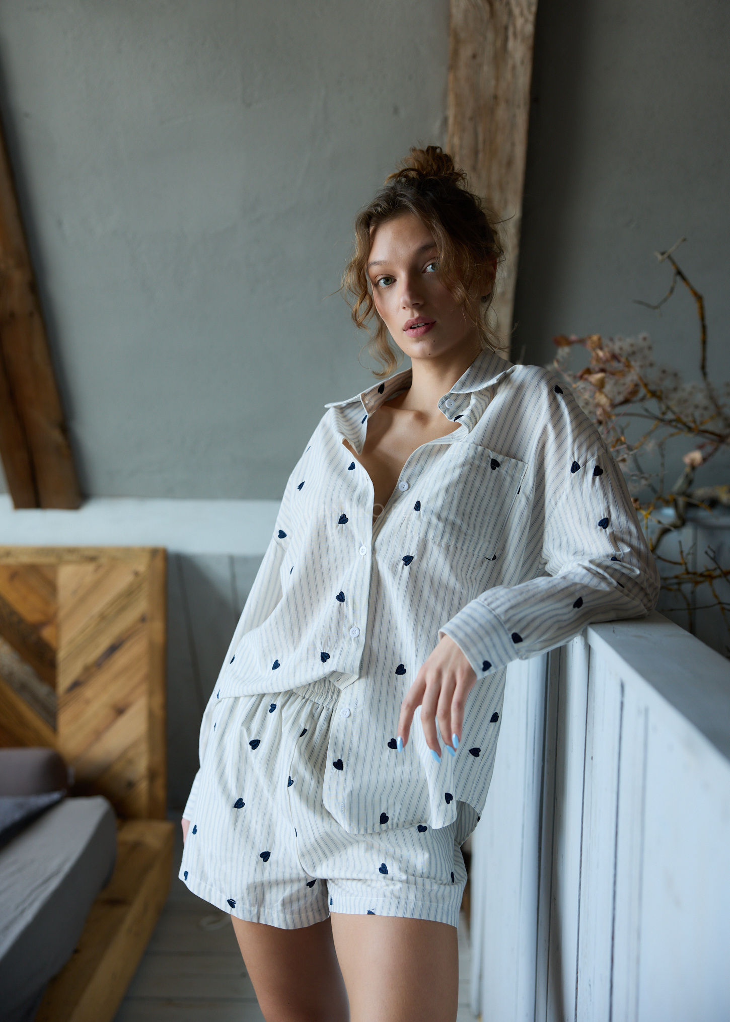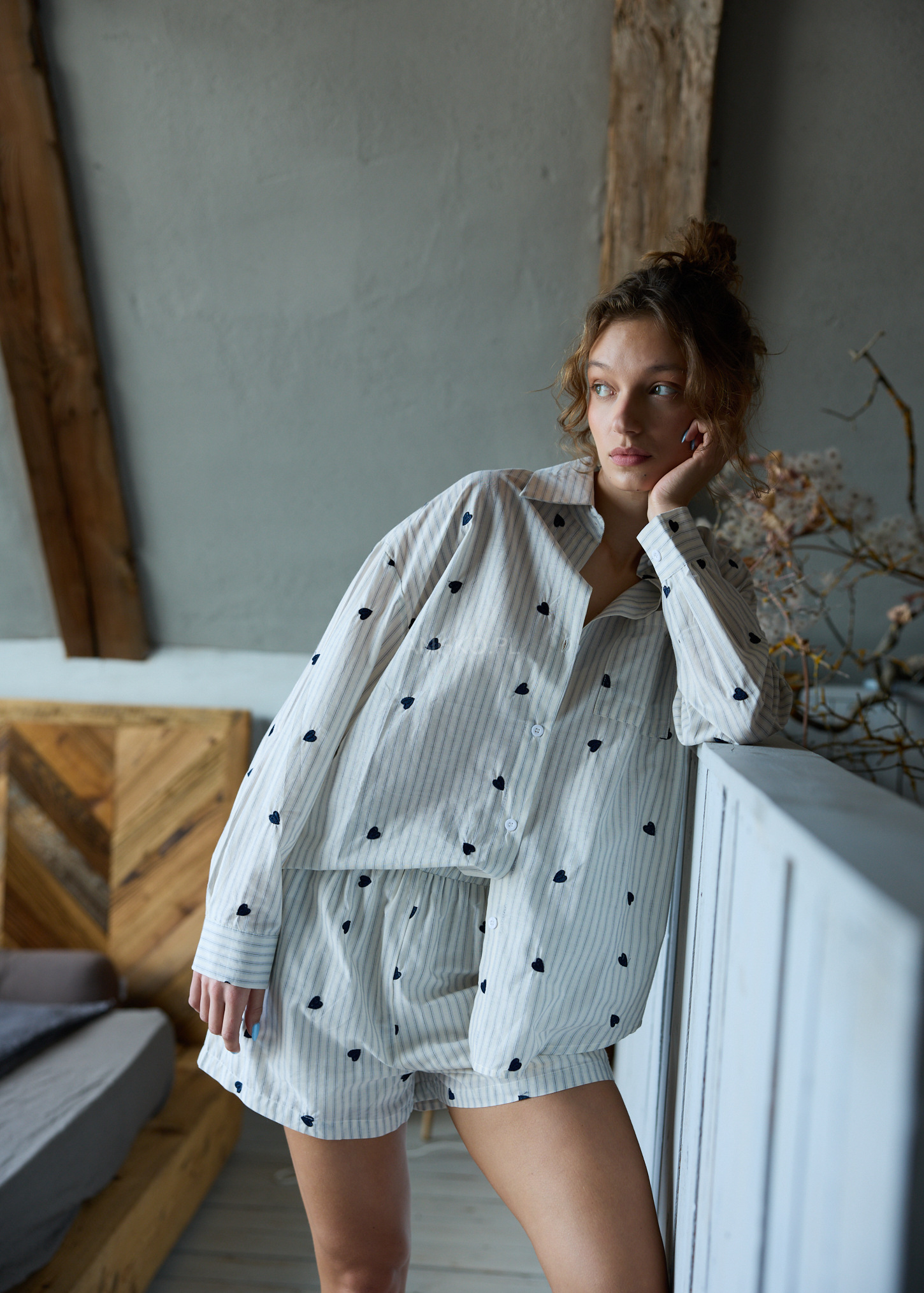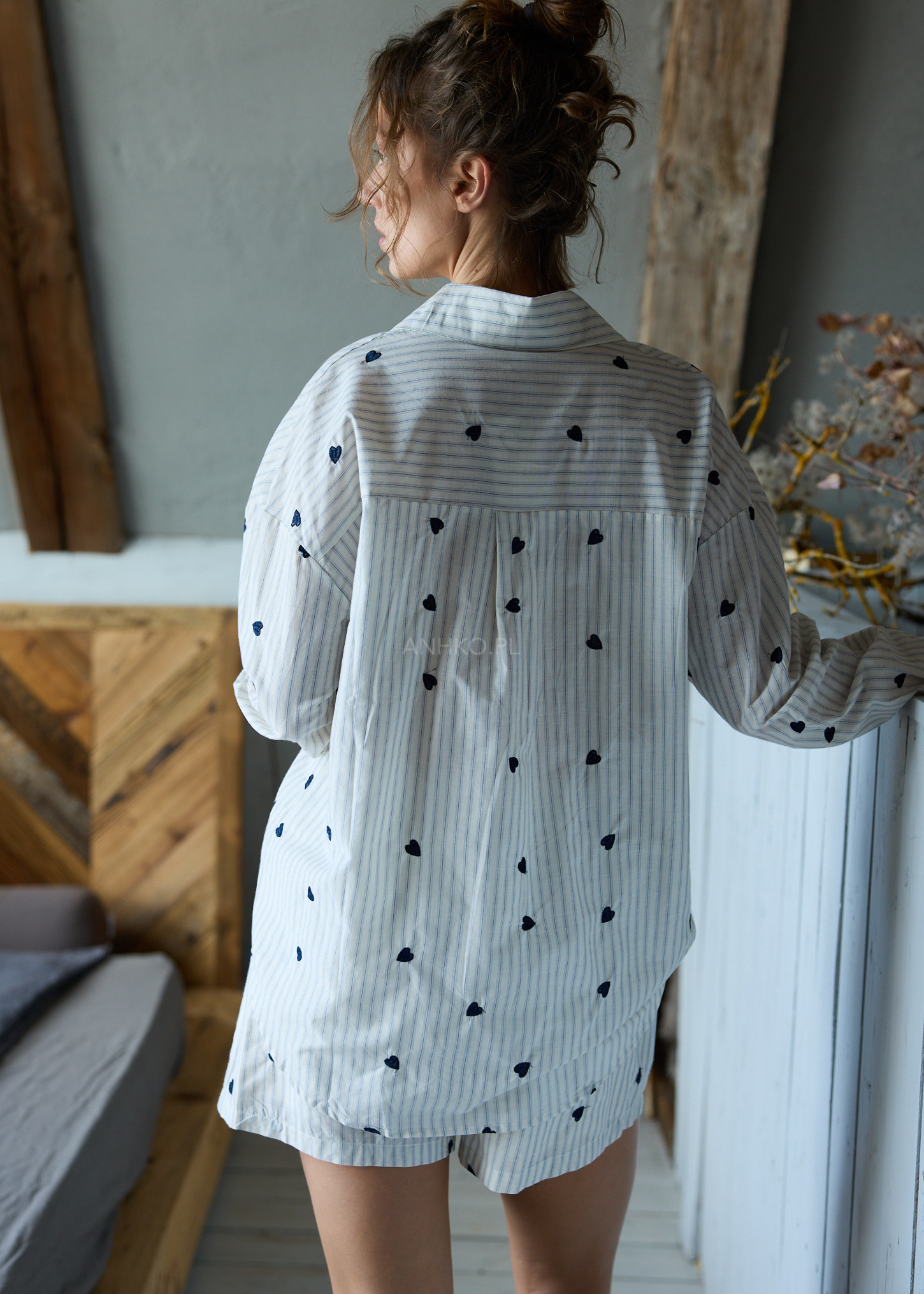 Delikatny wzór pasków przełamany haftowanymi serduszkami przyciąga uwagę i nadaje całości wyjątkowego charakteru. Lekki materiał, oversize’owy krój oraz funkcjonalny zestaw 2w1 sprawiają, że komplet sprawdzi się nie tylko jako piżama, ale również jako stylowy homewear czy baza do luźnych, codziennych stylizacji.