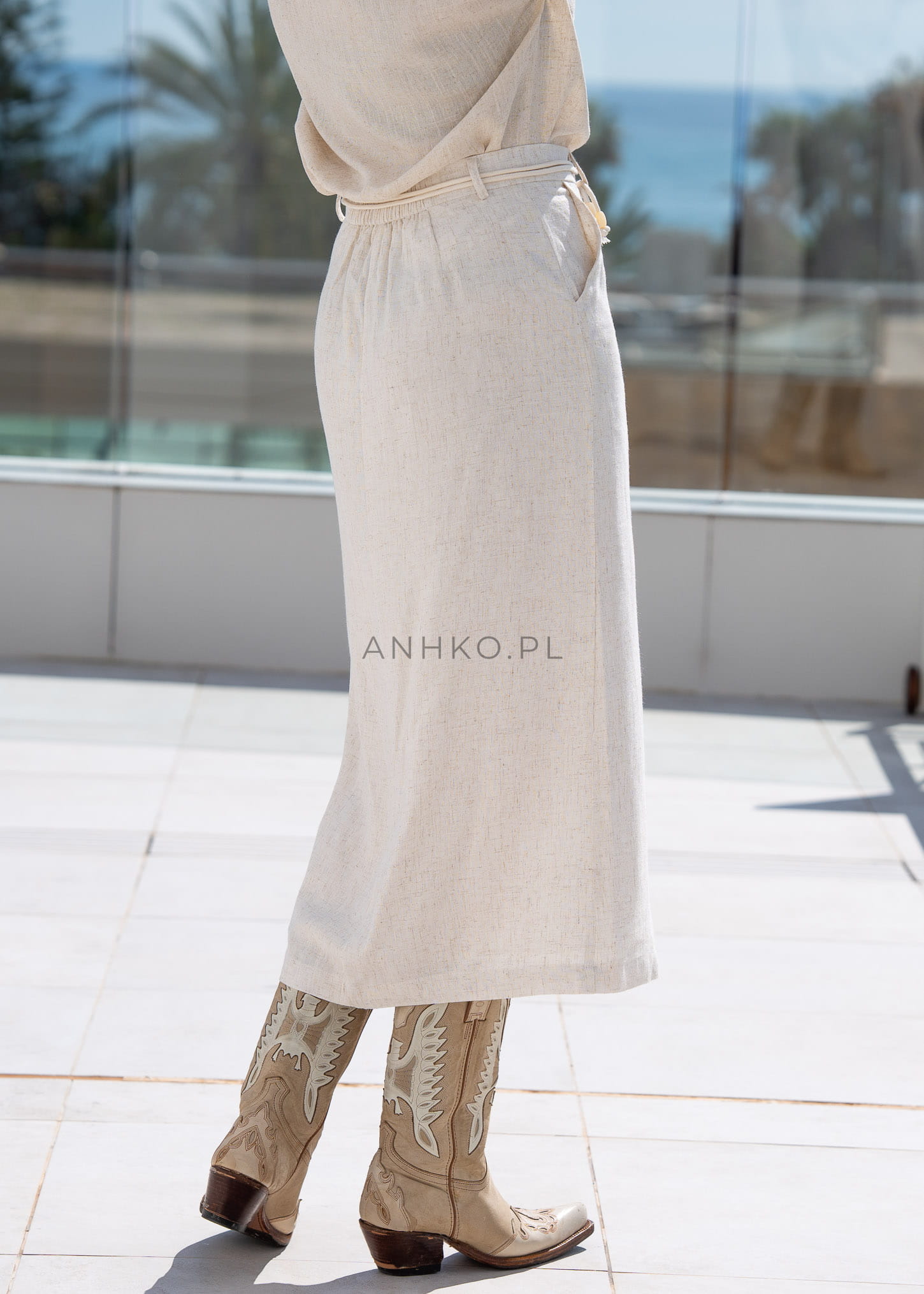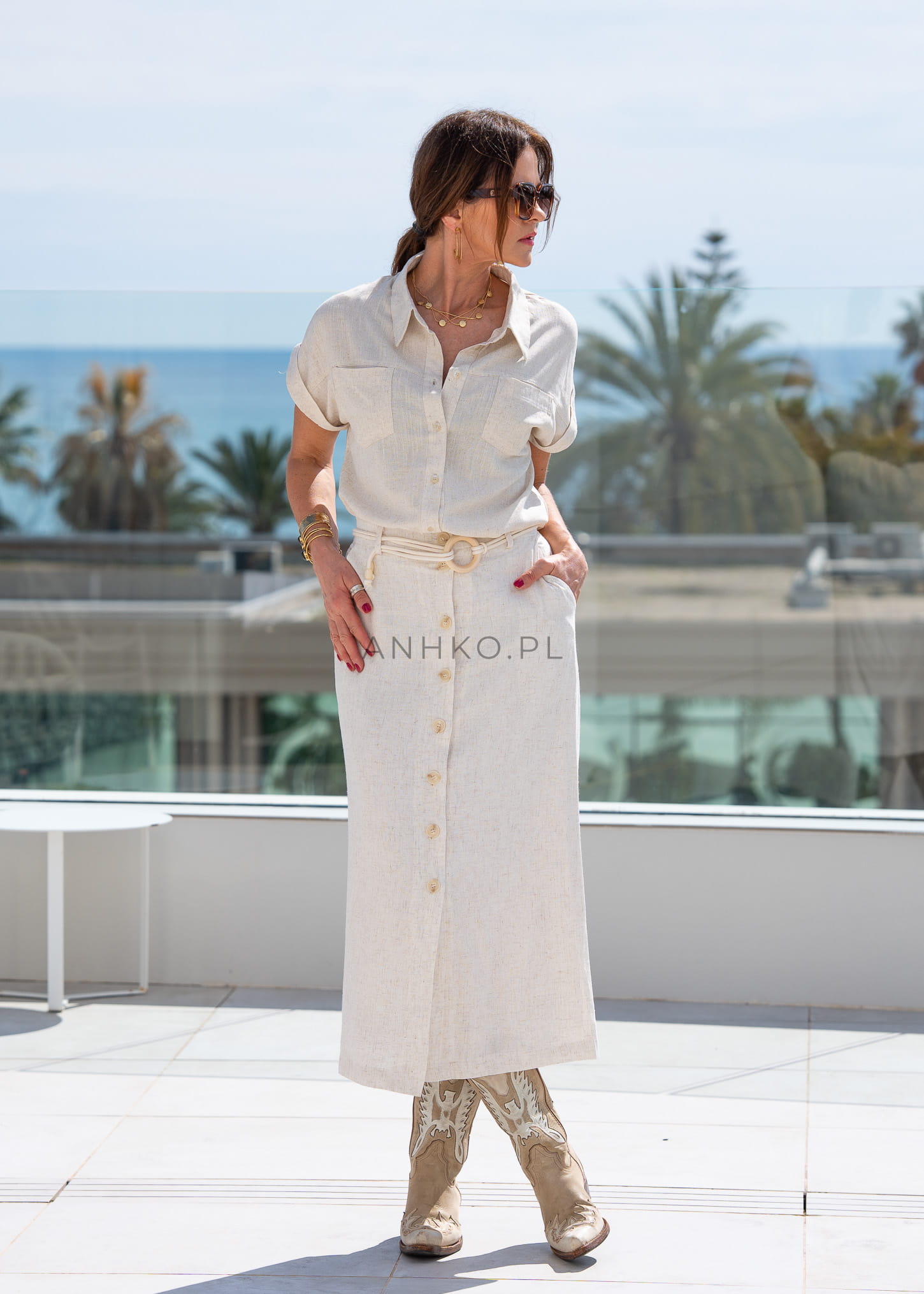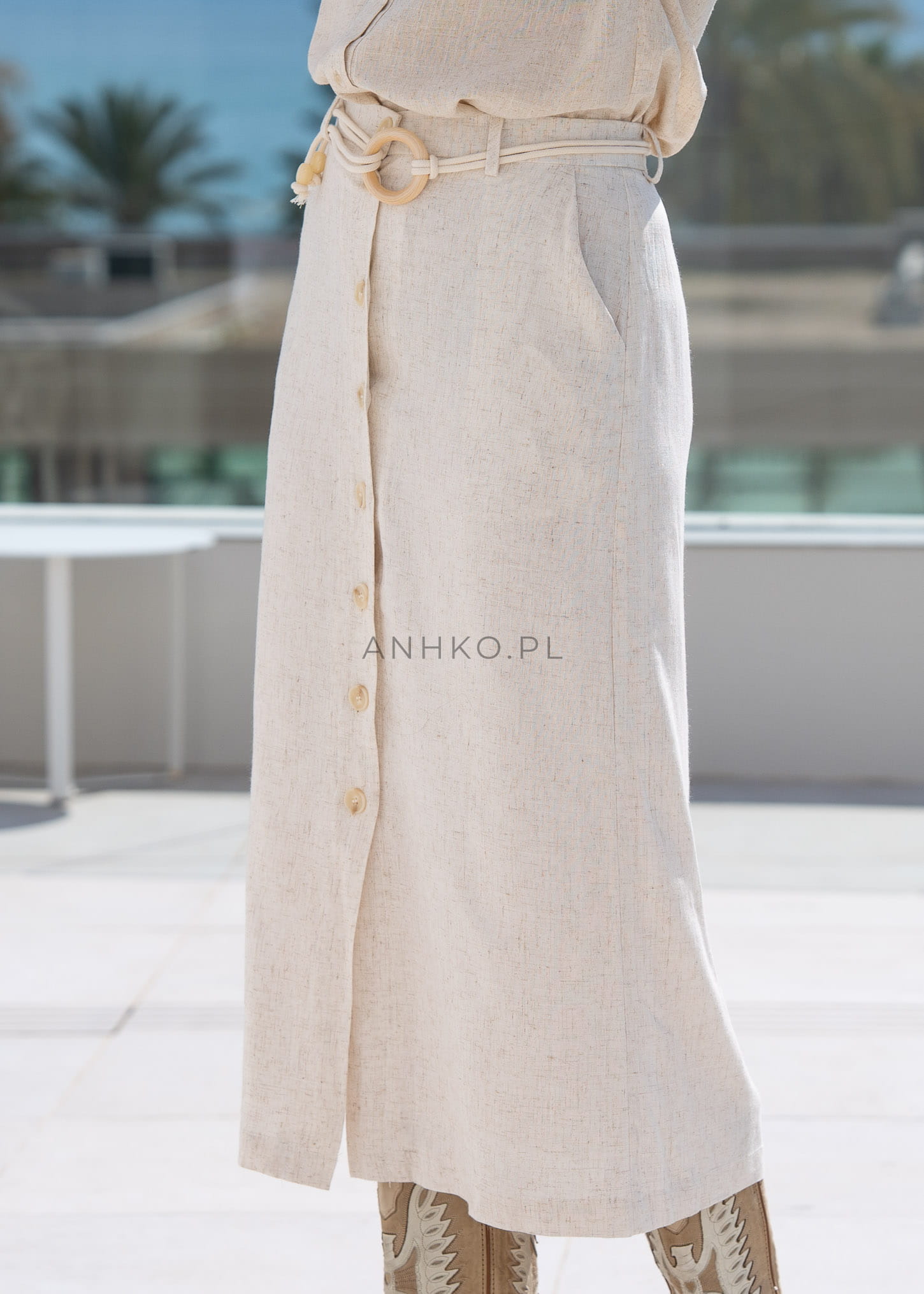 To spódnica w kolorze beżowym, wykonana z przyjemnej w dotyku mieszanki bawełny i poliamidu. Klasyczne guziki z przodu nadają jej rustykalnego uroku, a luźny krój gwarantuje komfort przez cały dzień. Model ten posiada praktyczne kieszenie i delikatną, wewnętrzną podszewkę, co zapewnia wygodę oraz lekkość. Świetnie sprawdzi się na letnie spacery, do biura w casualowym stylu lub na wyjazdy wakacyjne. Połącz ją z oversize'ową koszulą, lnianym topem lub kardiganem – zawsze będzie wyglądać stylowo i świeżo. Wersja z elastycznym pasem oraz dekoracyjnym sznurkiem nadaje stylizacji swobodnego, boho charakteru.