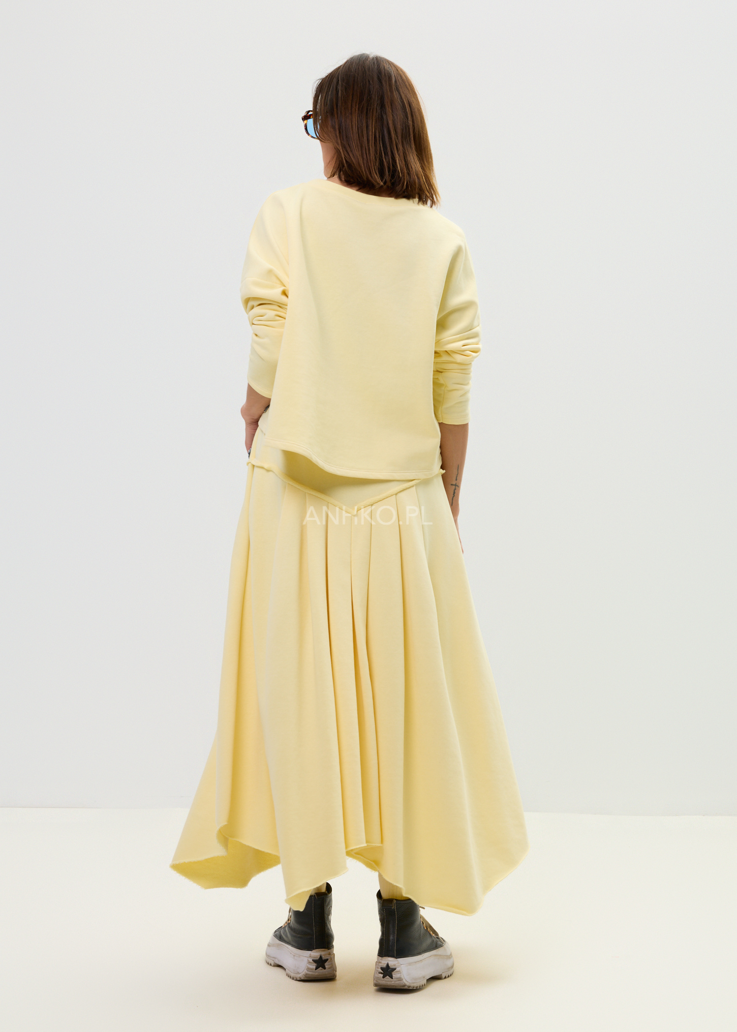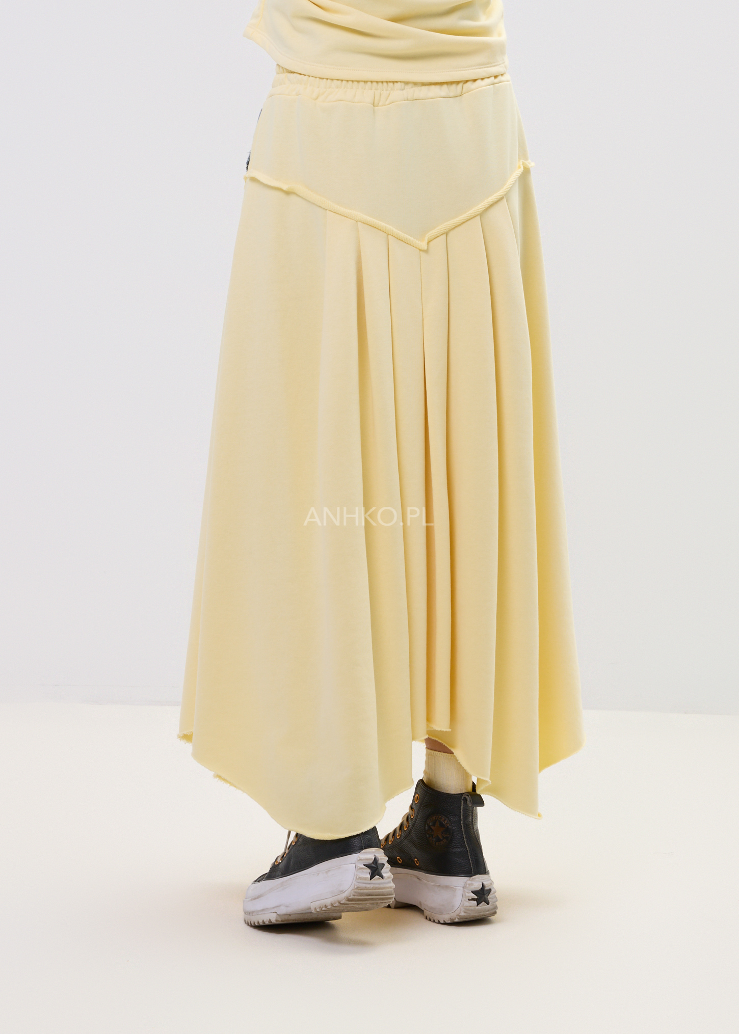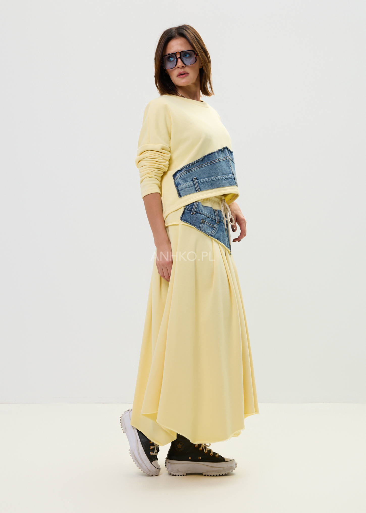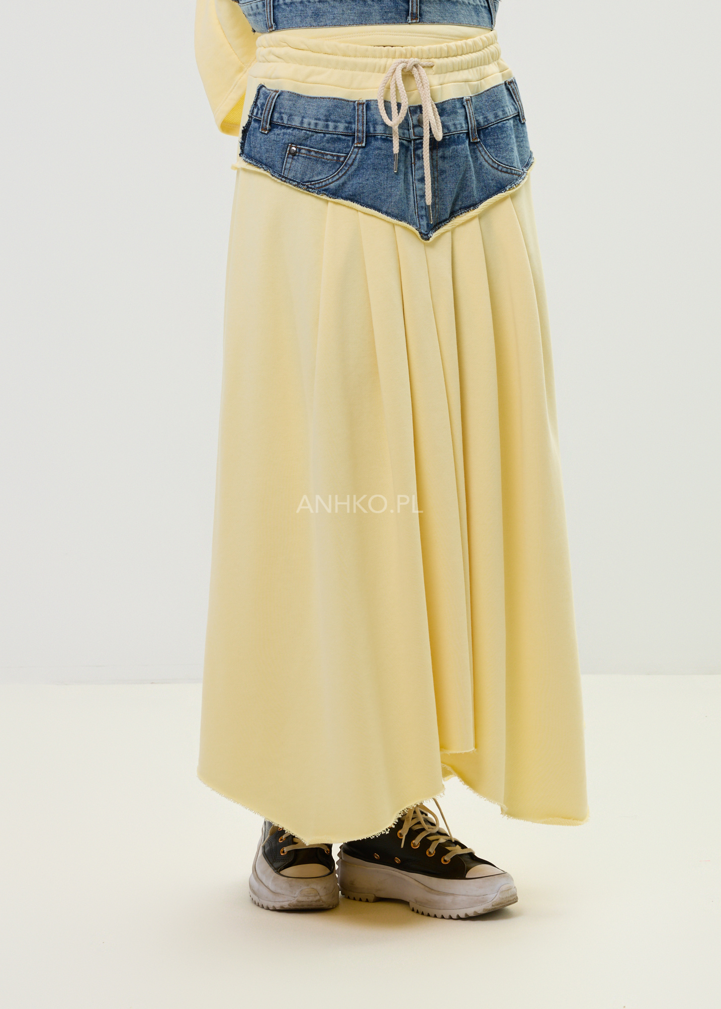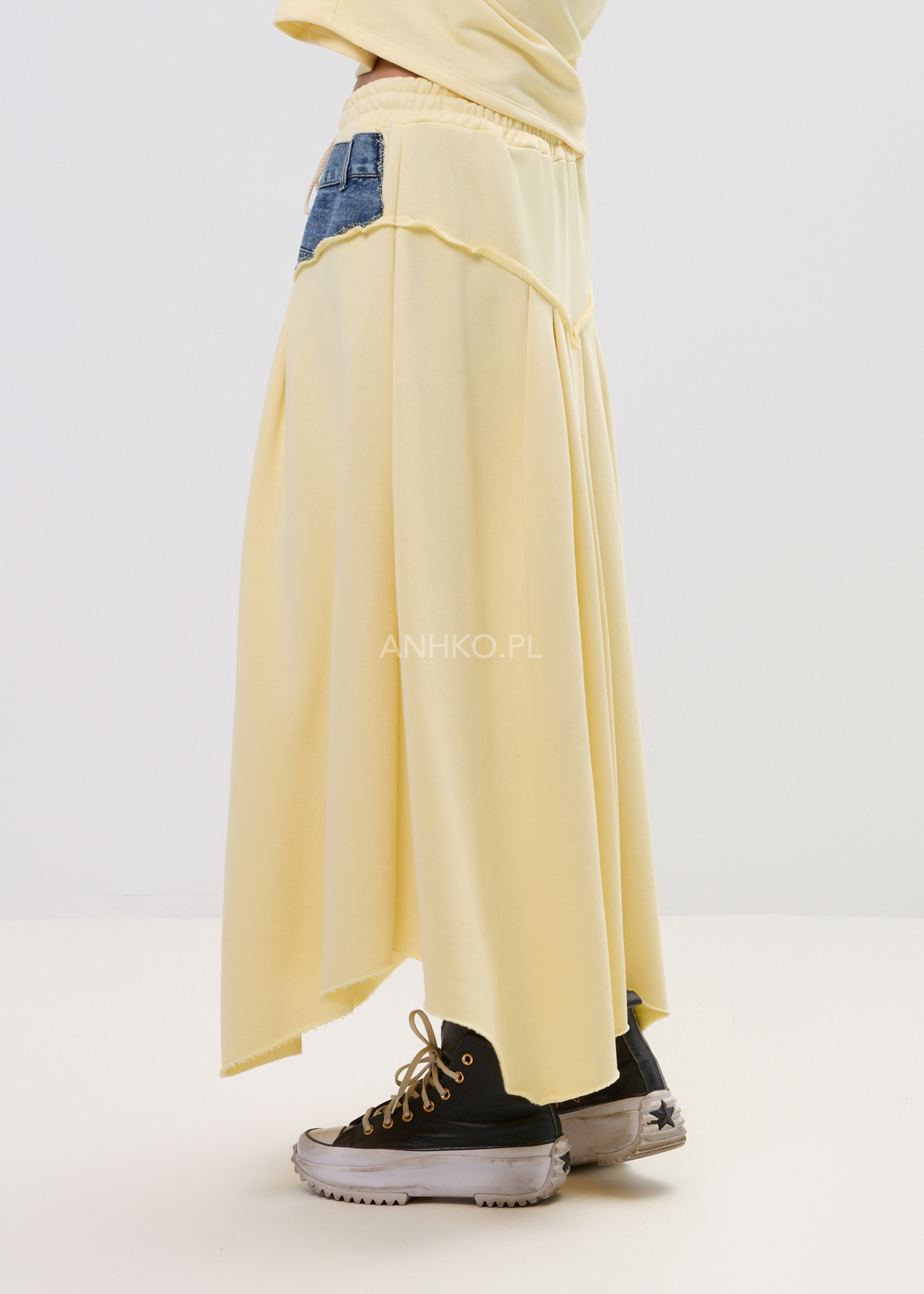 Ta spódnica midi wyróżnia się niebanalnym połączeniem wygodnej dzianiny i charakterystycznego detalu inspirowanego klasycznym denimem. Miękki materiał w odcieniu żółtym swobodnie układa się na sylwetce, a luźny fason zapewnia komfort noszenia przez cały dzień. Stylowa jeansowa wstawka w pasie z wyraźnymi przeszyciami nadaje całości nowoczesnego, modowego charakteru.