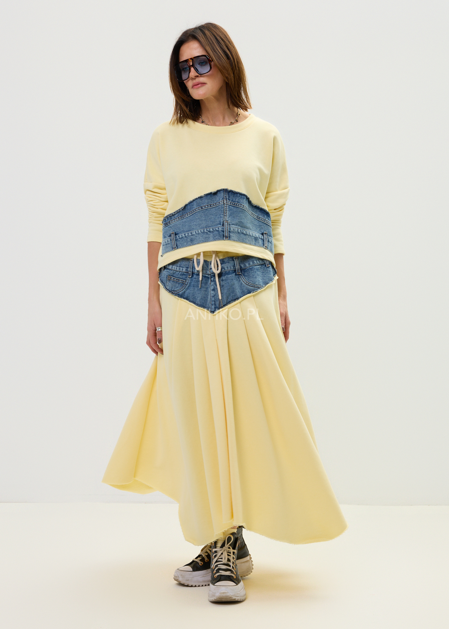 Bluza Denim Wave Żółta - Casualowa bluza oversize z charakterystyczną wstawką z denimu. Nowoczesny design i wygodny krój sprawiają, że to idealny element miejskich stylizacji – od codziennych zestawów z jeansami po modne looki z szerokimi spodniami.