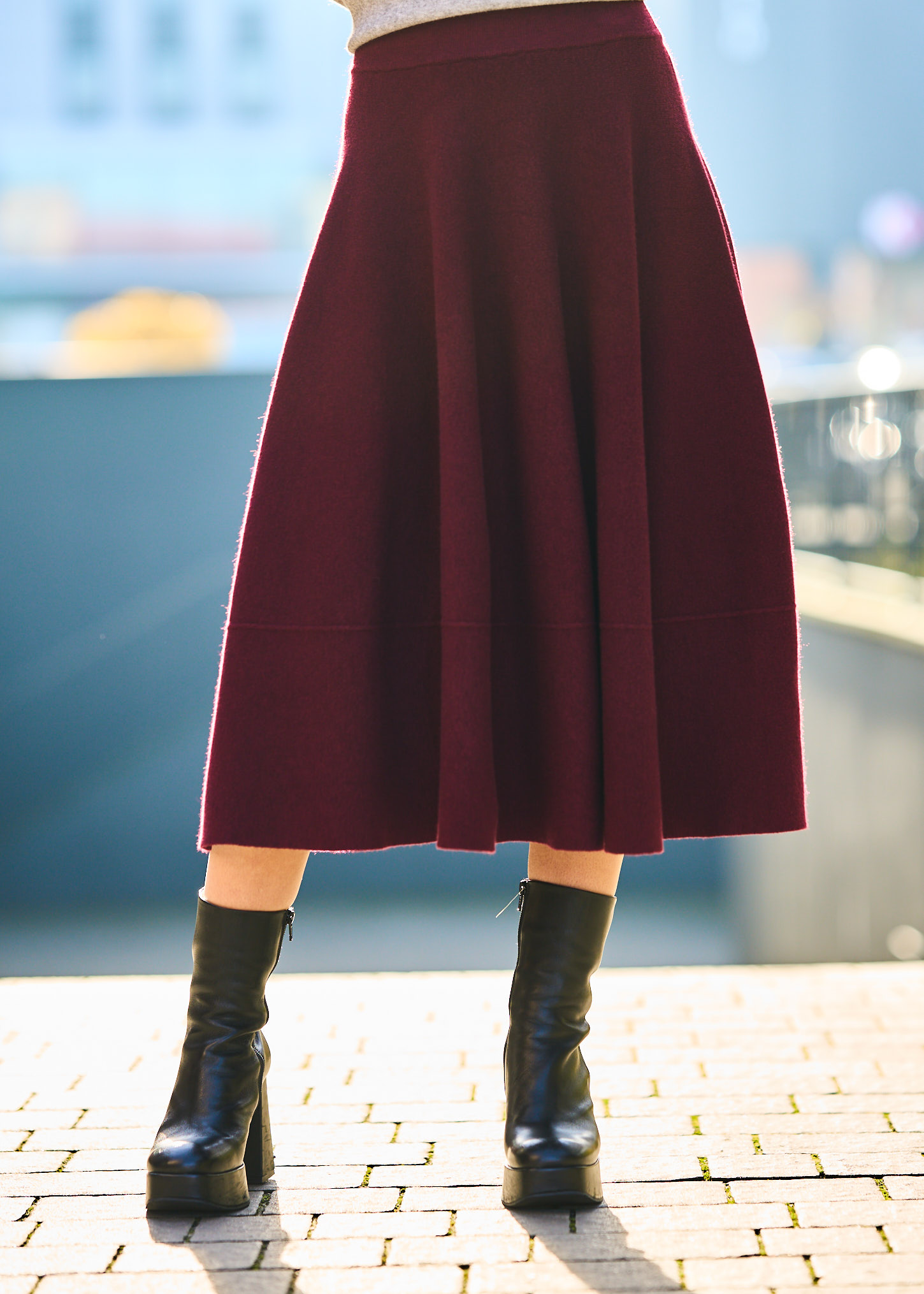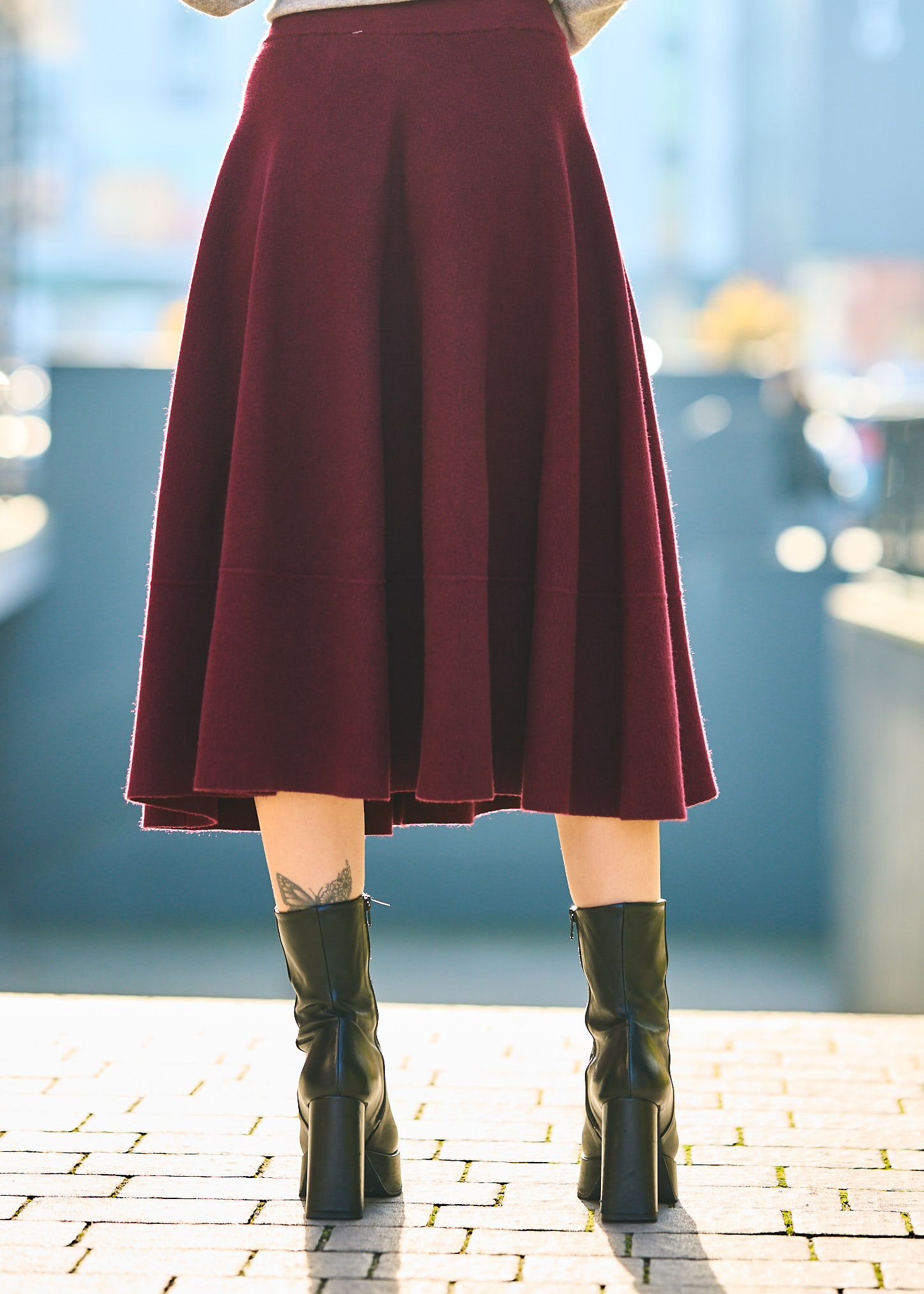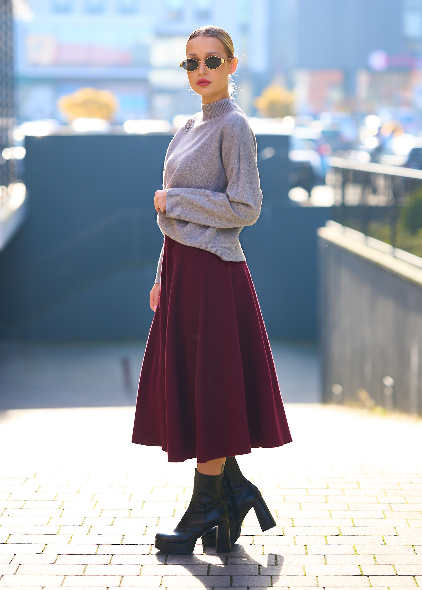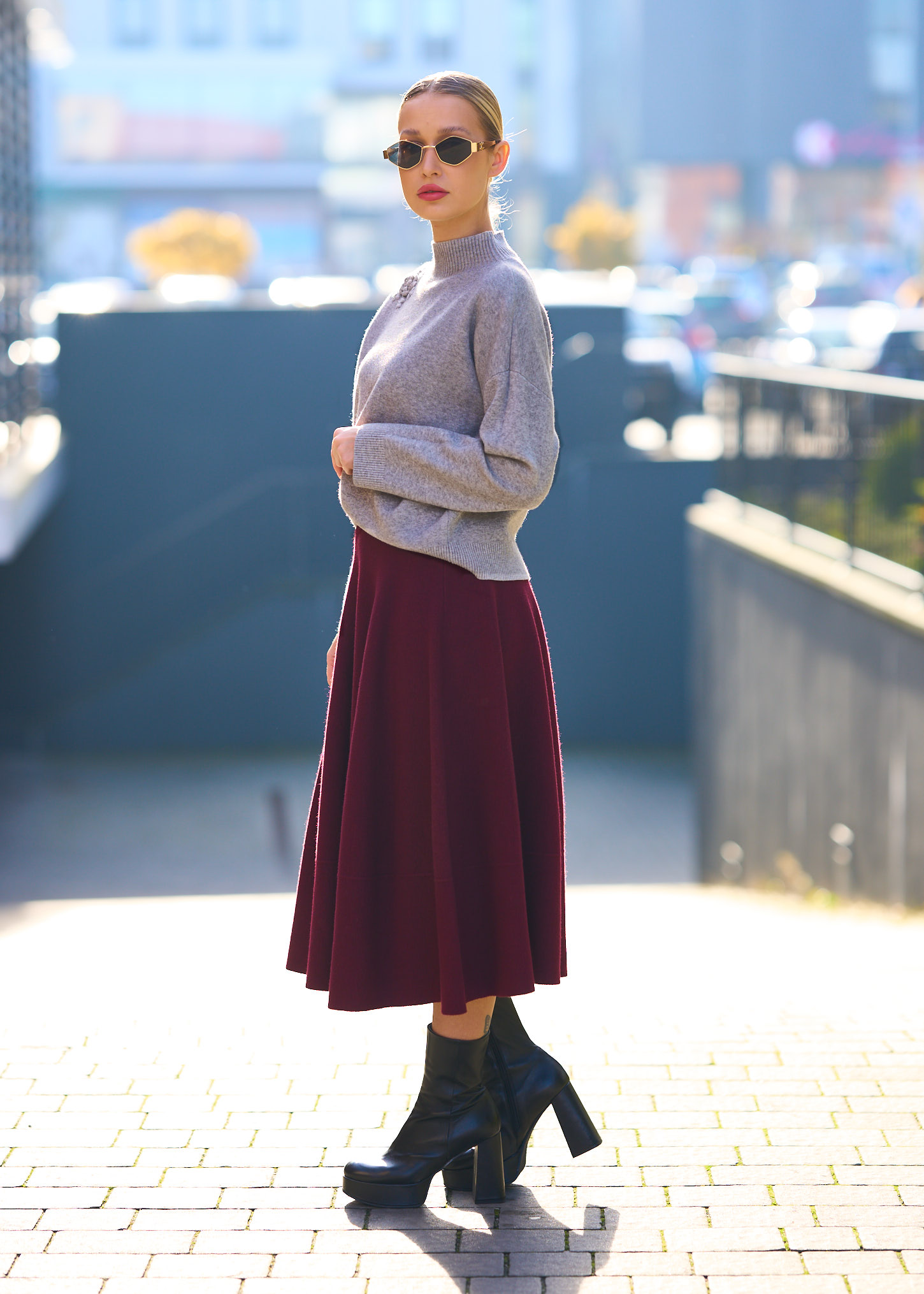 Ta rozkloszowana spódnica to idealna propozycja dla osób ceniących wygodę, elegancję i ponadczasowe formy. Miękka, lekko mięsista dzianina pięknie pracuje przy ruchu i zapewnia pełen komfort przez cały dzień. Model nie posiada kieszeni ani podszewki, dzięki czemu zachowuje lekkość i płynny fason. Doskonale sprawdzi się zarówno w stylizacjach codziennych, jak i bardziej eleganckich – połącz ją z dopasowanym golfem, swetrem oversize lub klasyczną koszulą. Idealna na chłodniejsze dni, do pracy, na spotkania, a także na weekendowe wyjścia. Spódnica świetnie wygląda zarówno z botkami, kozakami, jak i bardziej swobodnymi butami.