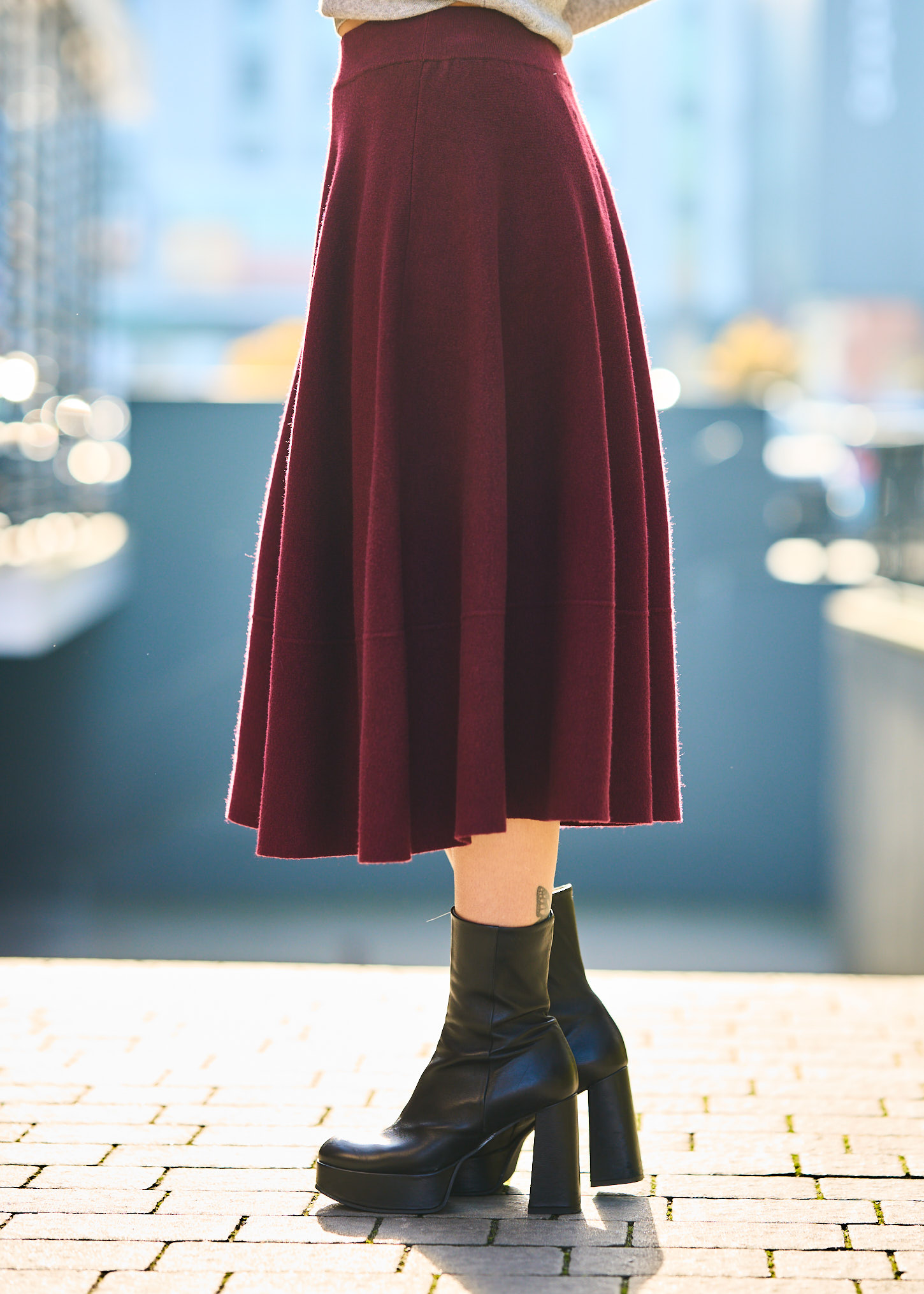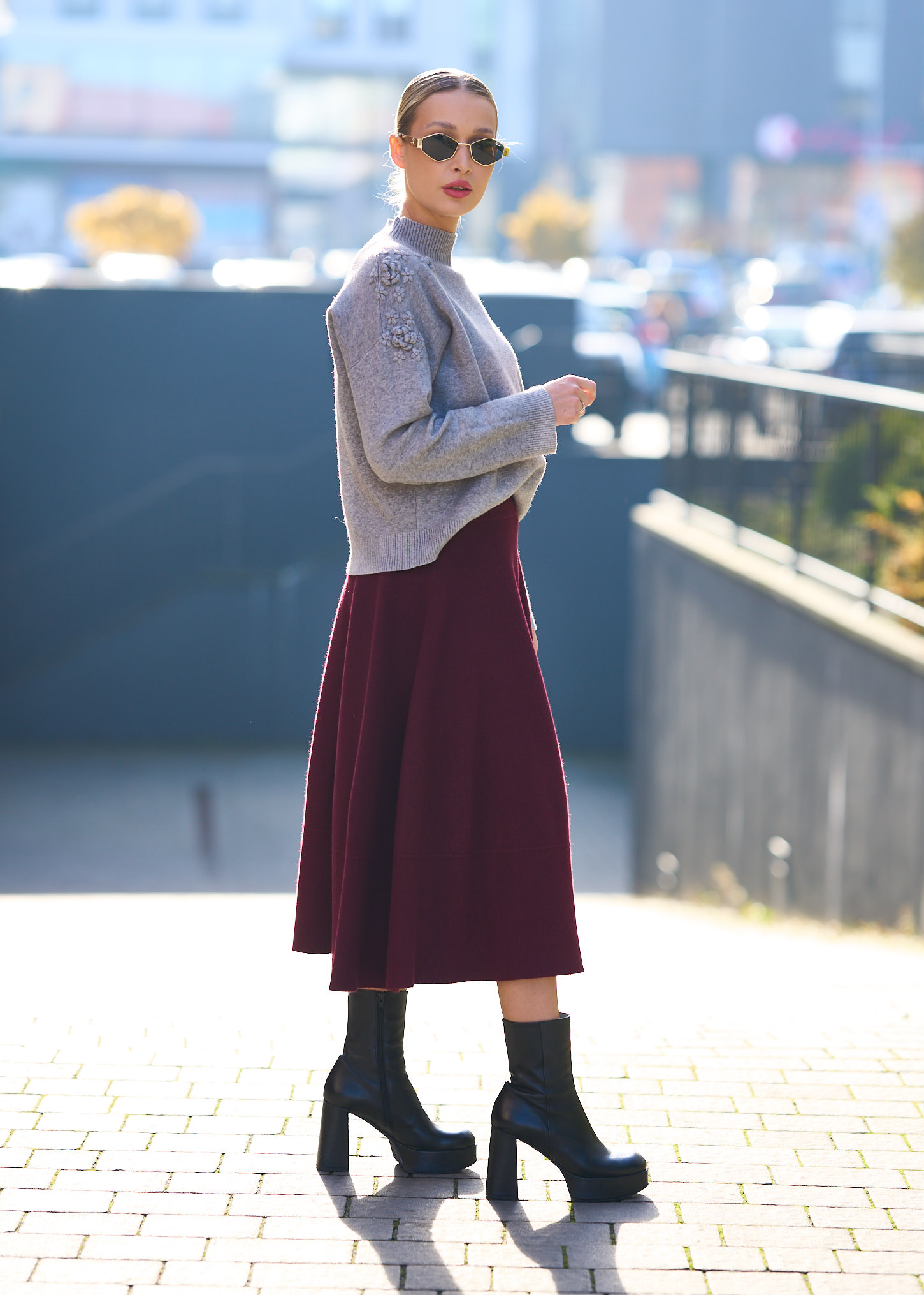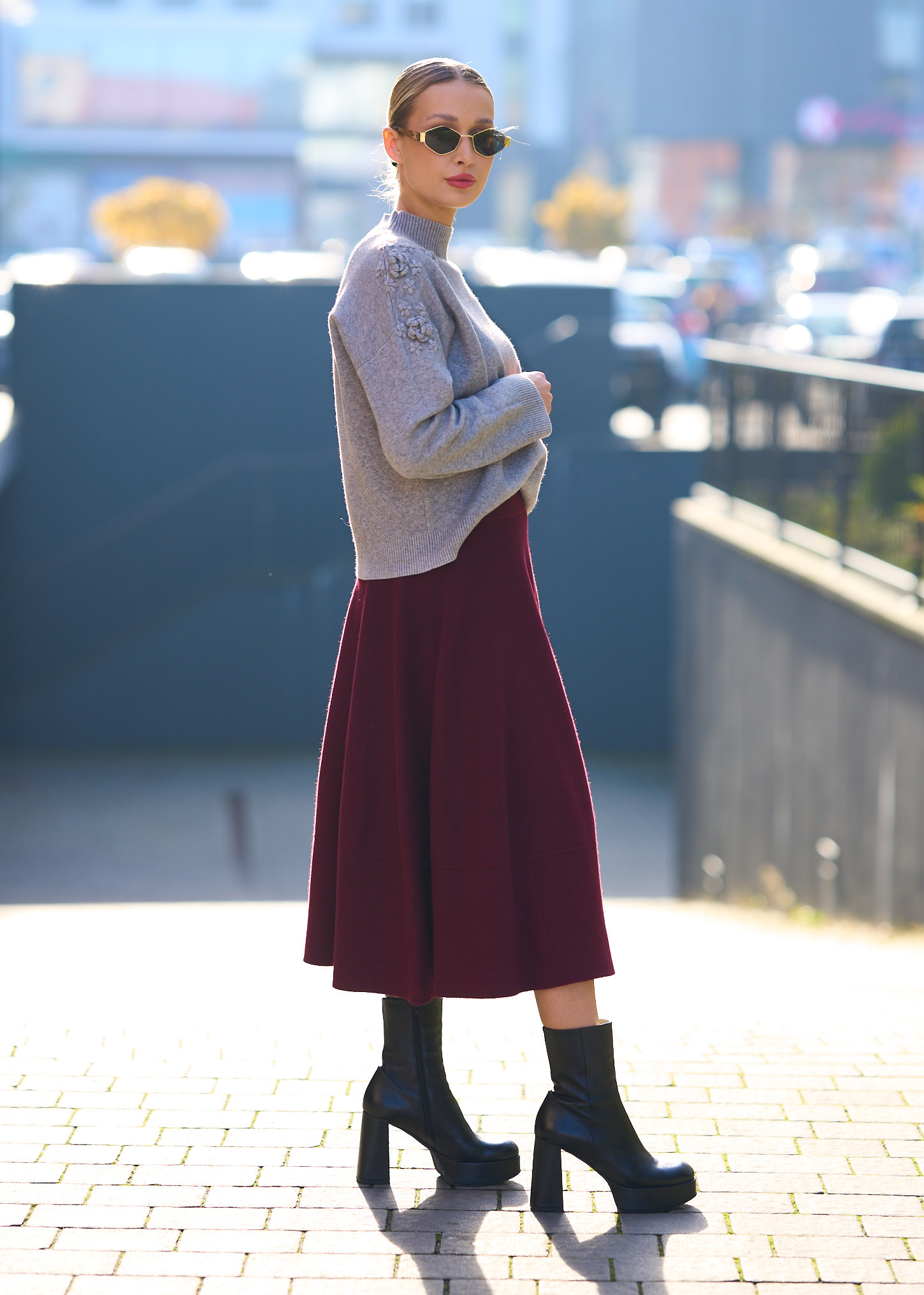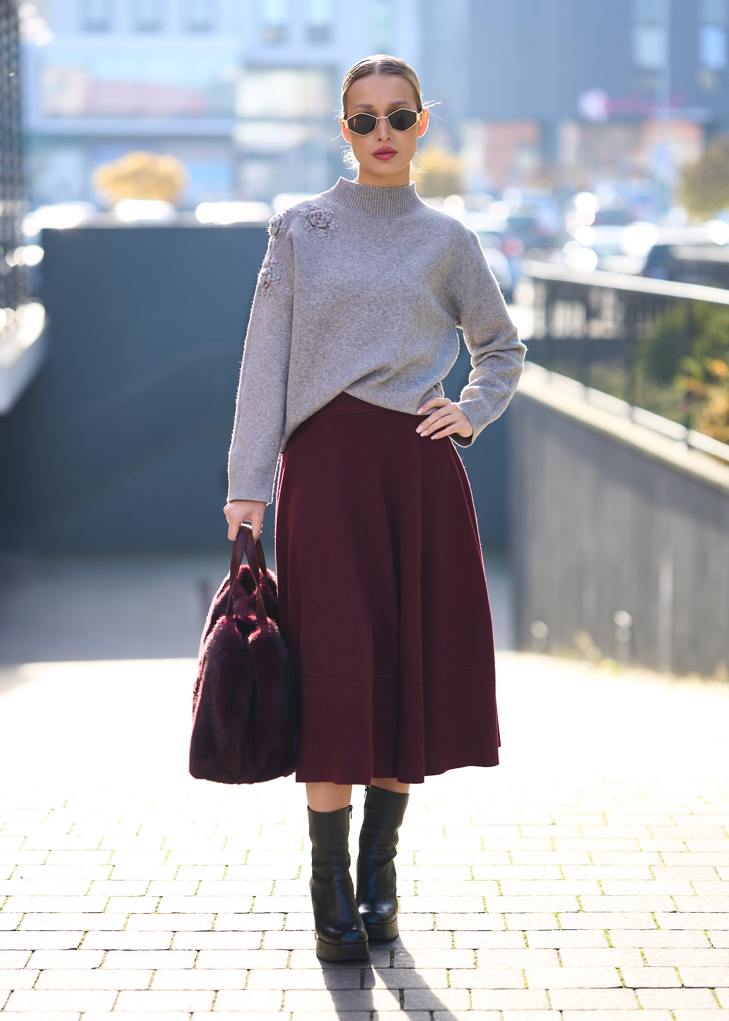 Ta rozkloszowana spódnica to idealna propozycja dla osób ceniących wygodę, elegancję i ponadczasowe formy. Miękka, lekko mięsista dzianina pięknie pracuje przy ruchu i zapewnia pełen komfort przez cały dzień. Model nie posiada kieszeni ani podszewki, dzięki czemu zachowuje lekkość i płynny fason. Doskonale sprawdzi się zarówno w stylizacjach codziennych, jak i bardziej eleganckich – połącz ją z dopasowanym golfem, swetrem oversize lub klasyczną koszulą. Idealna na chłodniejsze dni, do pracy, na spotkania, a także na weekendowe wyjścia. Spódnica świetnie wygląda zarówno z botkami, kozakami, jak i bardziej swobodnymi butami.
