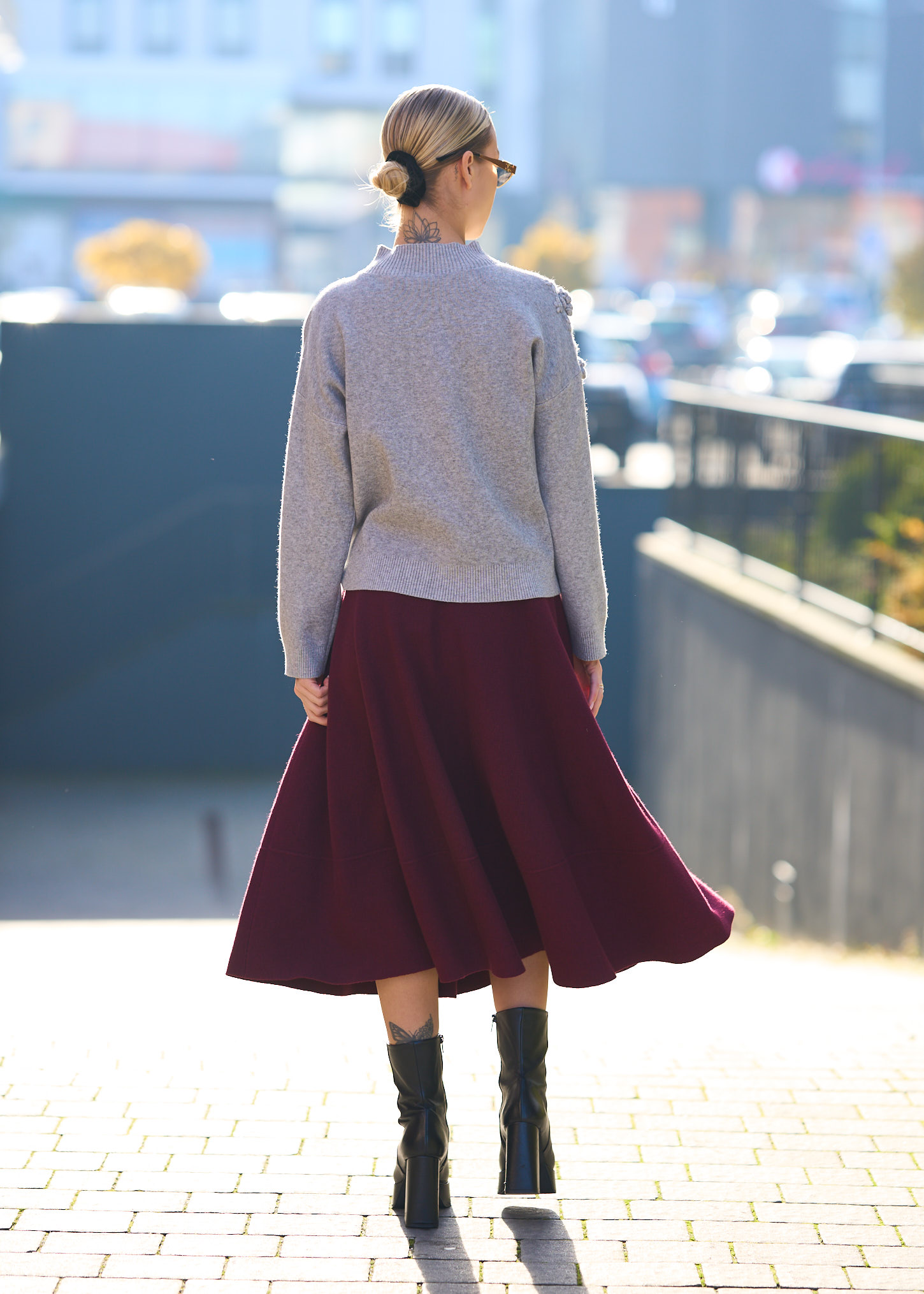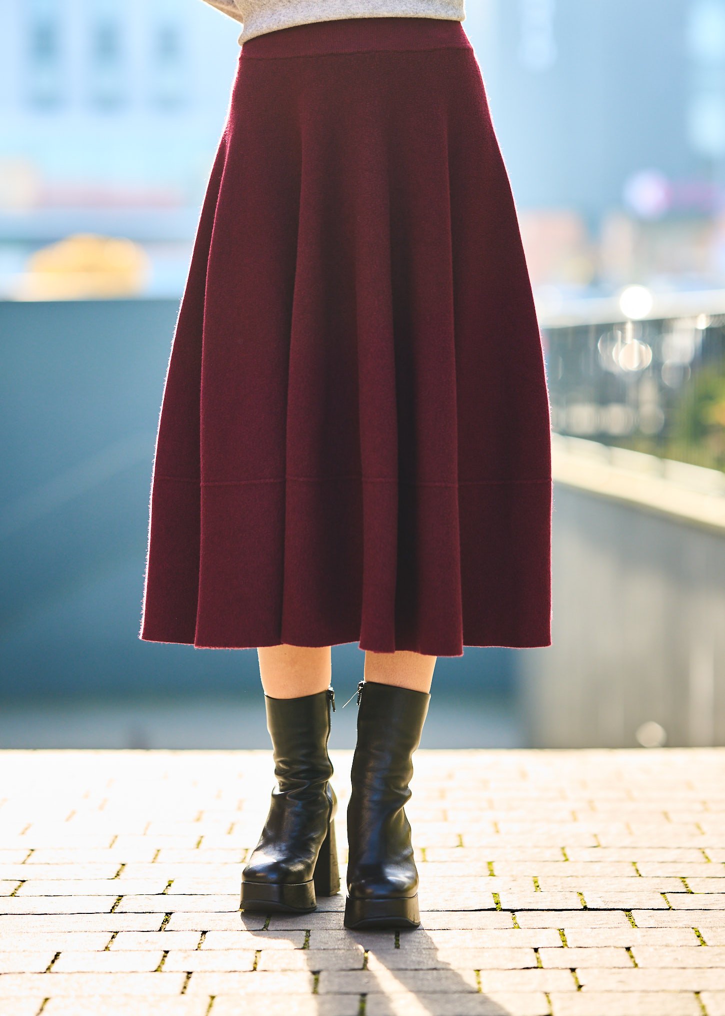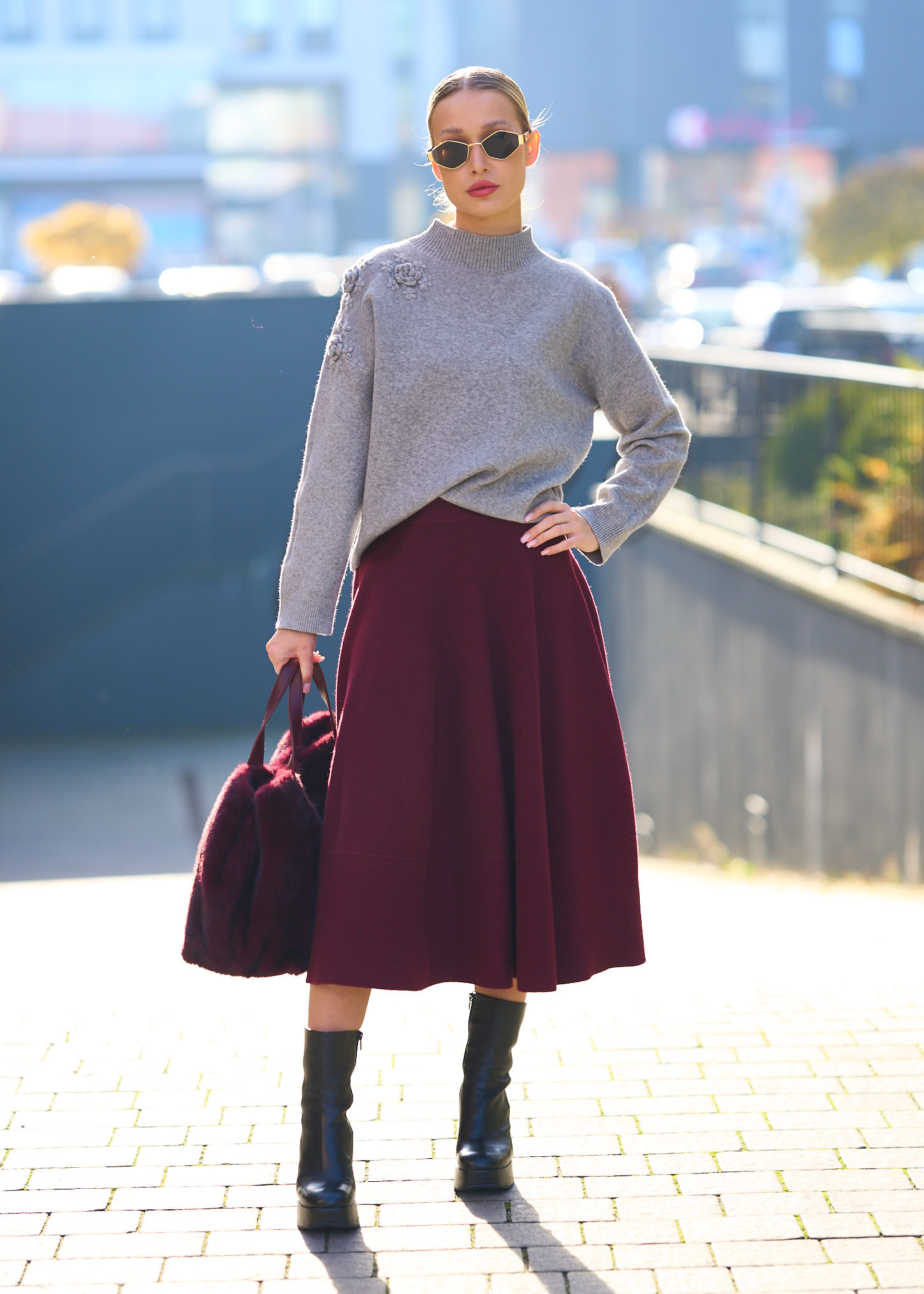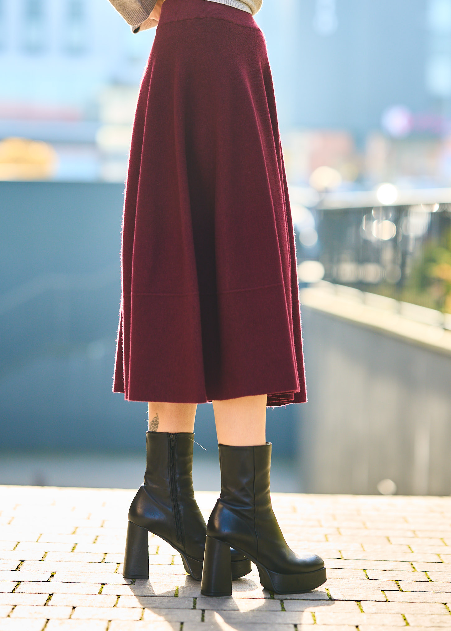 Ta rozkloszowana spódnica to idealna propozycja dla osób ceniących wygodę, elegancję i ponadczasowe formy. Miękka, lekko mięsista dzianina pięknie pracuje przy ruchu i zapewnia pełen komfort przez cały dzień. Model nie posiada kieszeni ani podszewki, dzięki czemu zachowuje lekkość i płynny fason. Doskonale sprawdzi się zarówno w stylizacjach codziennych, jak i bardziej eleganckich – połącz ją z dopasowanym golfem, swetrem oversize lub klasyczną koszulą. Idealna na chłodniejsze dni, do pracy, na spotkania, a także na weekendowe wyjścia. Spódnica świetnie wygląda zarówno z botkami, kozakami, jak i bardziej swobodnymi butami.