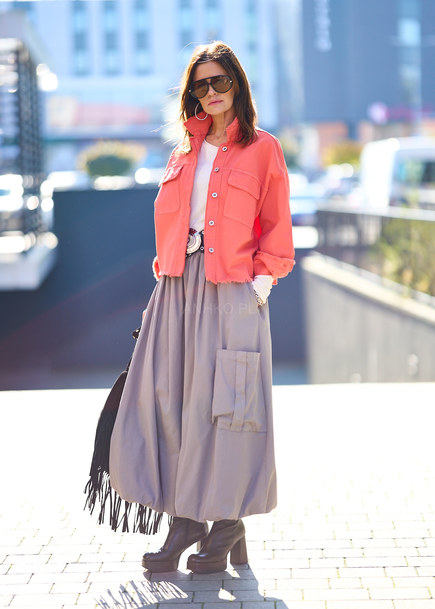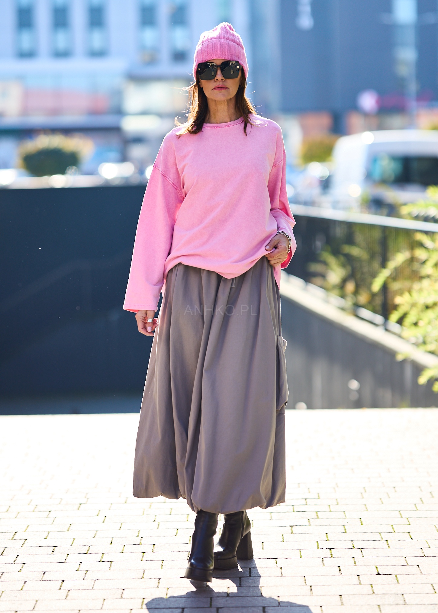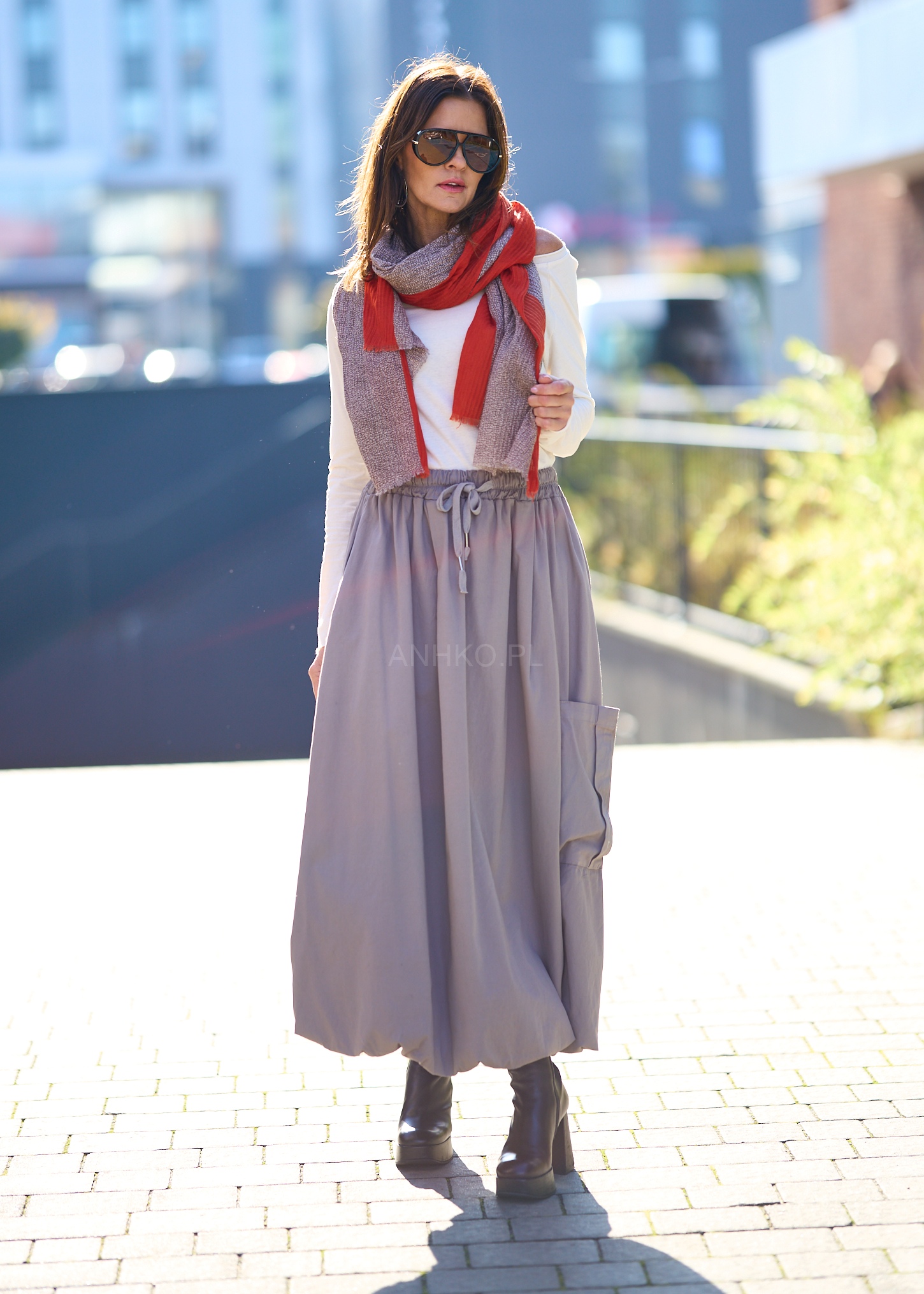 To wyjątkowy model o oryginalnym kroju typu bombka, który łączy komfort z nowoczesnym stylem. Wykonana z miękkiej, naturalnej bawełny z domieszką elastanu, doskonale układa się na sylwetce i nie krępuje ruchów. Elastyczna talia z wiązaniem pozwala na indywidualne dopasowanie, a praktyczna, duża kieszeń z boku dodaje jej charakteru i funkcjonalności. Spódnica ma obniżony, zaokrąglony dół, który nadaje jej niepowtarzalną formę. To idealny wybór do codziennych, artystycznych lub boho stylizacji – świetnie prezentuje się z prostym topem, lnianą koszulą lub sneakersami.