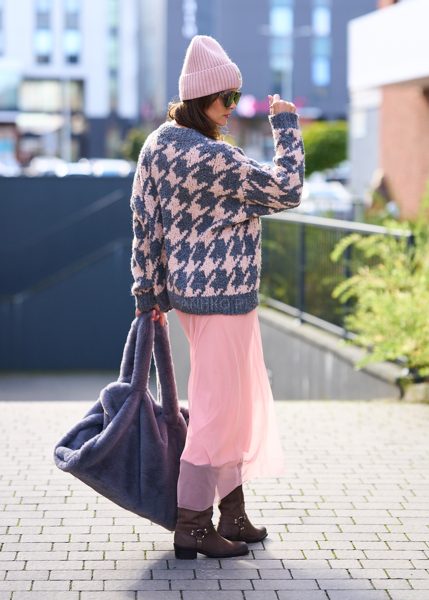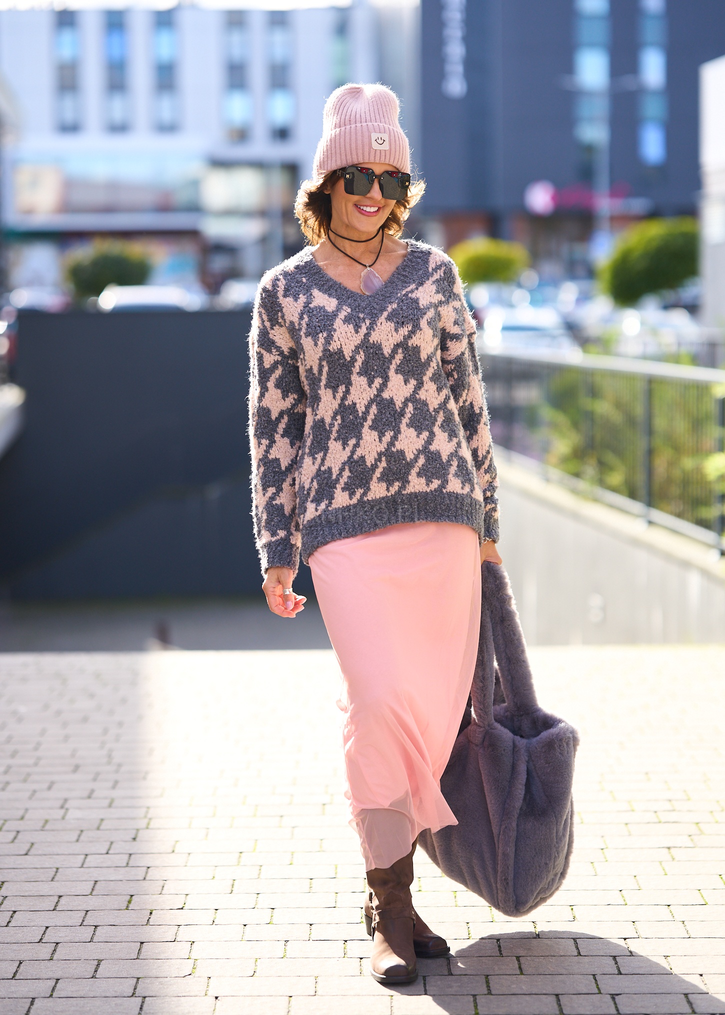 Sweter Polina-Miękki sweter w dużą pepitkę z dekoltem V-neck w połączeniu pudrowego różu i szarości to modny i przyjemny dla oka element garderoby.