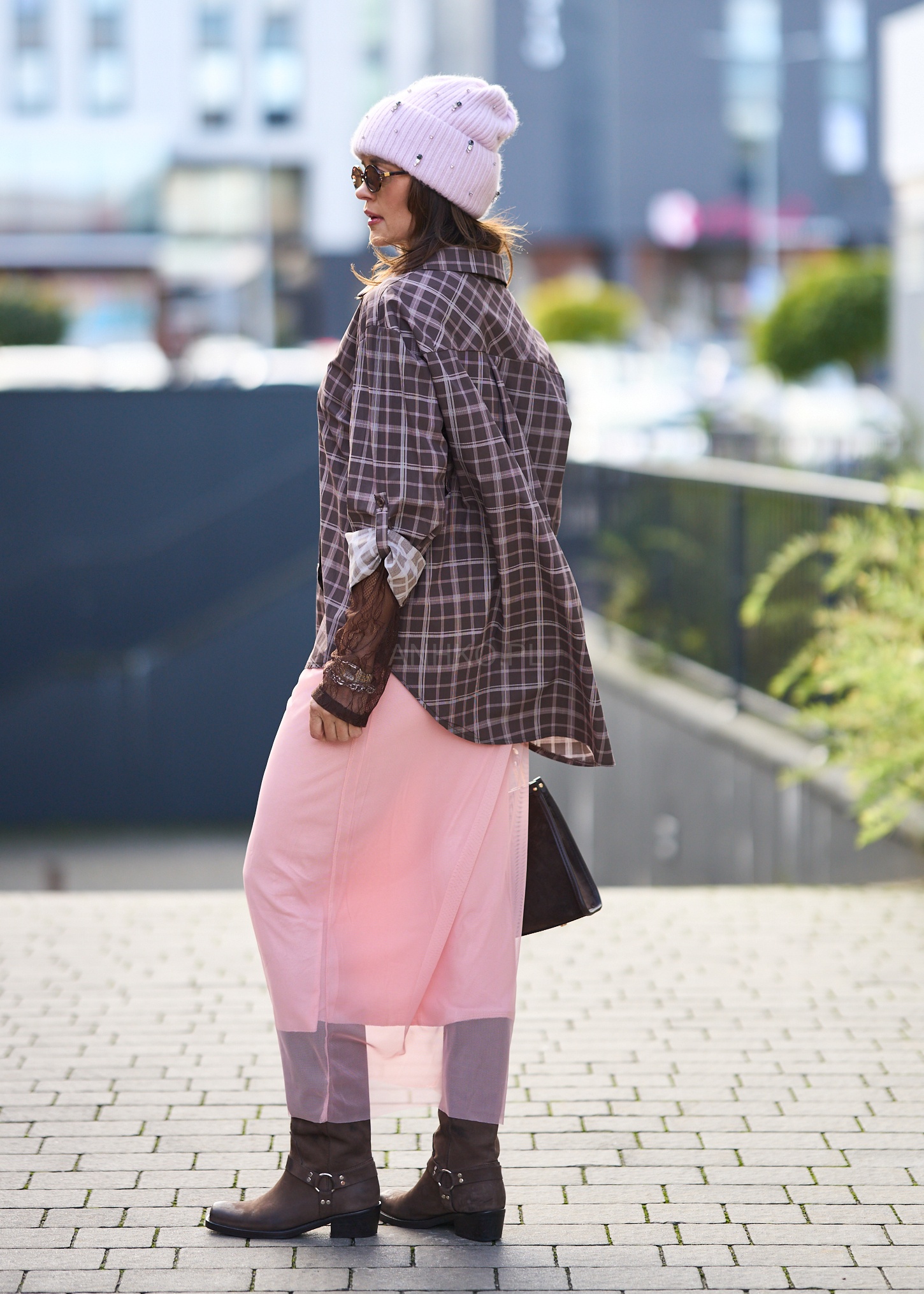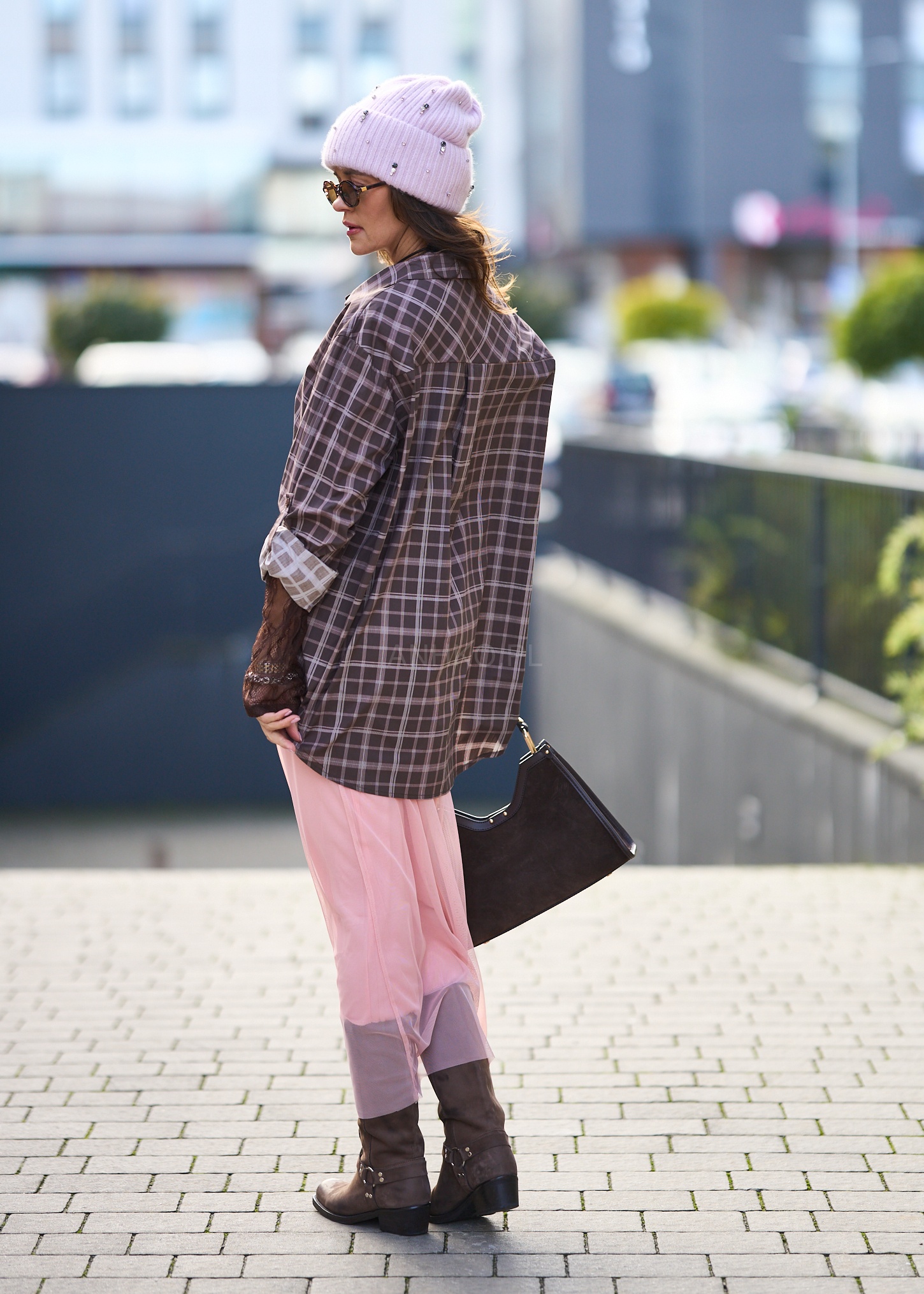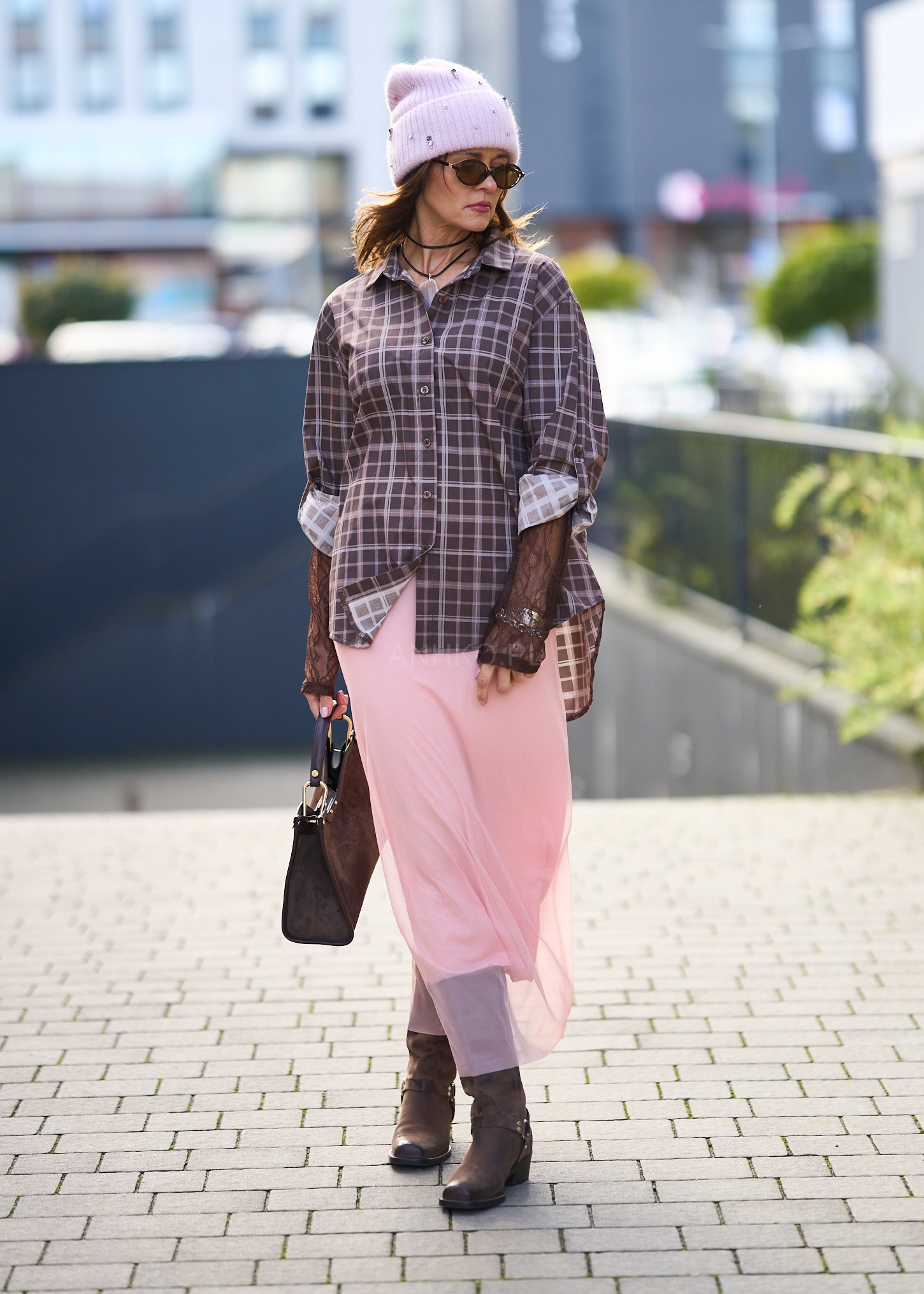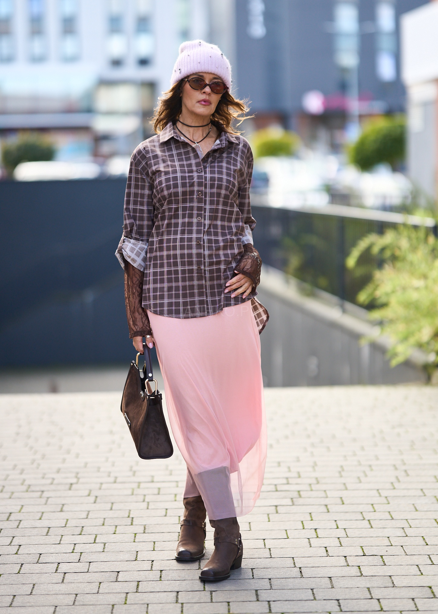 Koszula Inora Brązowa - Stylowa koszula w kratę o luźnym kroju z wyjątkowym detalem – koronkowym wykończeniem przy mankietach. Wykonana z miękkiej bawełny, idealna do codziennych i eleganckich stylizacji. Subtelne detale dodają jej kobiecego charakteru.