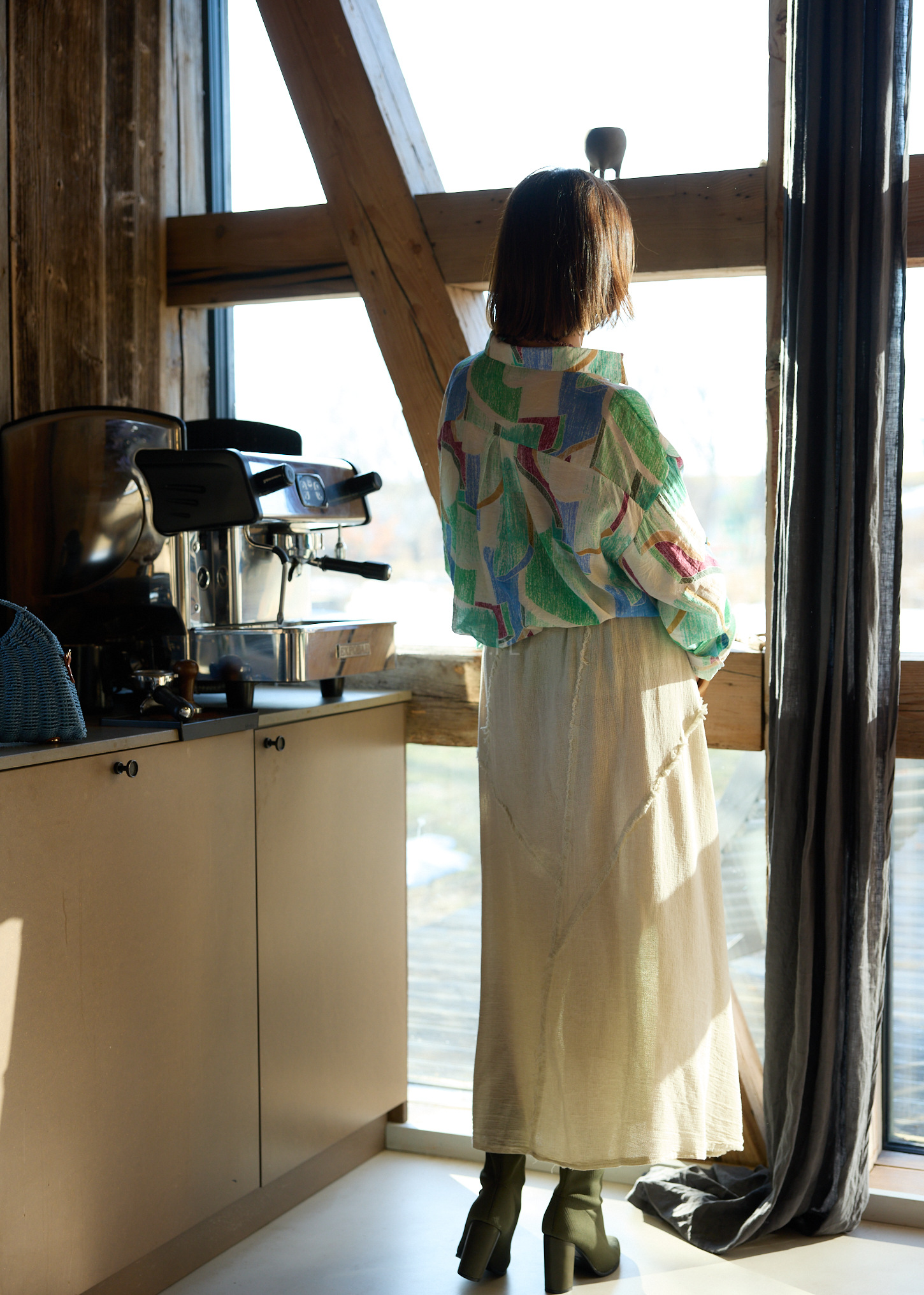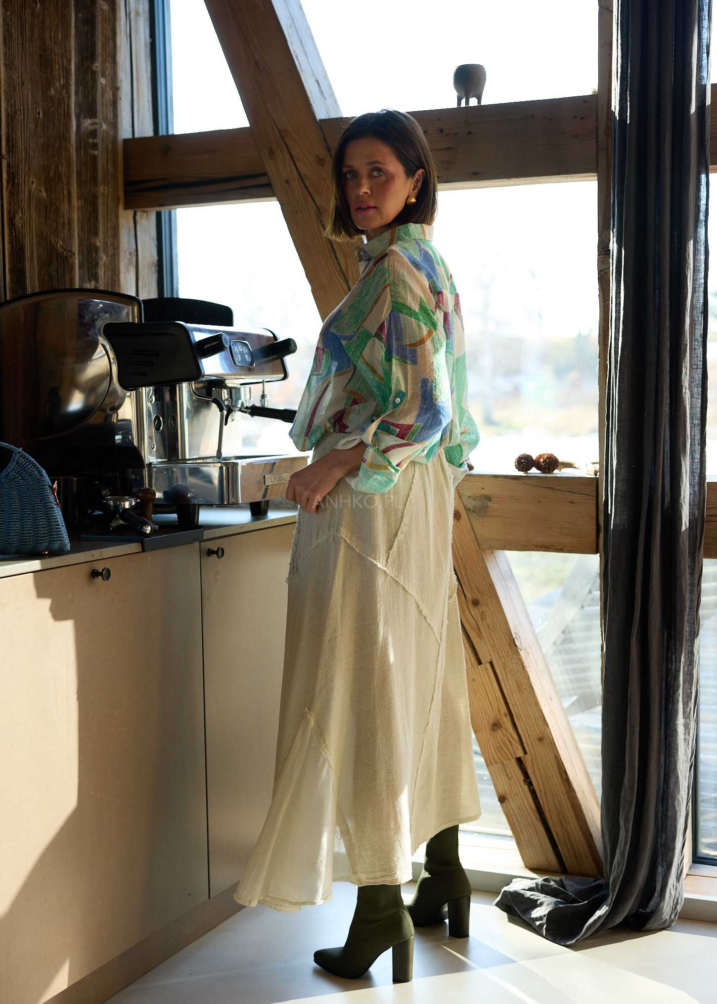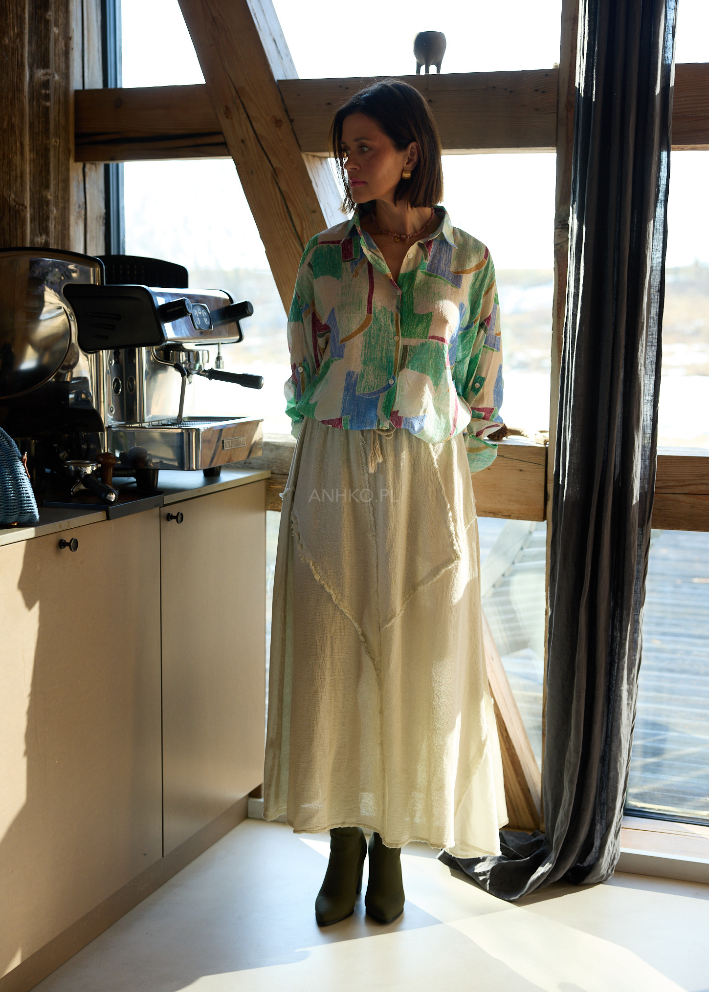Model wyróżniają surowe, dekoracyjne przeszycia, które nadają całości wyrazistego charakteru i modowego twistu. Naturalna tkanina oraz praktyczne kieszenie sprawiają, że to idealna baza do stylizacji – od minimalistycznych po bardziej artystyczne zestawy.