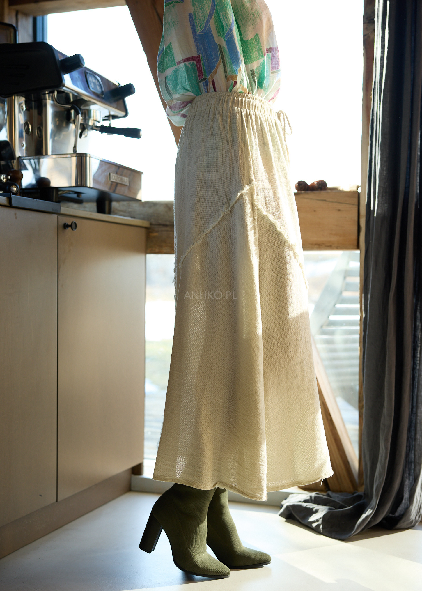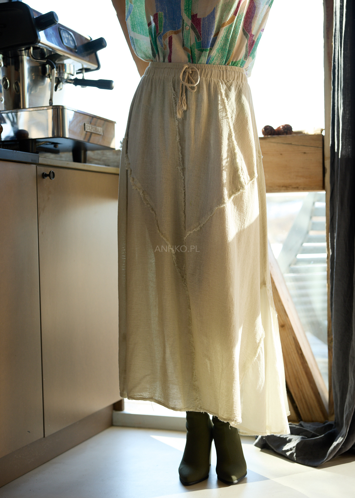Ta spódnica midi o lekko rozkloszowanym kroju pięknie pracuje w ruchu, subtelnie układając się na sylwetce i zapewniając pełną swobodę. Elastyczna talia z regulacją na sznurek dopasowuje się do figury, podkreślając komfort noszenia bez kompromisów w stylu.