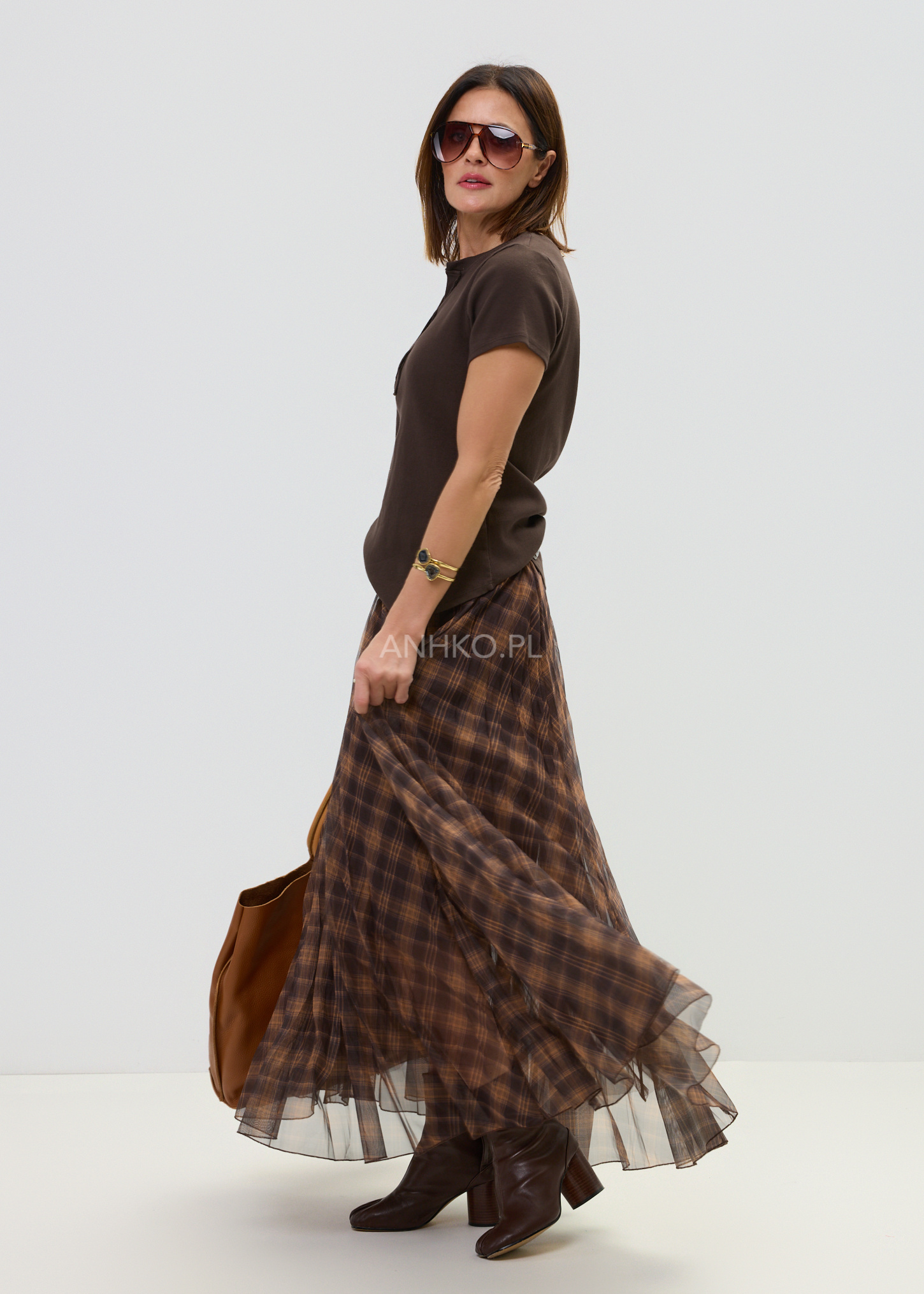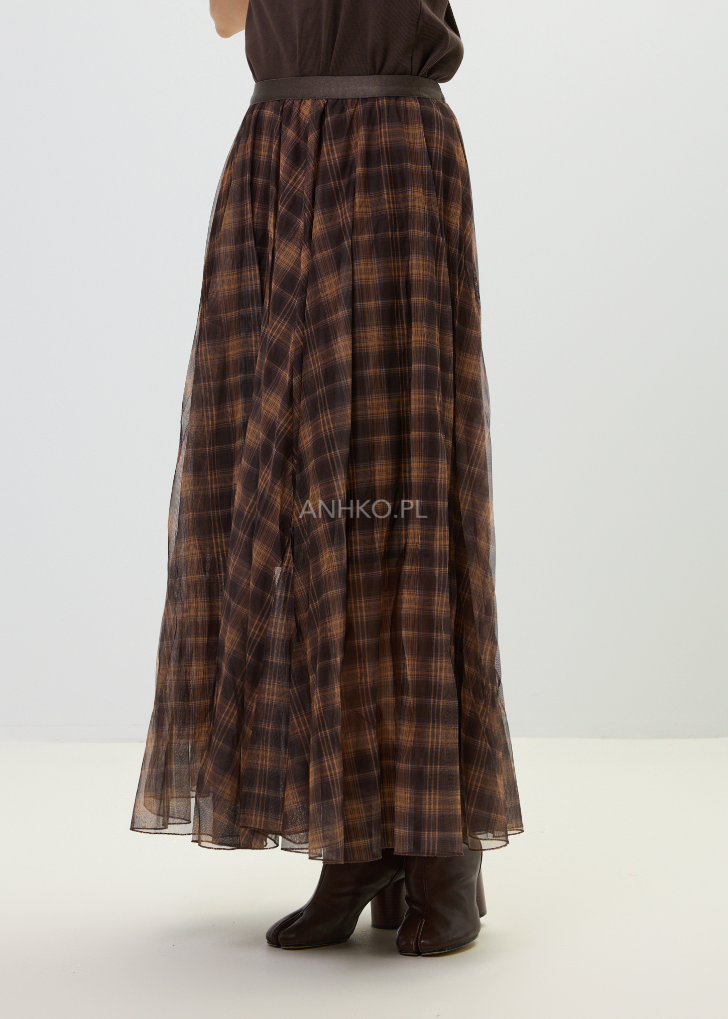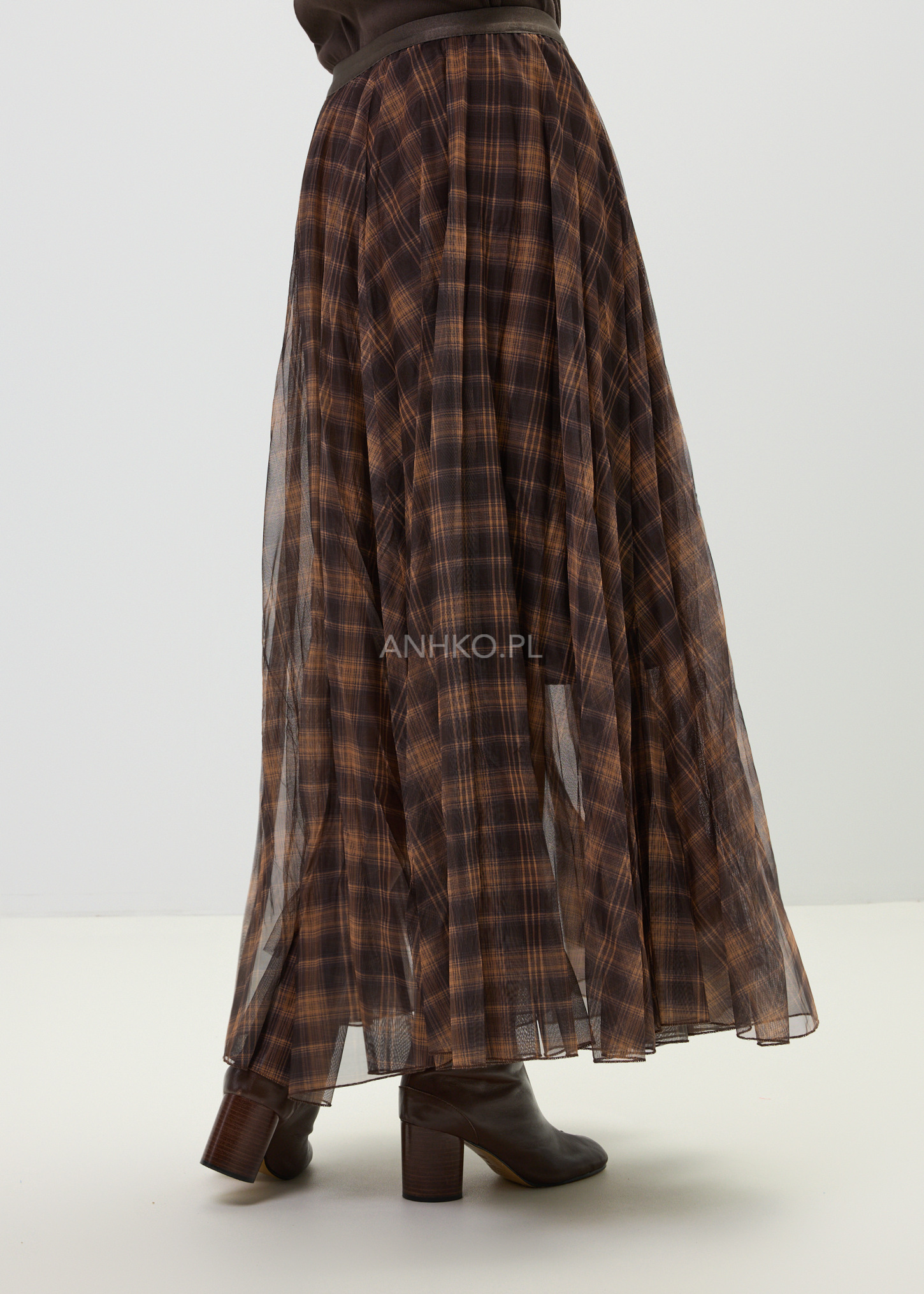Ta spódnica maxi o rozkloszowanym kroju pięknie układa się na sylwetce i subtelnie pracuje w ruchu. Lekka, półtransparentna warstwa zewnętrzna w ponadczasową kratę w odcieniach brązu i karmelu tworzy elegancki, a jednocześnie swobodny efekt. Dzięki szerokiej, elastycznej talii model komfortowo dopasowuje się do figury, podkreślając jej proporcje bez uczucia ucisku.